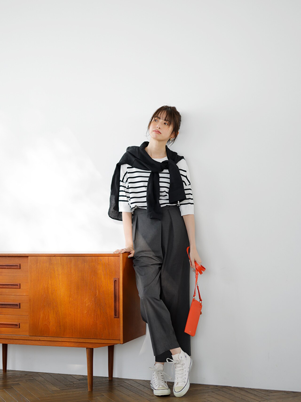 ONではコンパクトなシルエットのニットを、OFFではオーバーシルエットのボーダーニットTを。迷わず裾をインするだけで、ラップデザインが洒落見えを叶えてくれる。印象を変えずにON/OFF楽しめる。こんな定番待ってた!