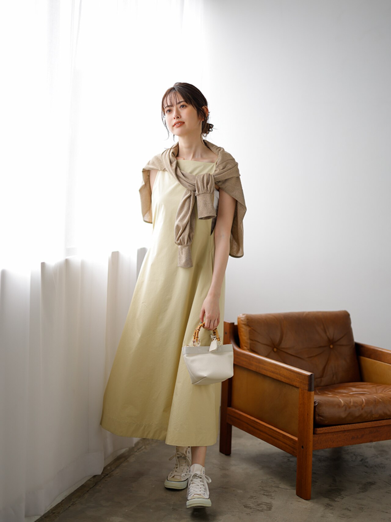 体が泳ぐリラクシーシルエットはそのまま着るだけで華やかさ抜群。露出は控えたいけれど、袖を通してしまうと野暮ったい…そんなキャミドレスタイルも、アクセ感覚でキラリニットを肩掛けで即解決。