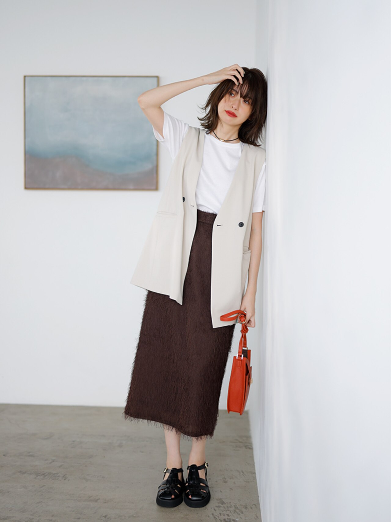 インパクトのあるフェザースカートとシンプルさが潔い白T。OFF服を大人に昇華させるのはエクリュカラージレのなせる技。色味を合わせてセットアップ見えさせれば、清涼感と清潔感あふれるON服の完成。