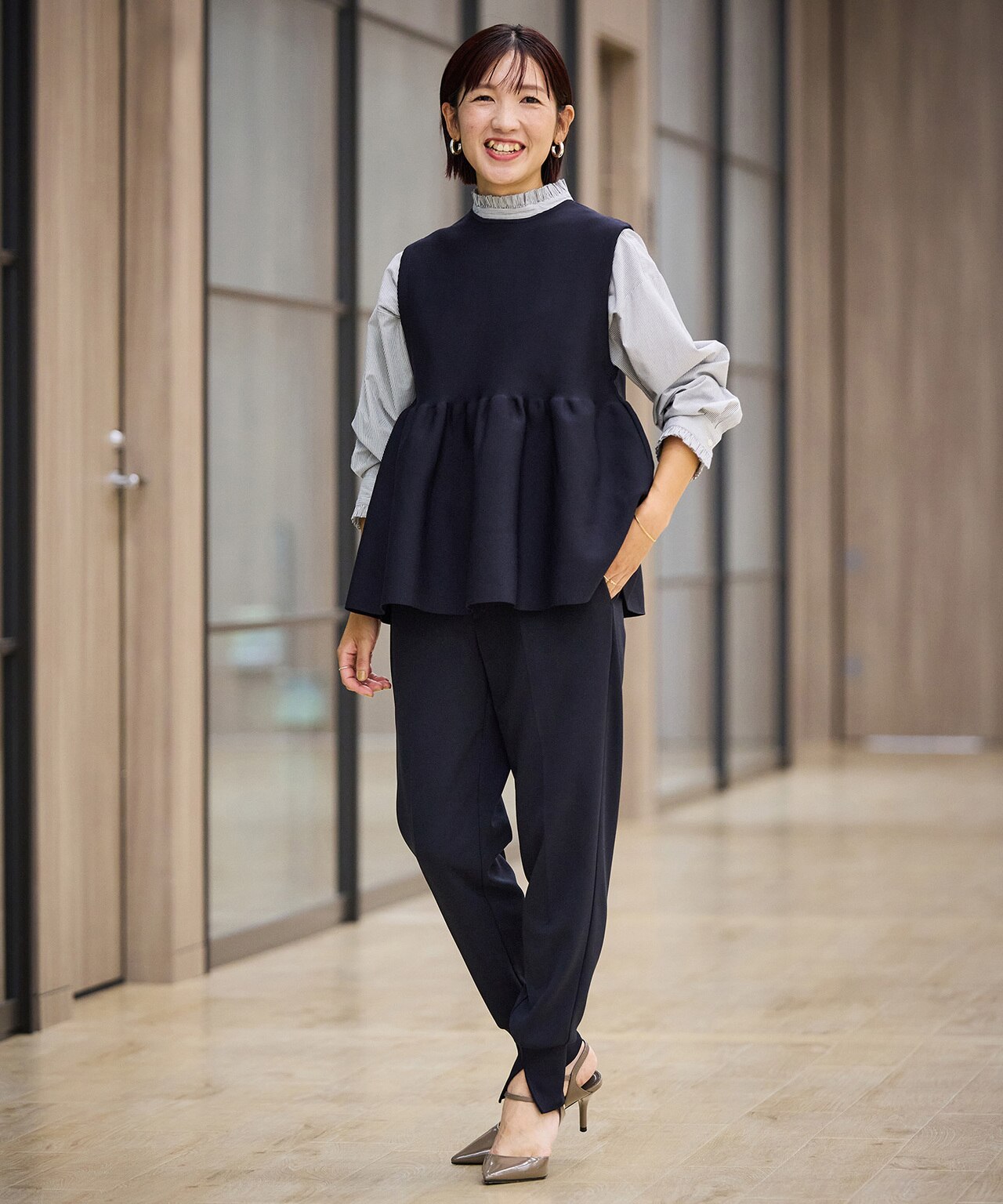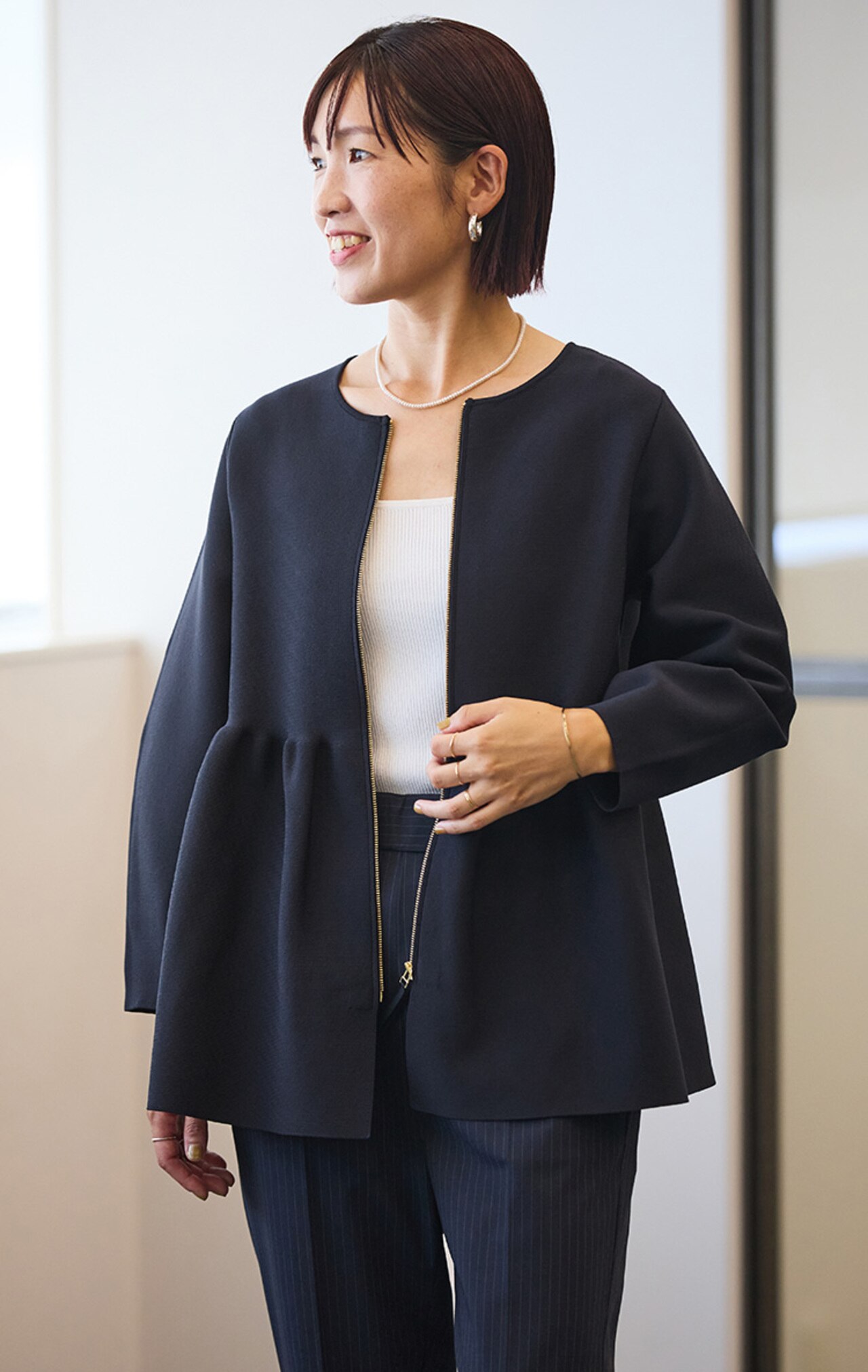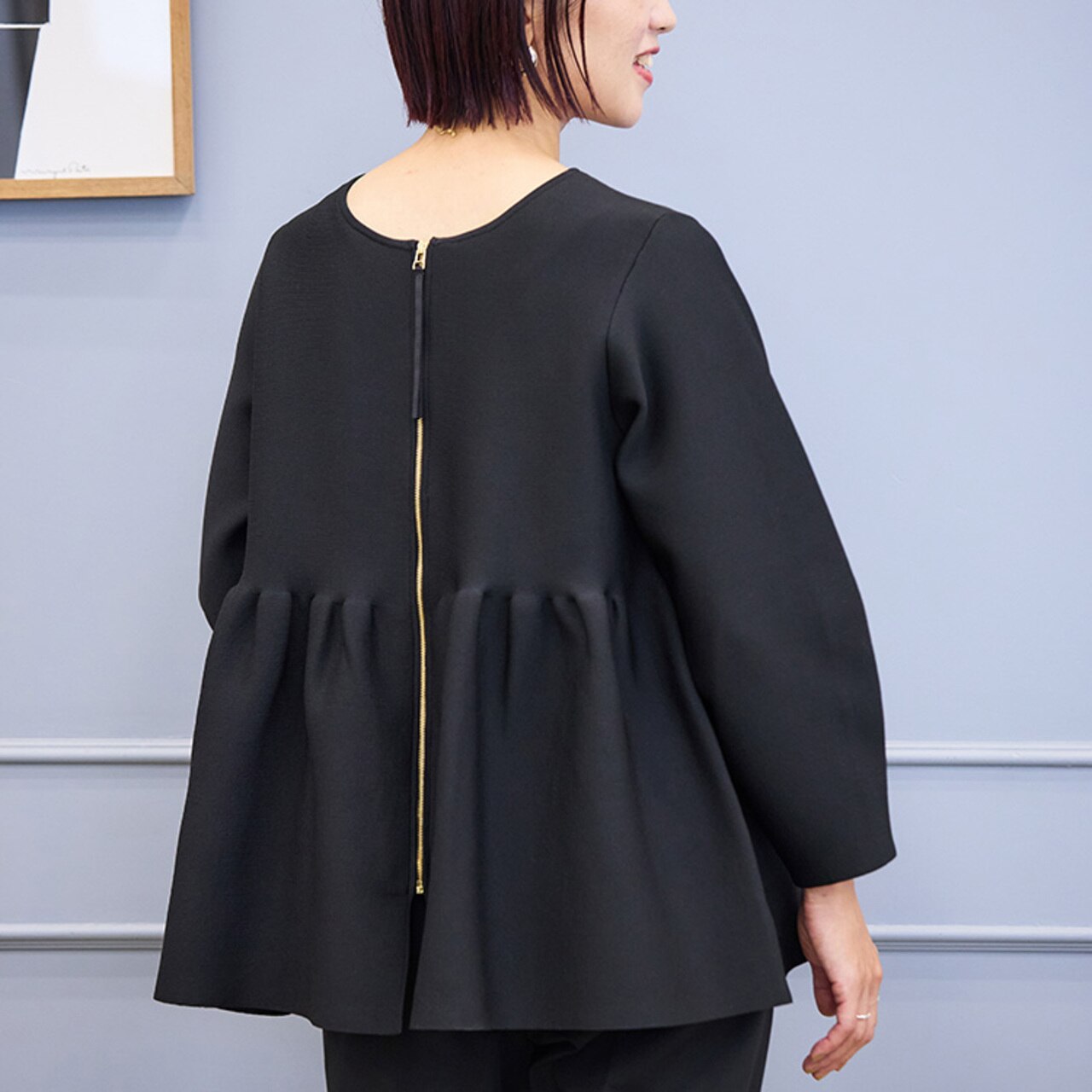 ジップを後ろに着用してプルオーバースタイルに。ボリュームスリーブや華やかな立体ペプラムでブラウス見えが叶います。お仕事にも学校行事にも対応できる、きちんと見えの万能スタイルの完成。