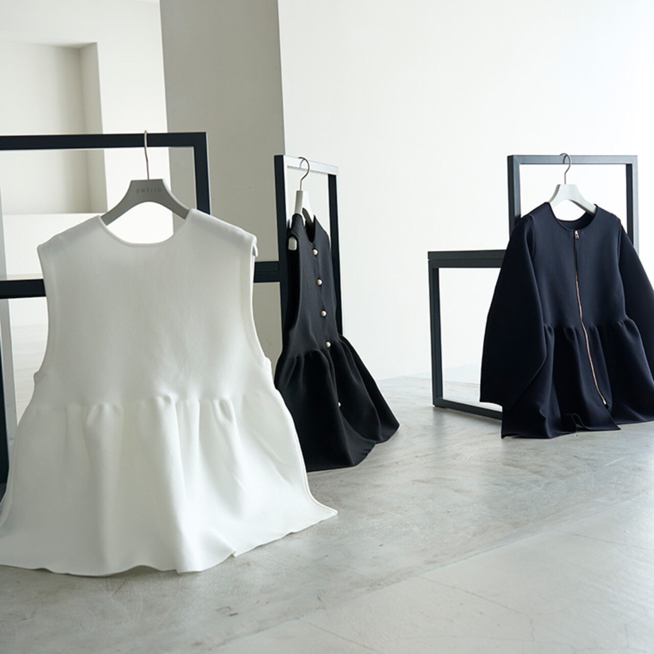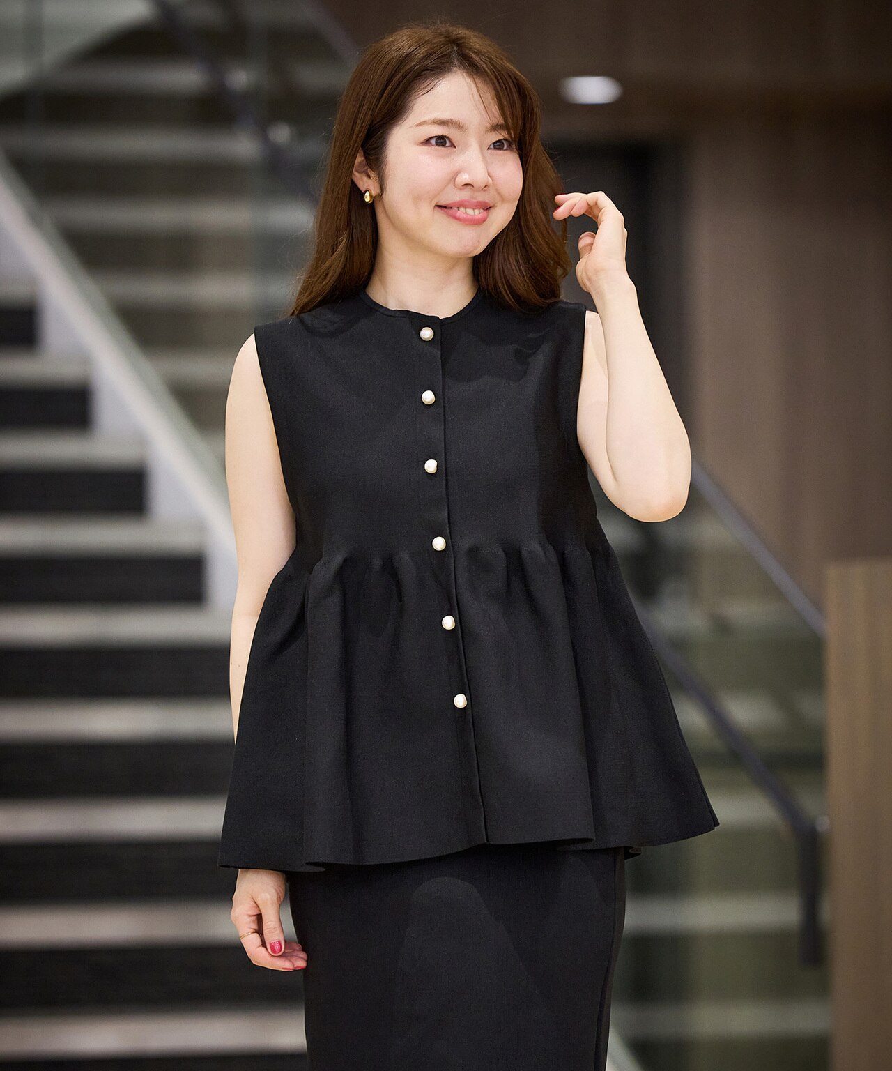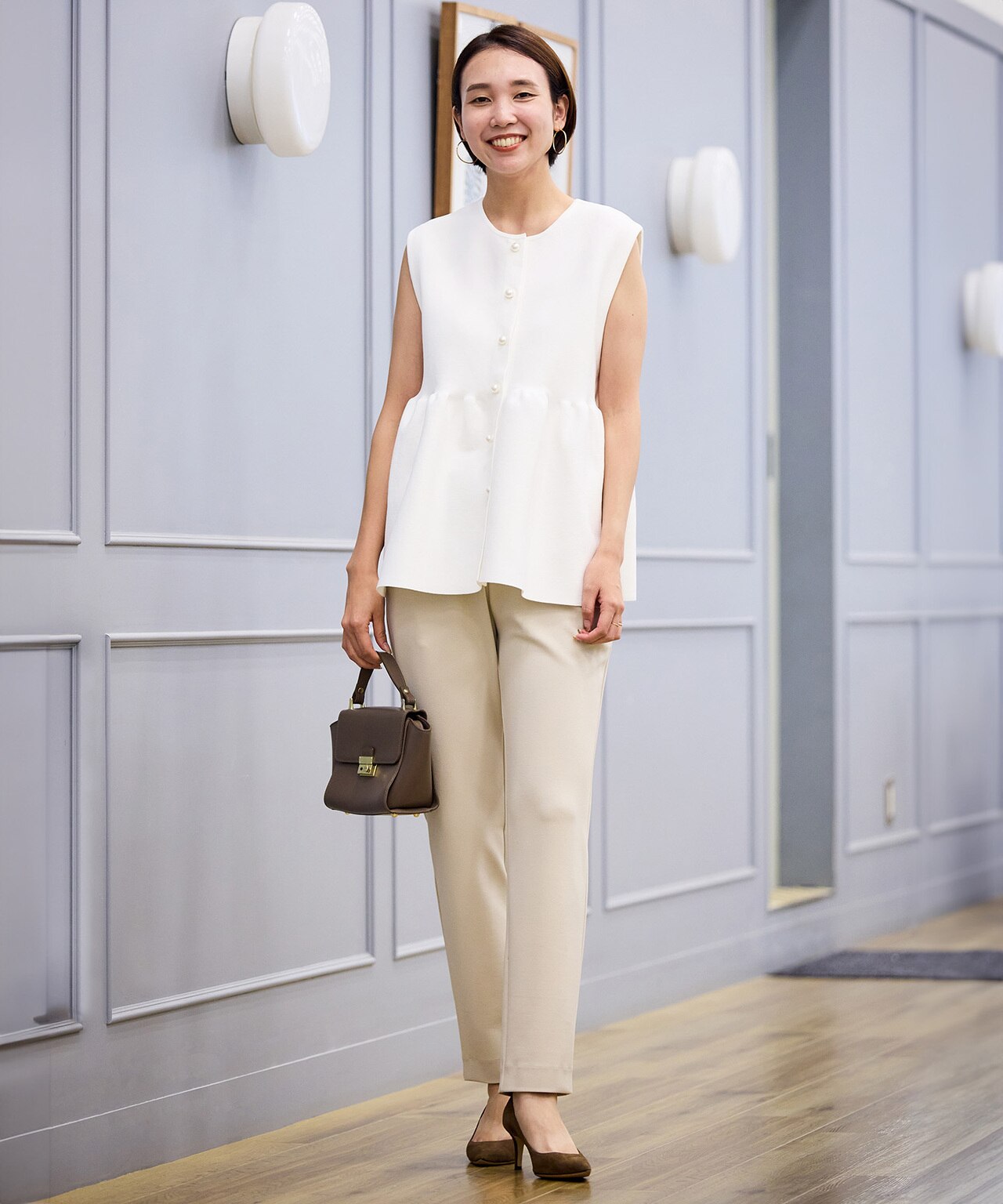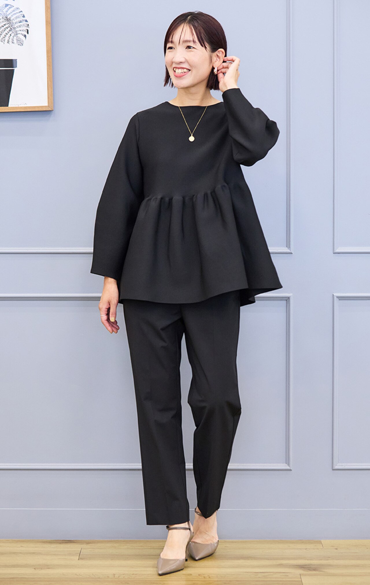 ジップを後ろに着用してプルオーバースタイルに。ボリュームスリーブや華やかな立体ペプラムでブラウス見えが叶います。お仕事にも学校行事にも対応できる、きちんと見えの万能スタイルの完成。