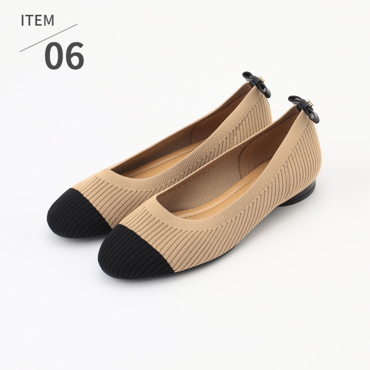 伸縮性のあるニット素材を使ったフラットシューズ。まるで履いていないようなフィット感とリラックス感がポイント。リボンディティールのバックデザインがワンポイントに。