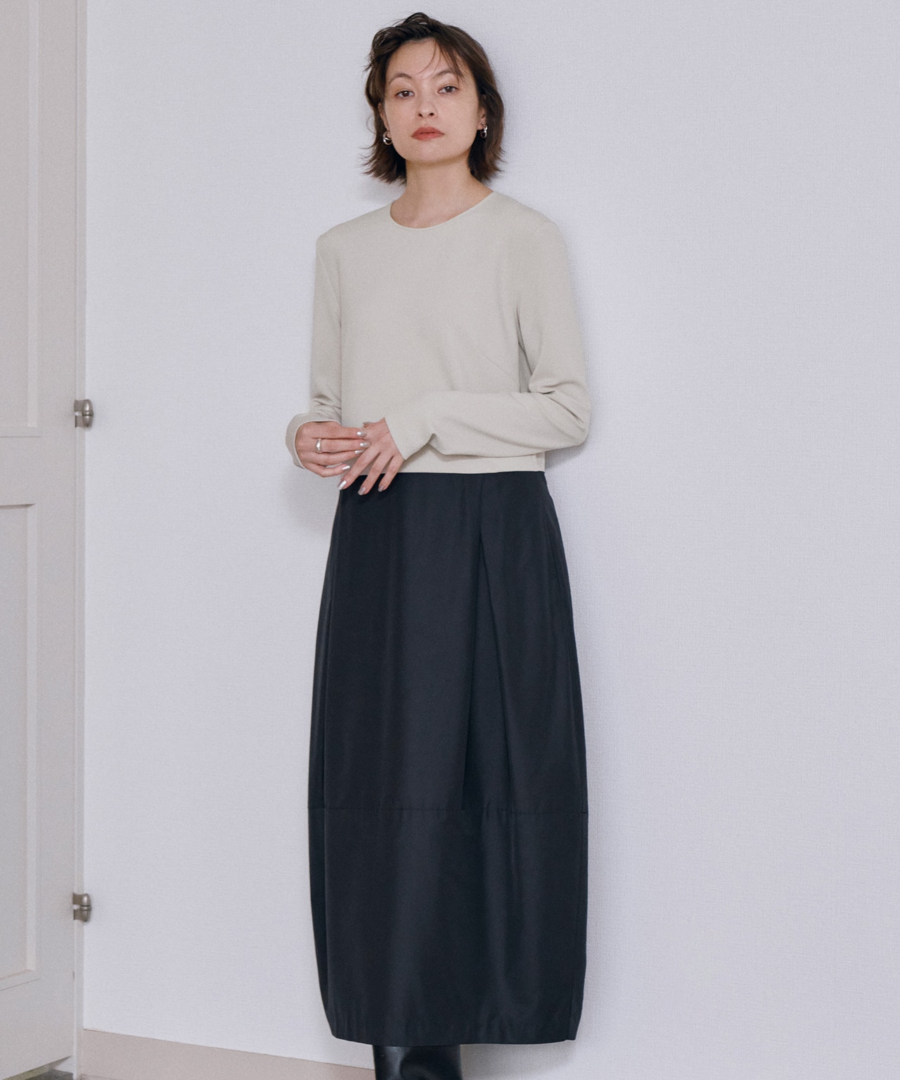 素材はやわらかいものより、ボディラインを拾わないハリ感のあるものがおすすめ。タイトなものでもハリ感があれば体の形をうまく隠しごまかしてくれます。