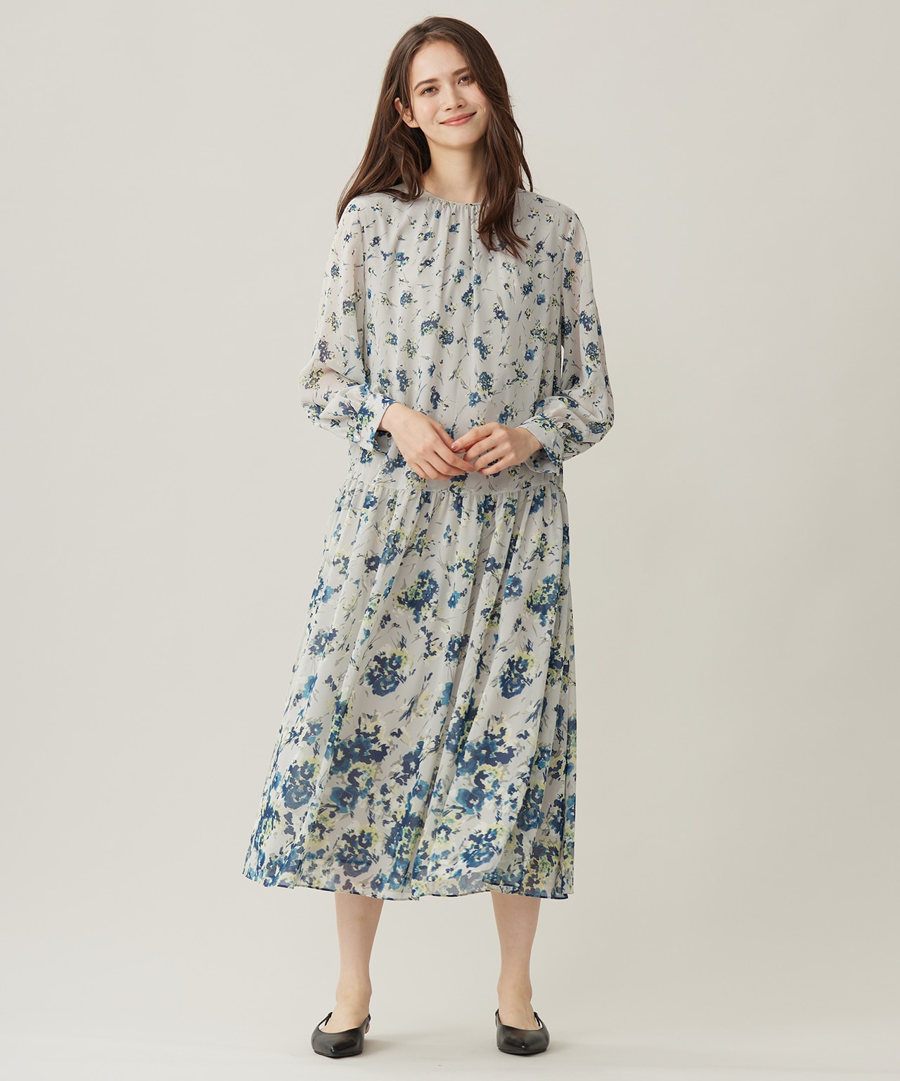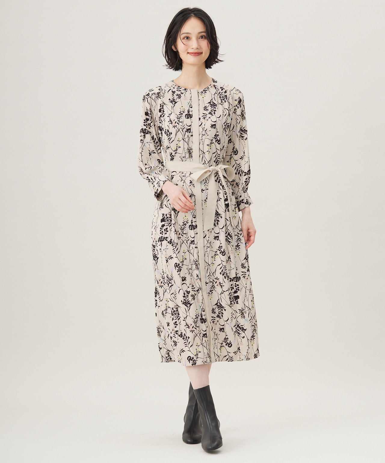 中央の縦プリーツと適度なハリ、ウエストマークで着膨れナシ【カタログ掲載・洗える】ライトサテン ワンピース【カタログ掲載・洗える】ライトサテン ワンピース自由区 L¥39,160(税込)