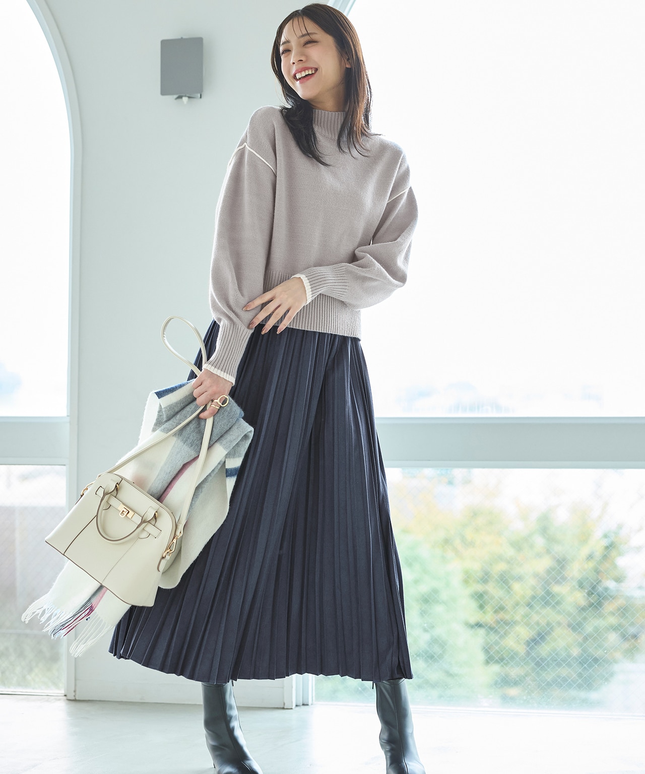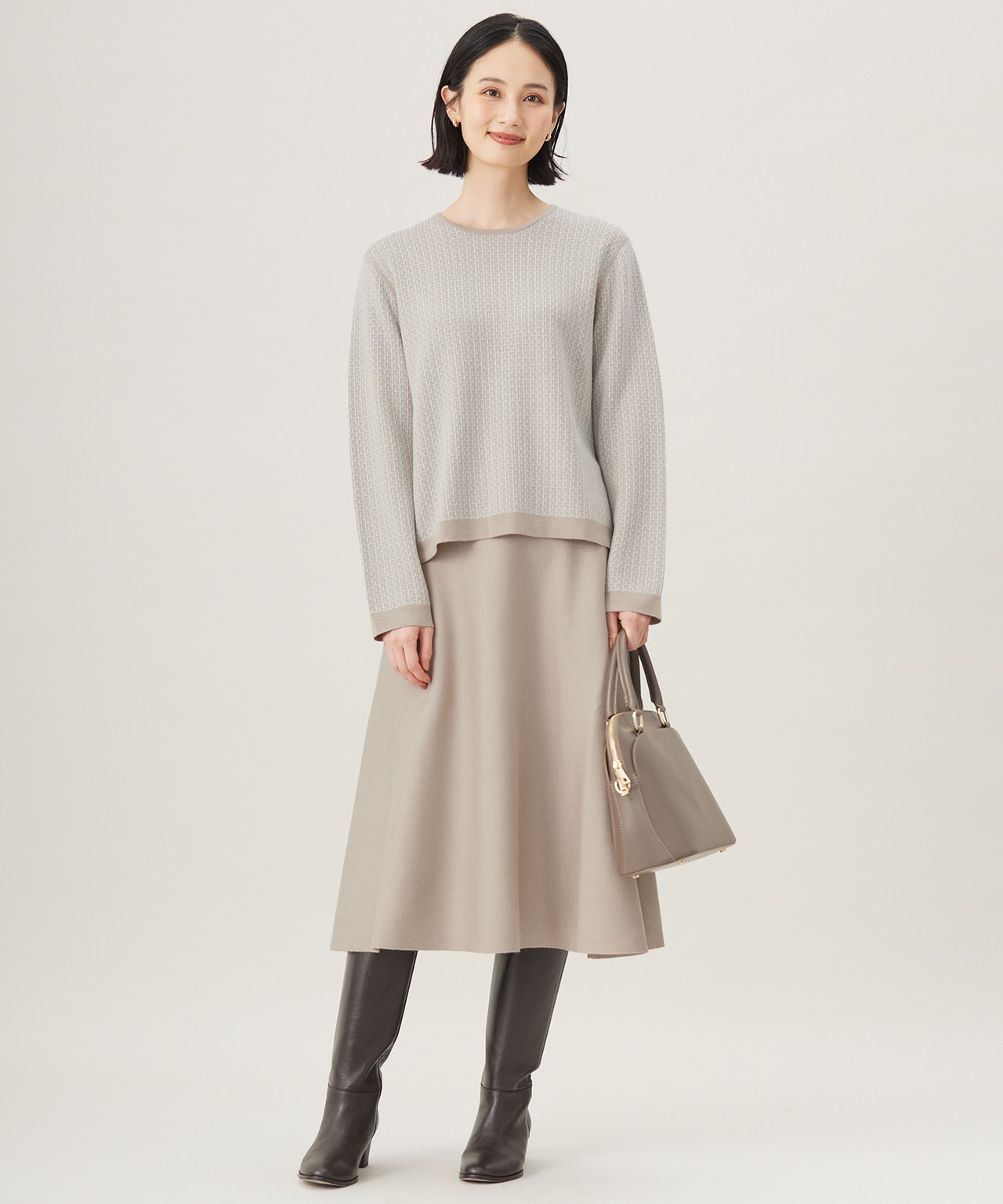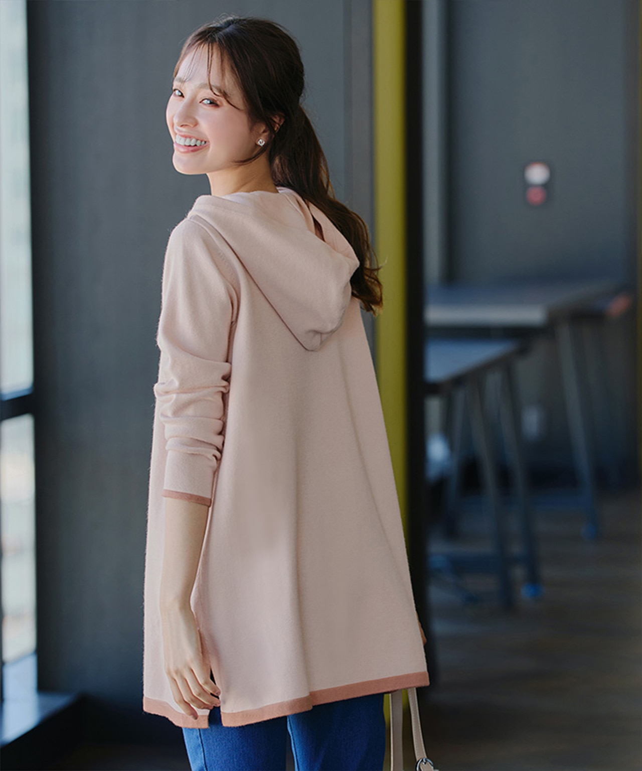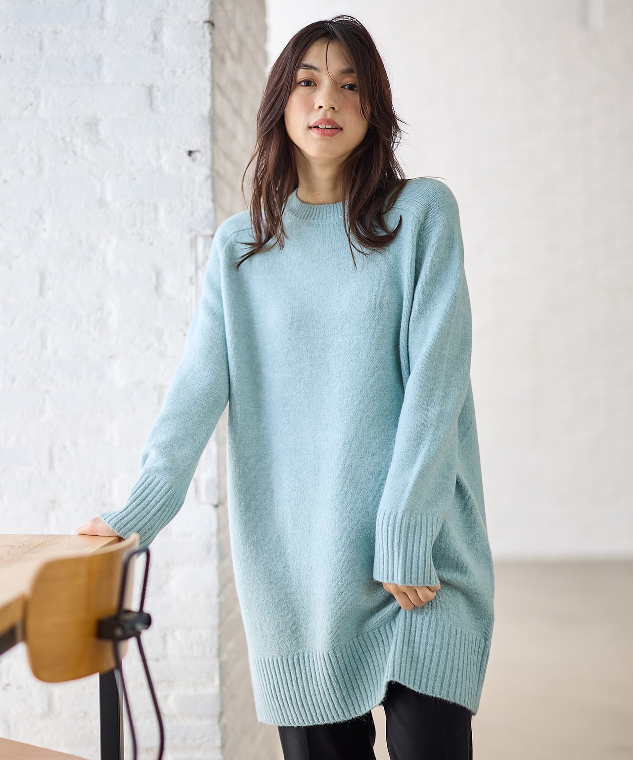 立ったりしゃがんだり。大忙しな帰省時のお手伝いシーン。長め丈のニットが使い勝手がいい!1枚で華やかなカラーを選べばワンツーコーデでも完成度UP。手洗いも可能なニットと魅力的なプライスで活動的になれちゃうニットです。
