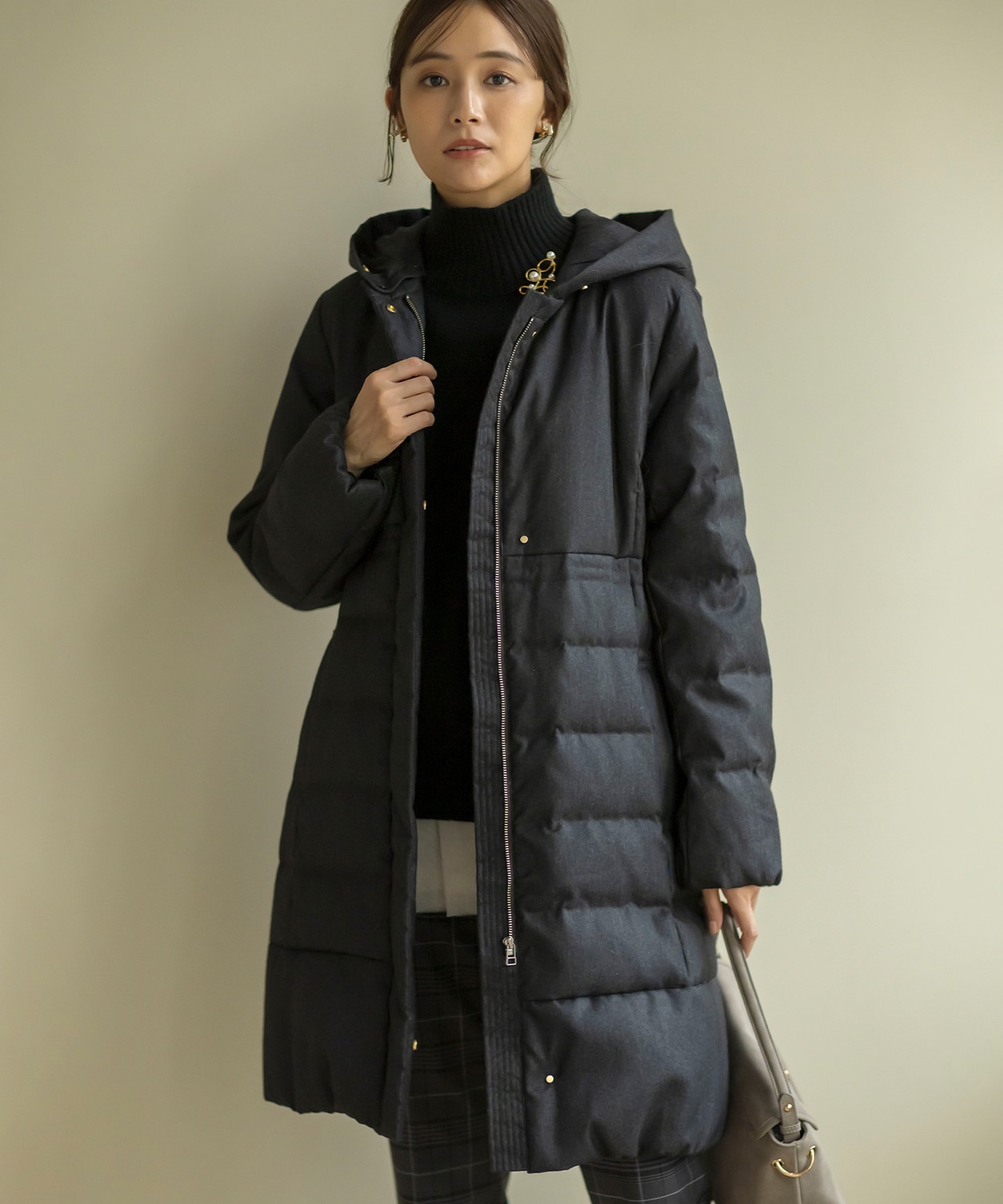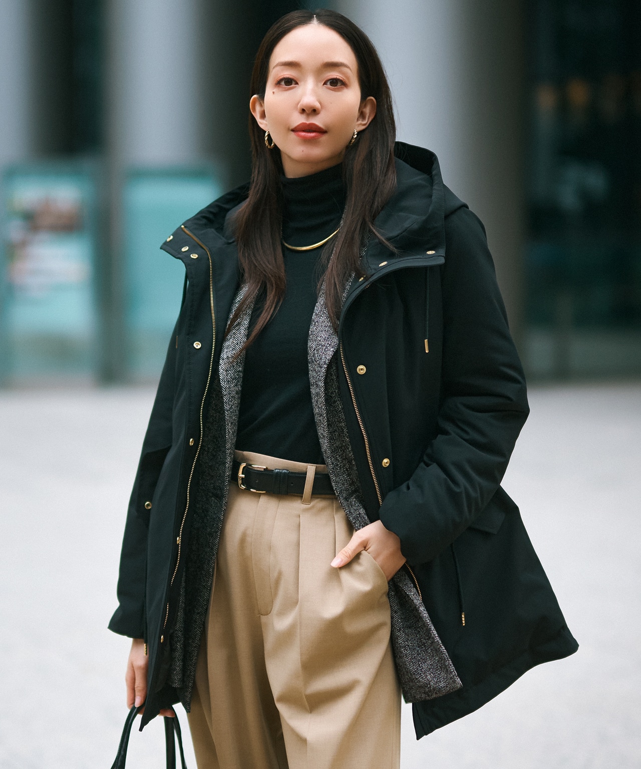 こちらの黒アウターは、ゴールドの金具のアクセントがエレガントな大人のミリタリーコート。1年で一番寒くなる時期だから、温かさは本気で守りたい!その気持ちに応えるアウターがこちら。しっかりボリュームのあるダウンが内蔵されていて、すっきり見えを裏腹に温かさを約束。大きなポケットがあるのも帰省では高ポイント。黒ならカジュアルすぎず様々なシーンの相棒に。