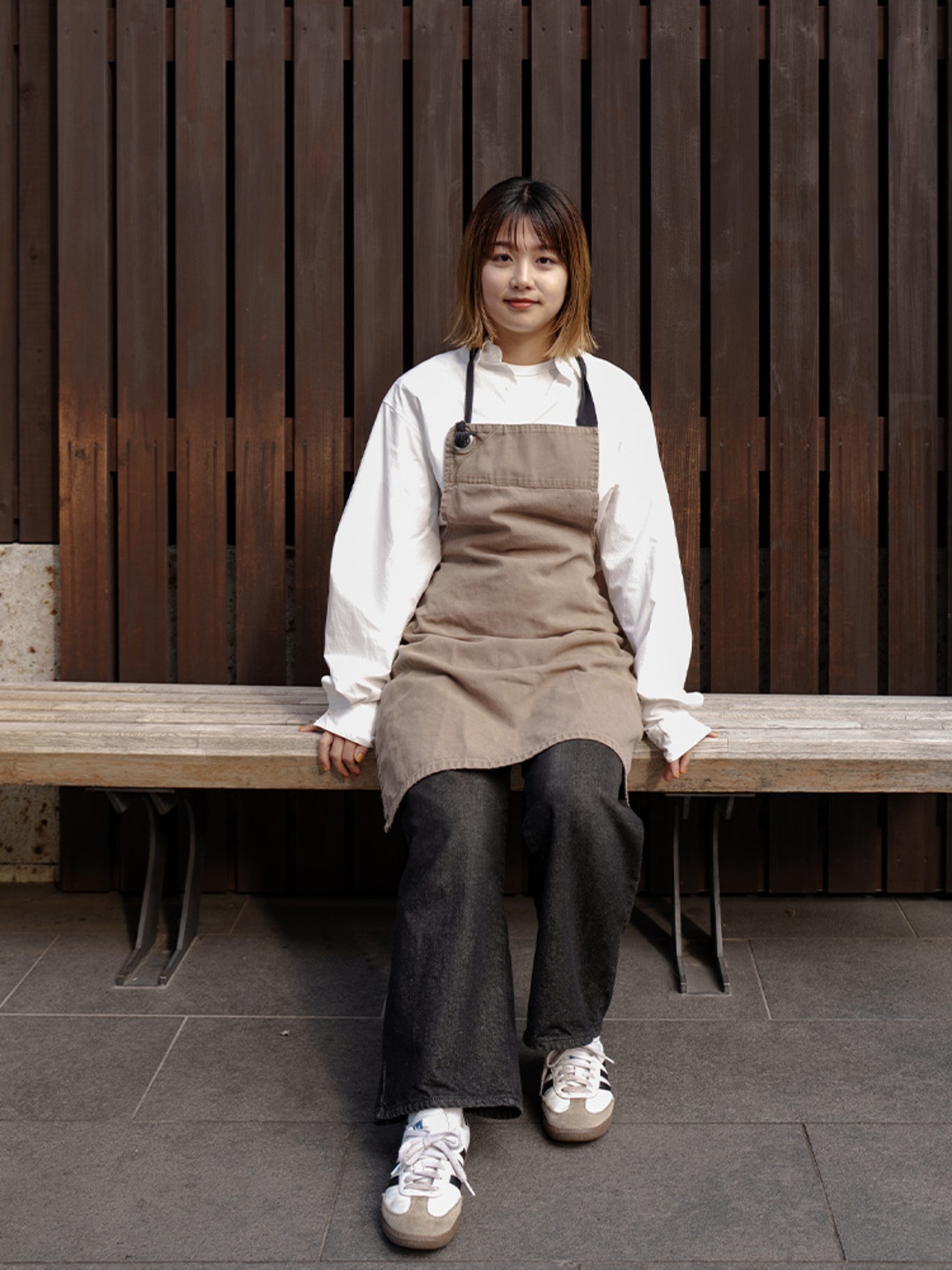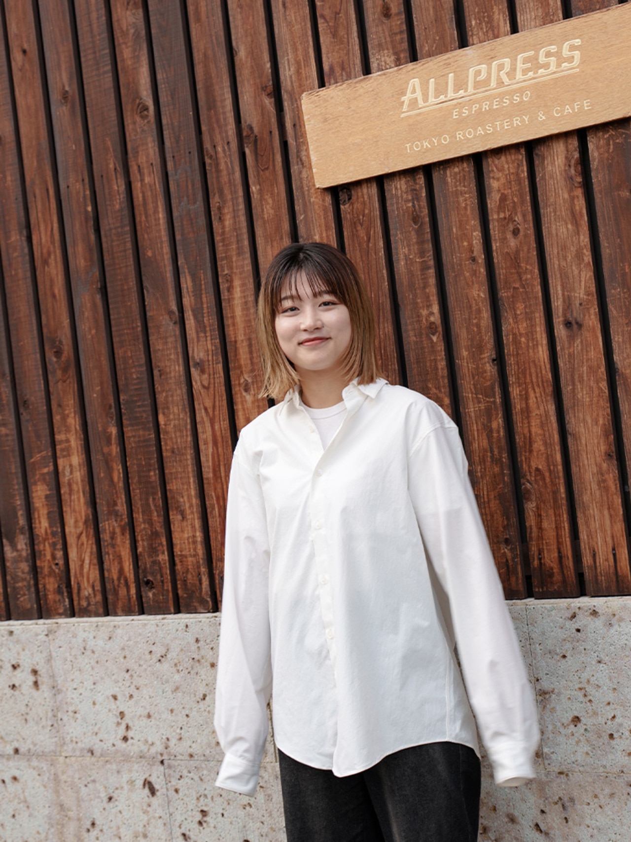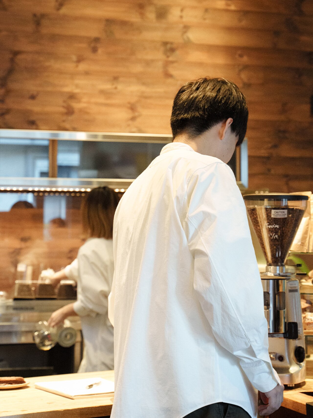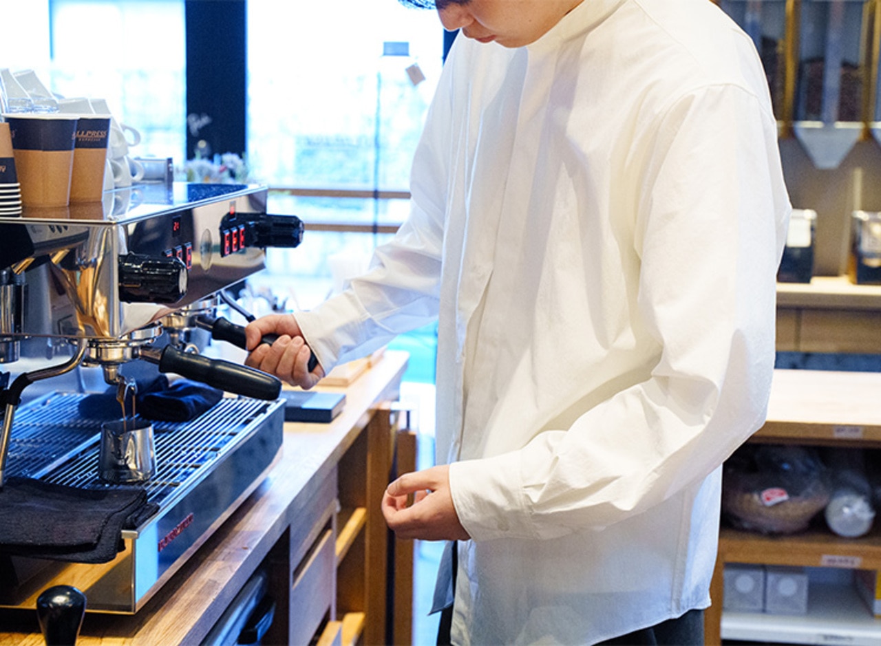 もうコーヒーのシミも怖くない!?動きやすく洗濯しやすいアンフィーロの白シャツを東京・清澄白河のコーヒーショップ『オールプレス・エスプレッソ』のバリスタ2名が着こなしました。