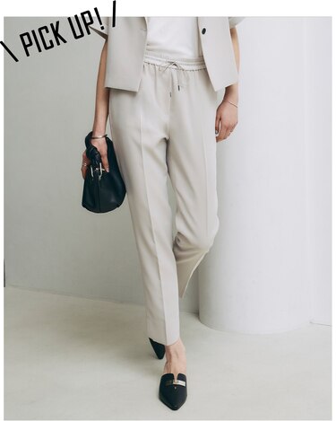 センタープレスで脚を綺麗に見せてくれるテーパードパンツ。ウエストは総ゴムのドロストデザインで、ストレスフリーに穿けるのもポイントです。同素材シリーズとのセットアップ使いもおすすめ。
