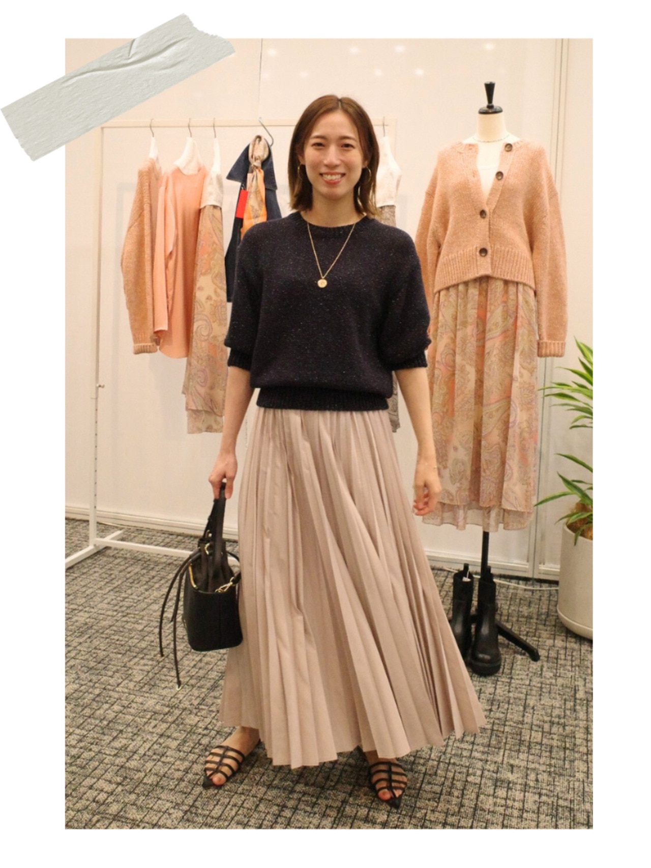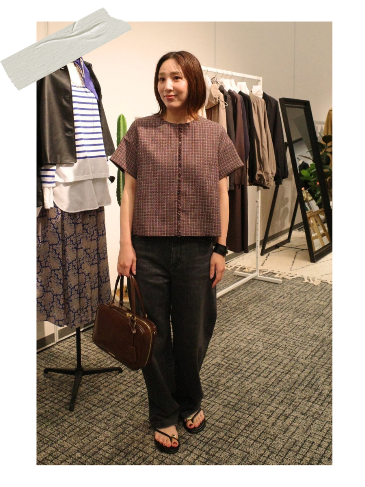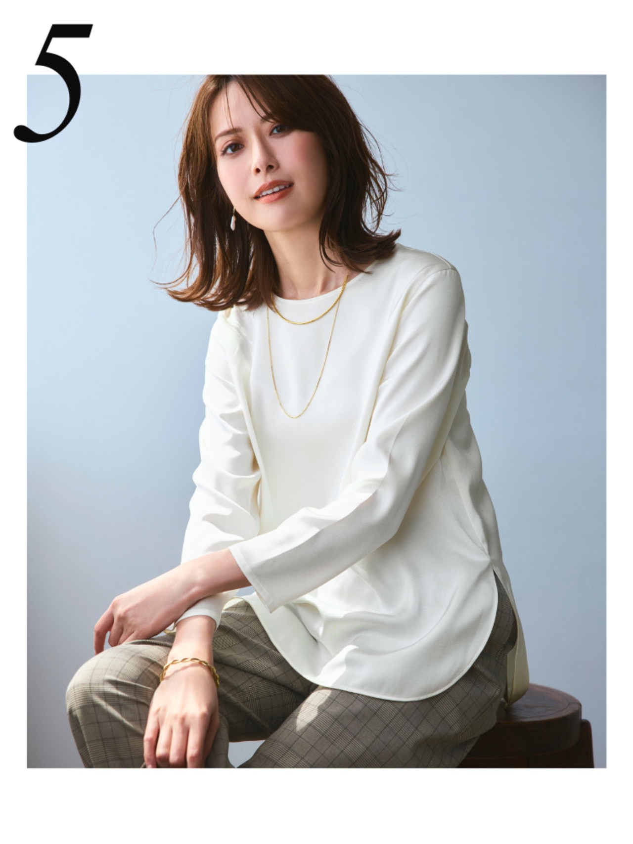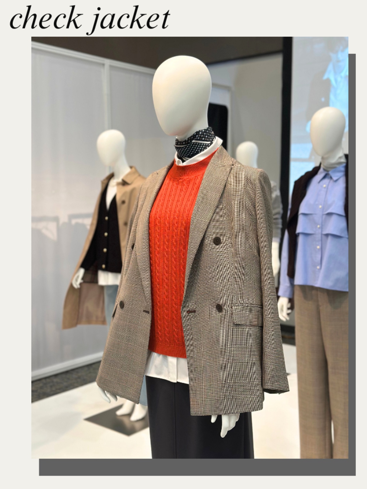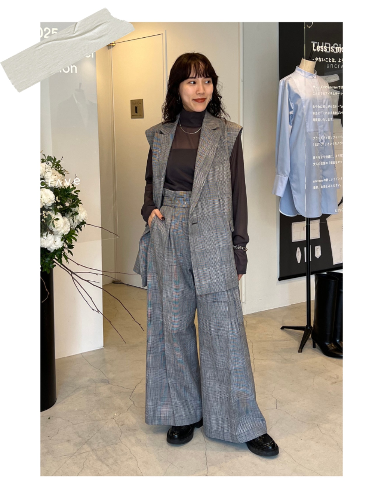 毎日の着こなしに迷う秋こそ、素材と柄で悩みを解消!透け感のある長袖トップスとチェック柄セットアップが、秋の強い味方に。(企画担当・160cm)