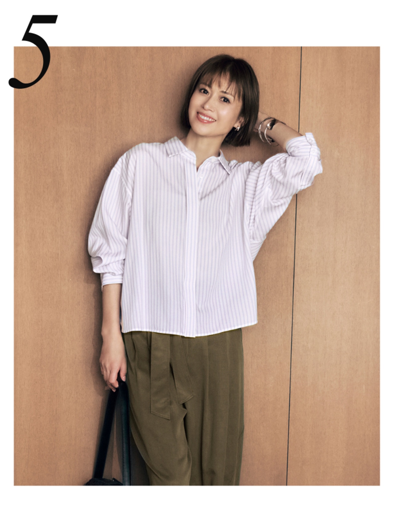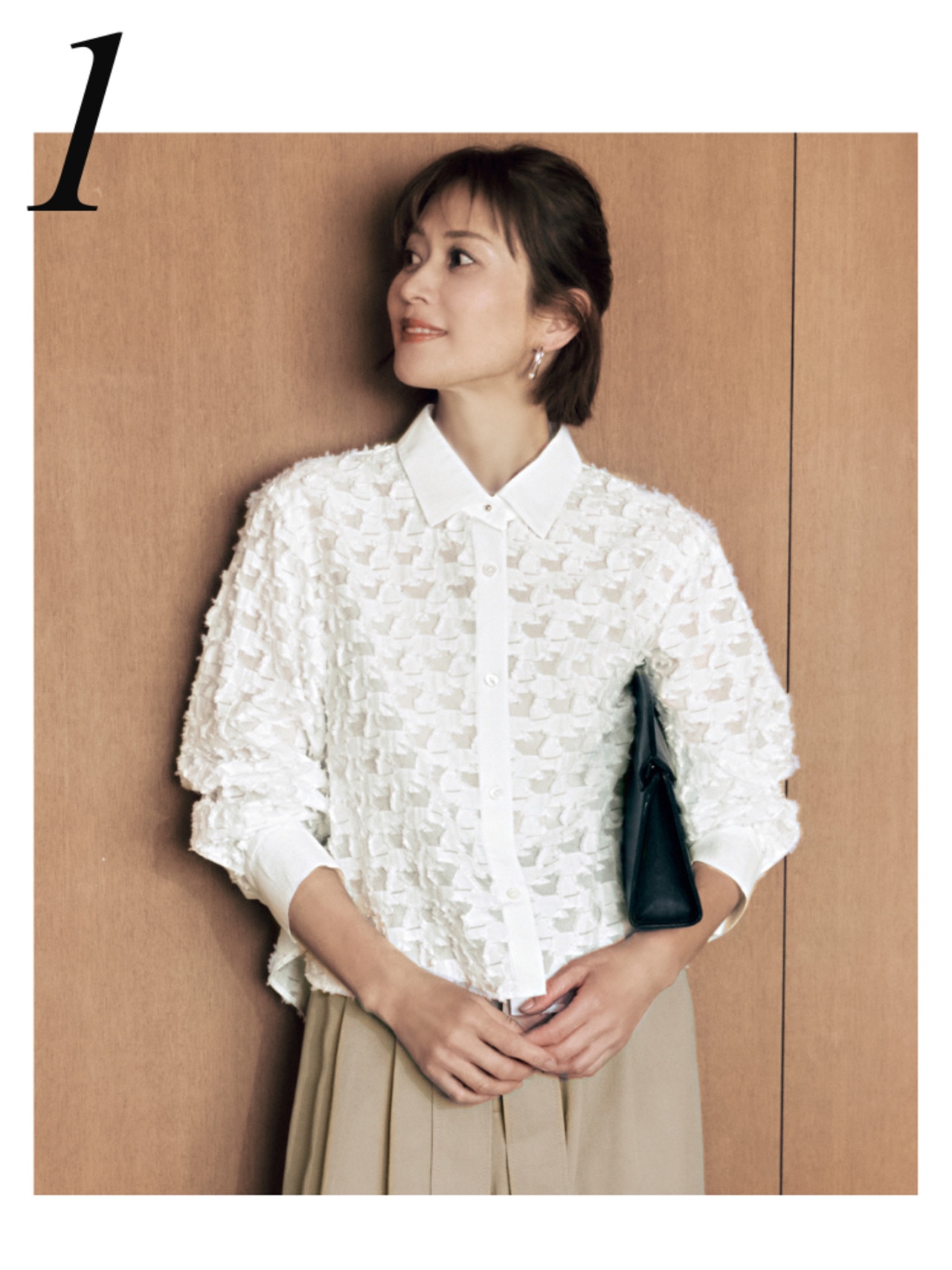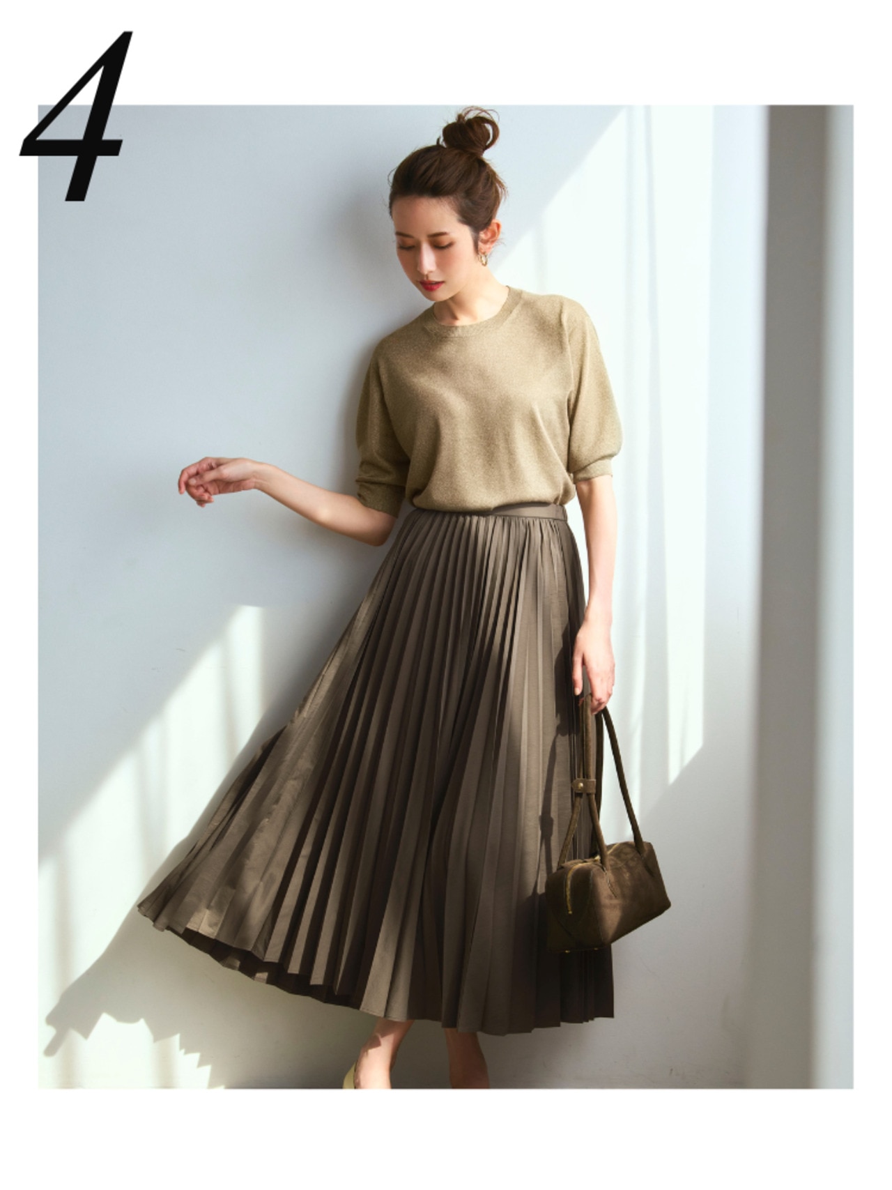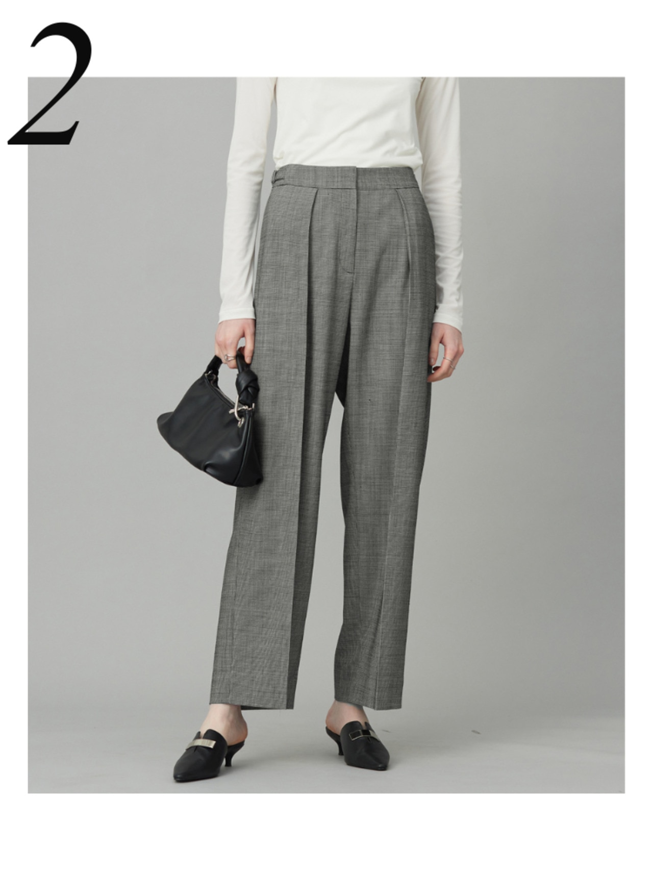 毎日の着こなしに迷う秋こそ、素材と柄で悩みを解消!透け感のある長袖トップスとチェック柄セットアップが、秋の強い味方に。(企画担当・160cm)