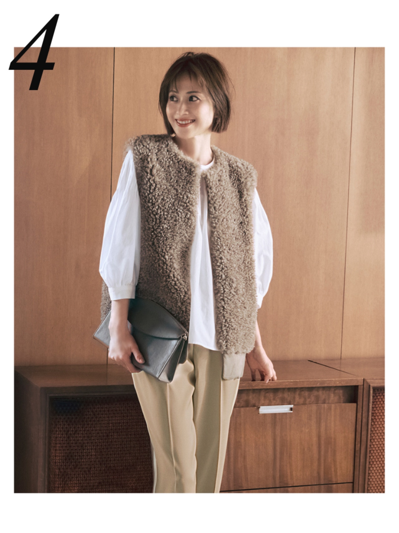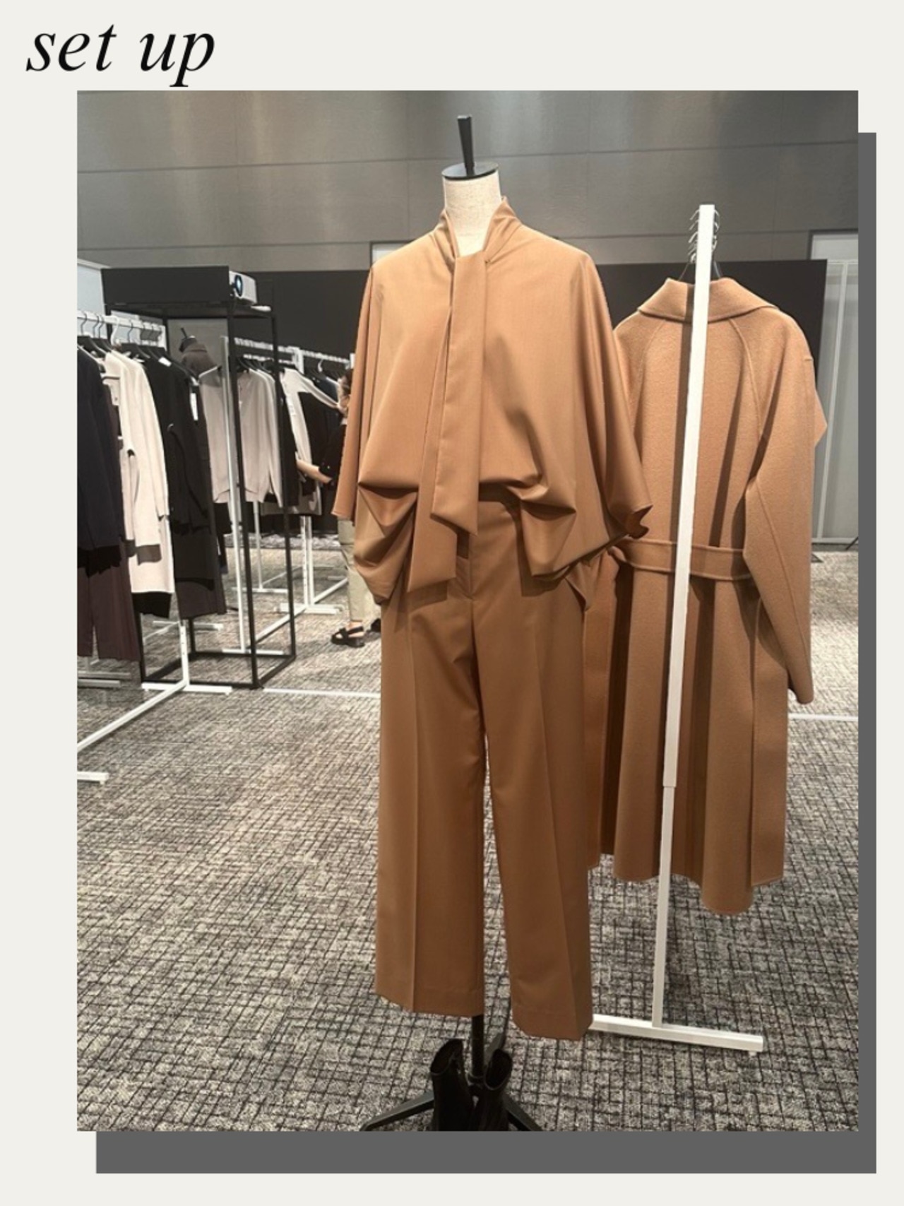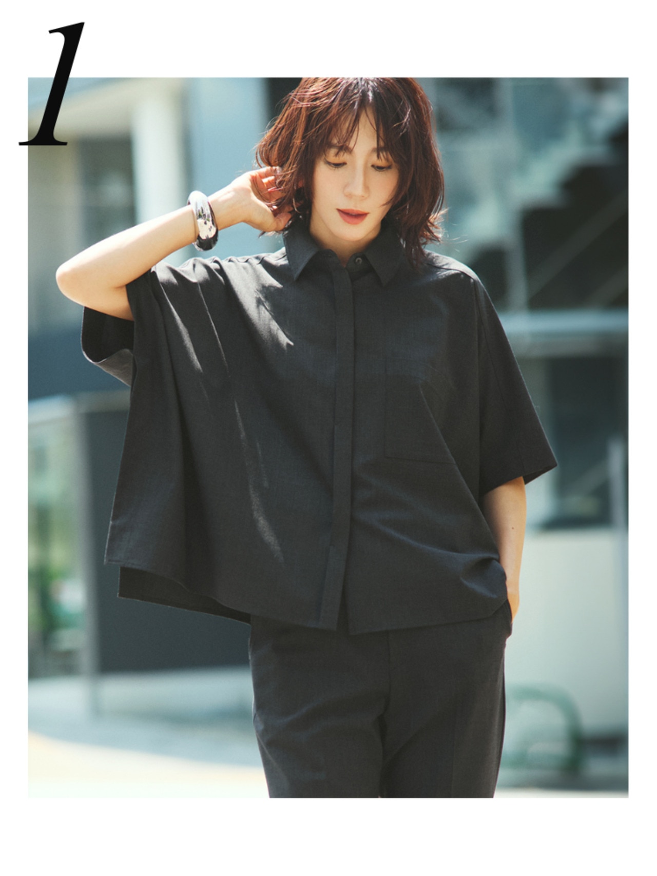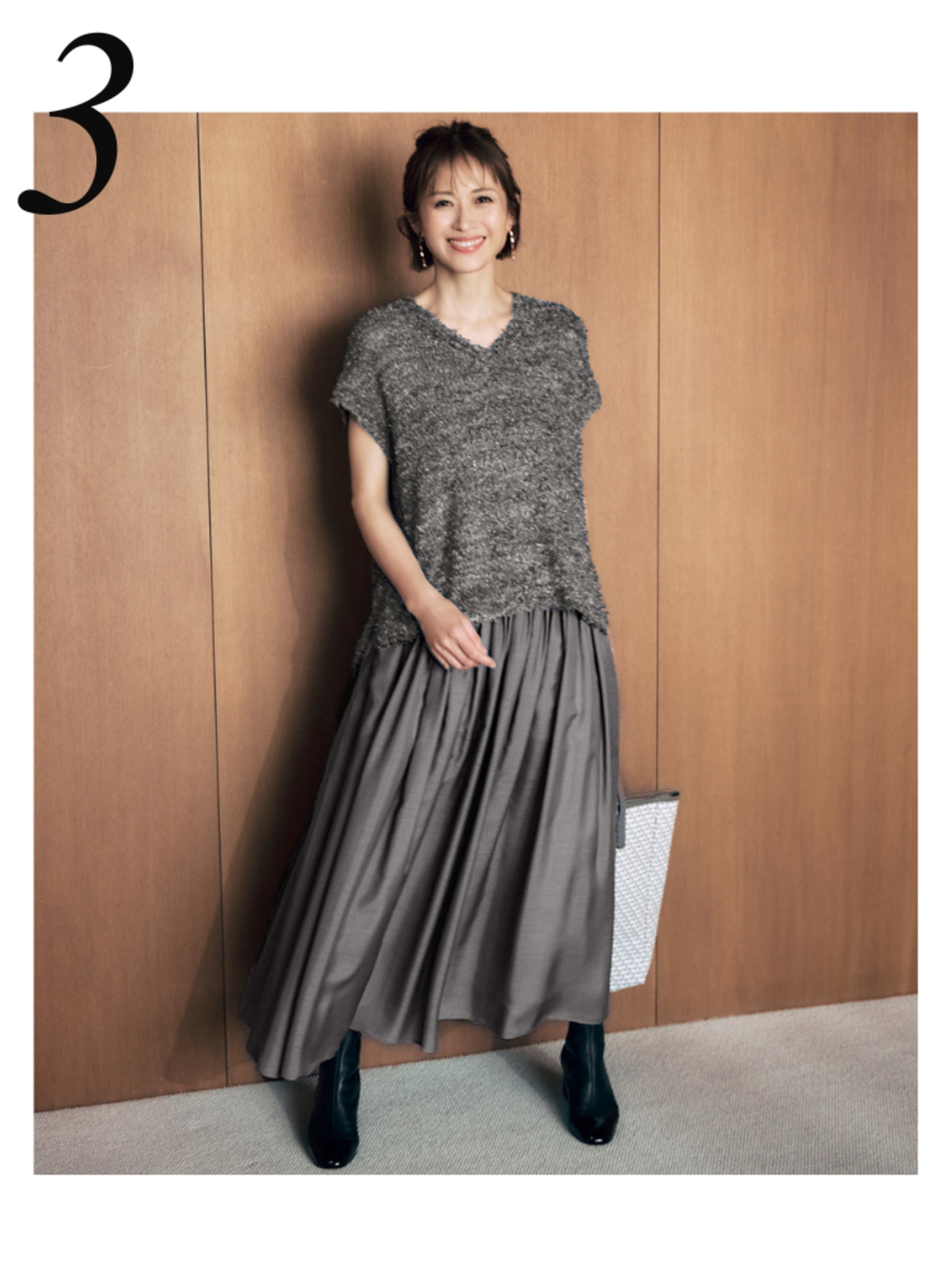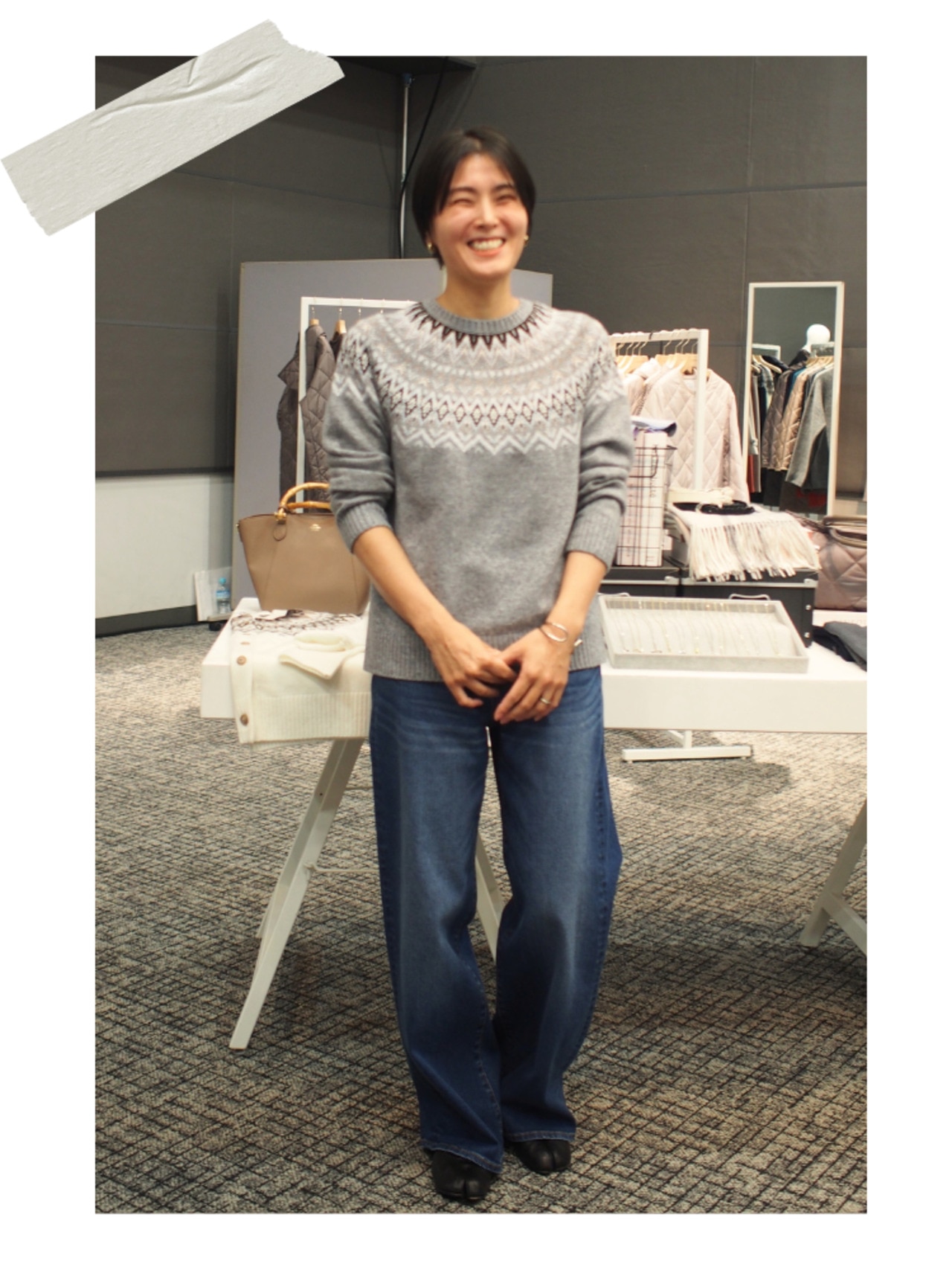 毎日の着こなしに迷う秋こそ、素材と柄で悩みを解消!透け感のある長袖トップスとチェック柄セットアップが、秋の強い味方に。(企画担当・160cm)