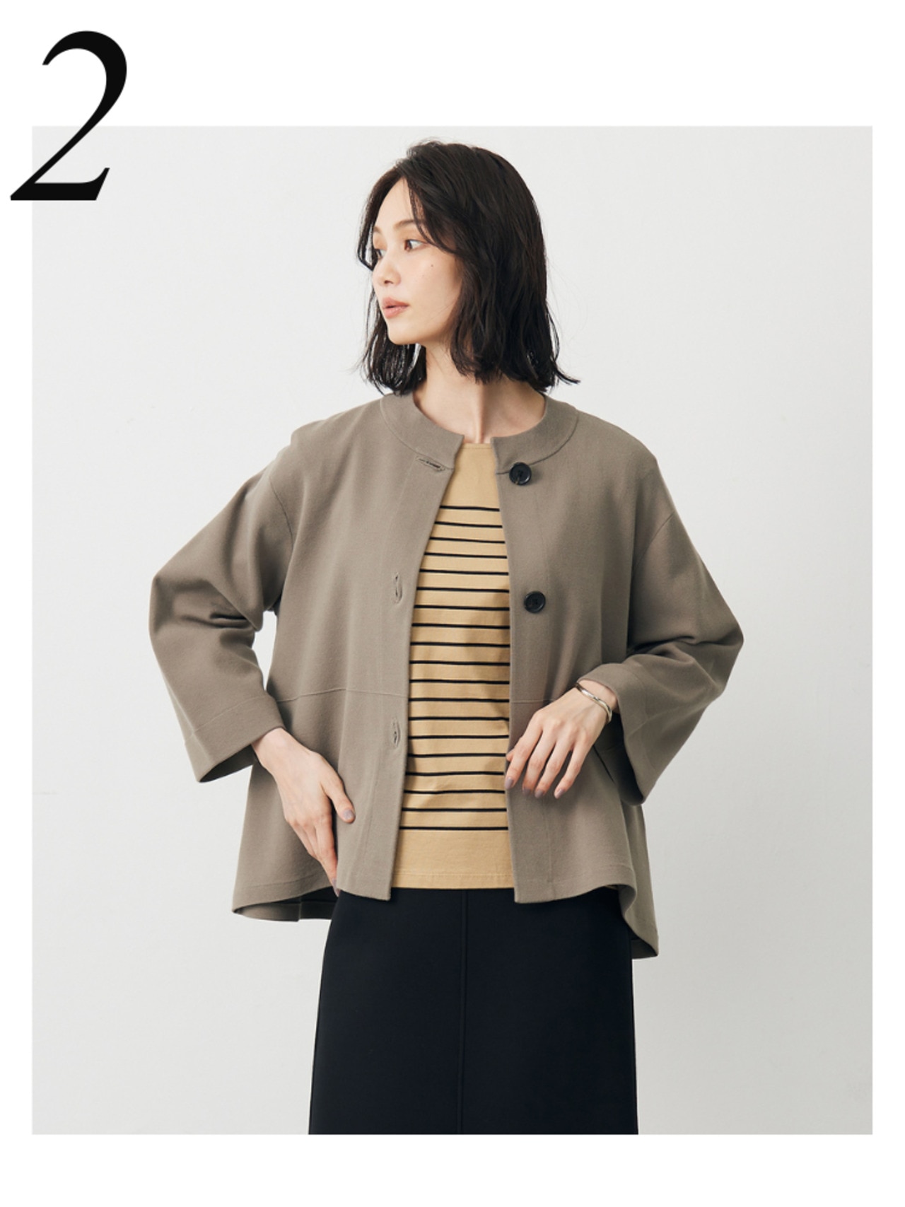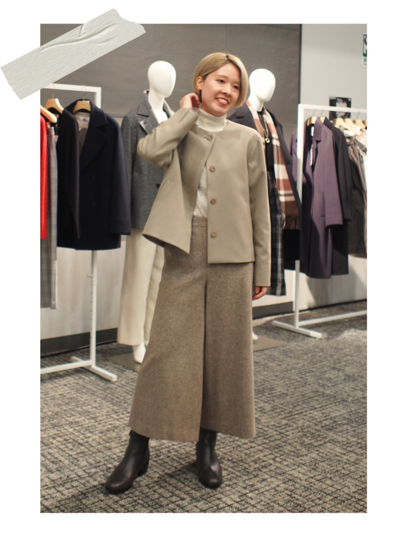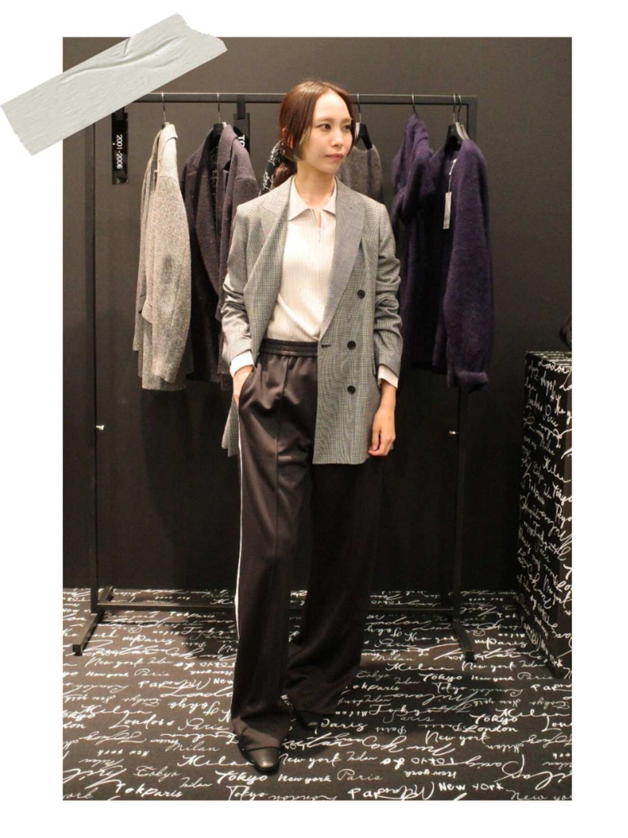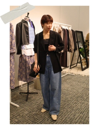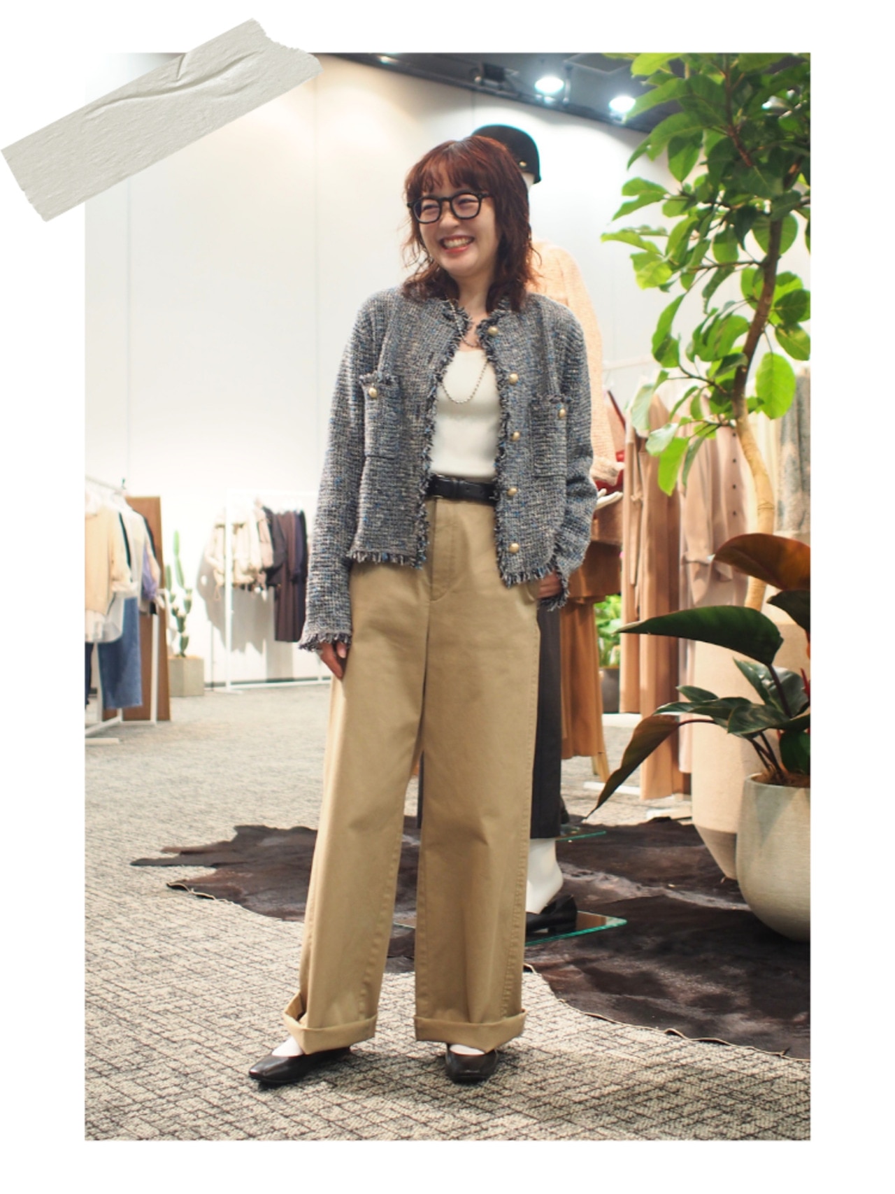 正統派なジャケットは、キレイめにもカジュアルにも活躍。程よい外しを意識してワイドチノを合わせると、着こなしの幅が広がります。(販促担当・154cm)