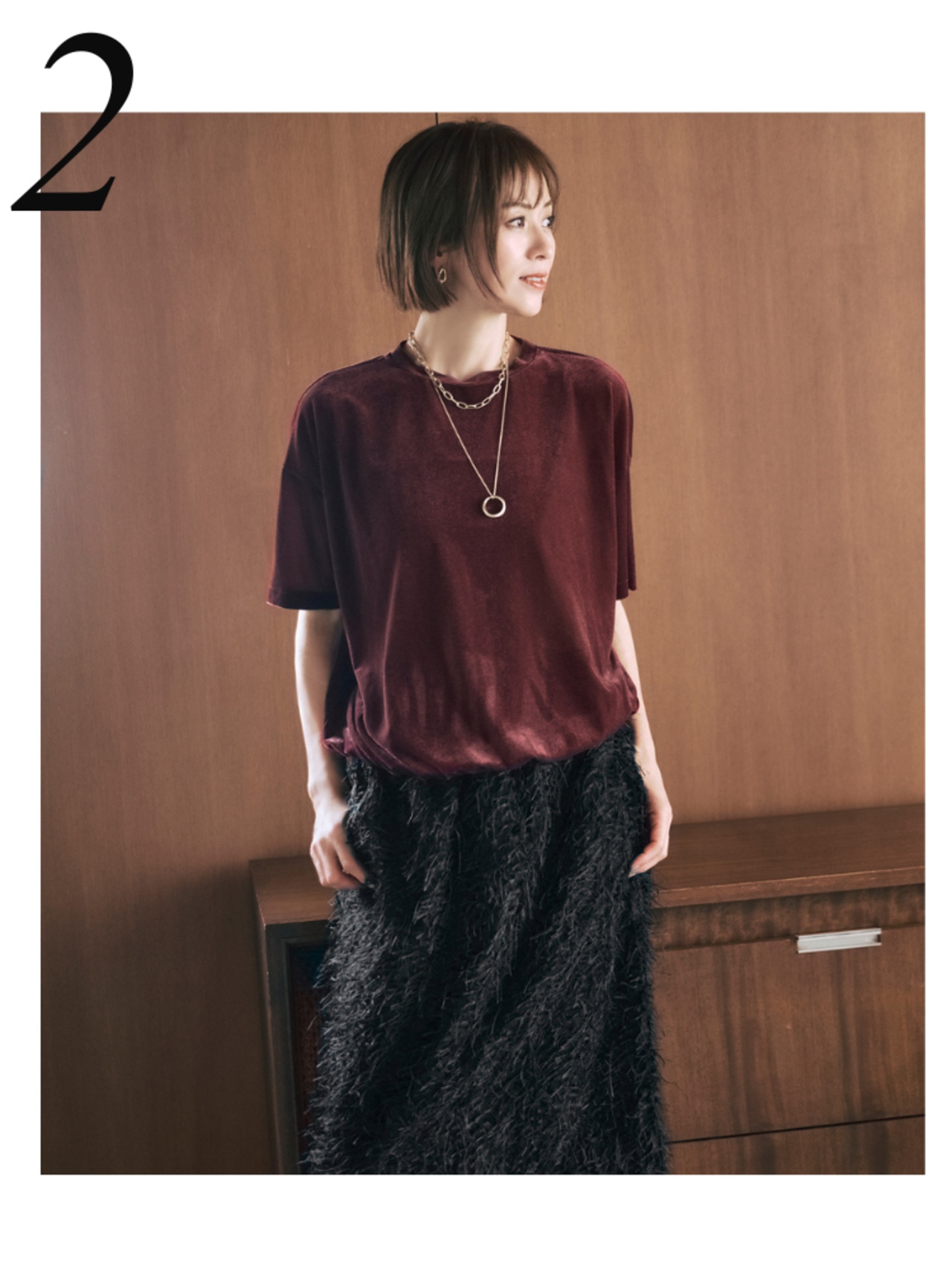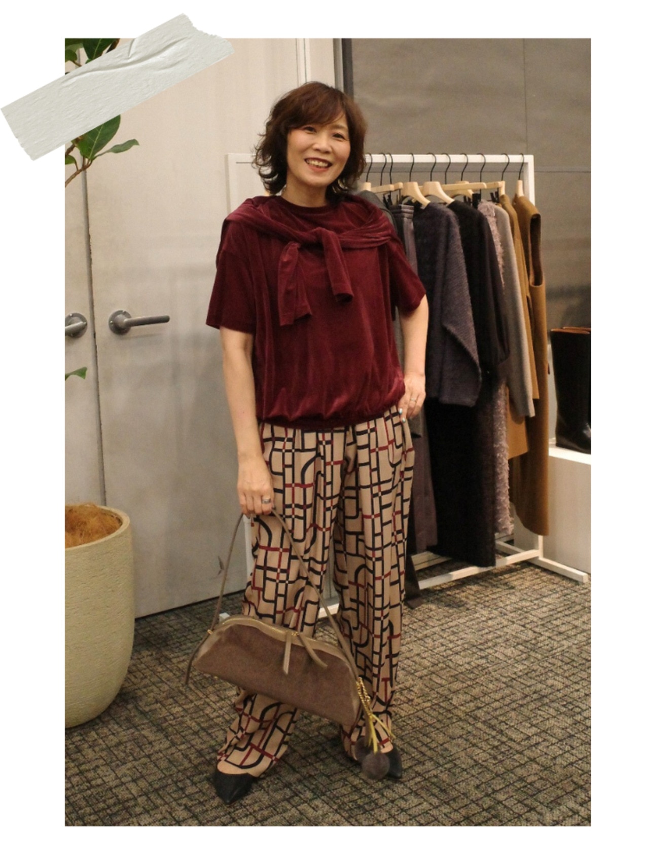 大好きなベロアを主役に、レトロシックなムードを楽しむ晩夏スタイル。アクセントに、粋な柄パンツを選んで遊び心を加えてみました!(スタイリスト・161cm)
