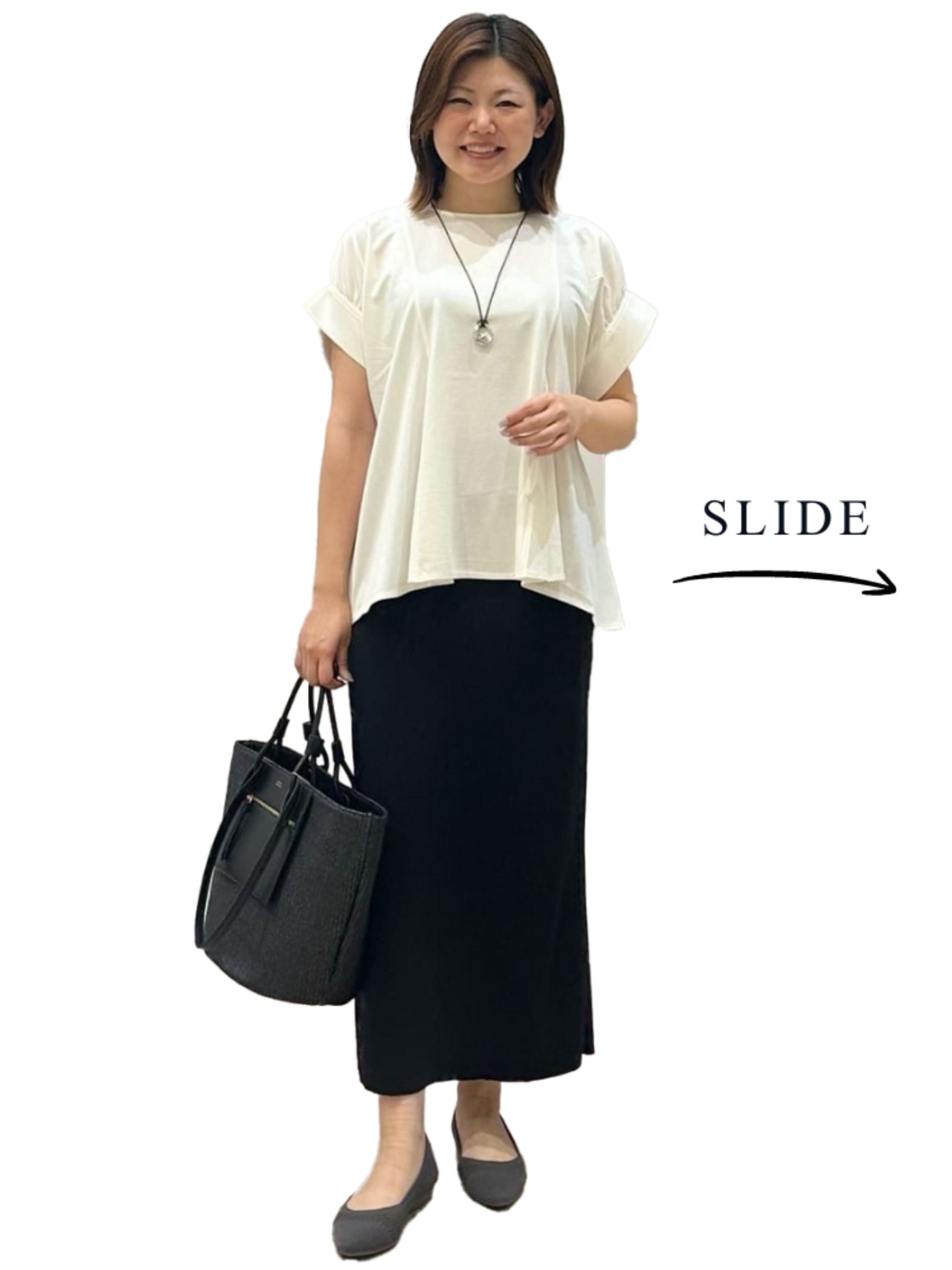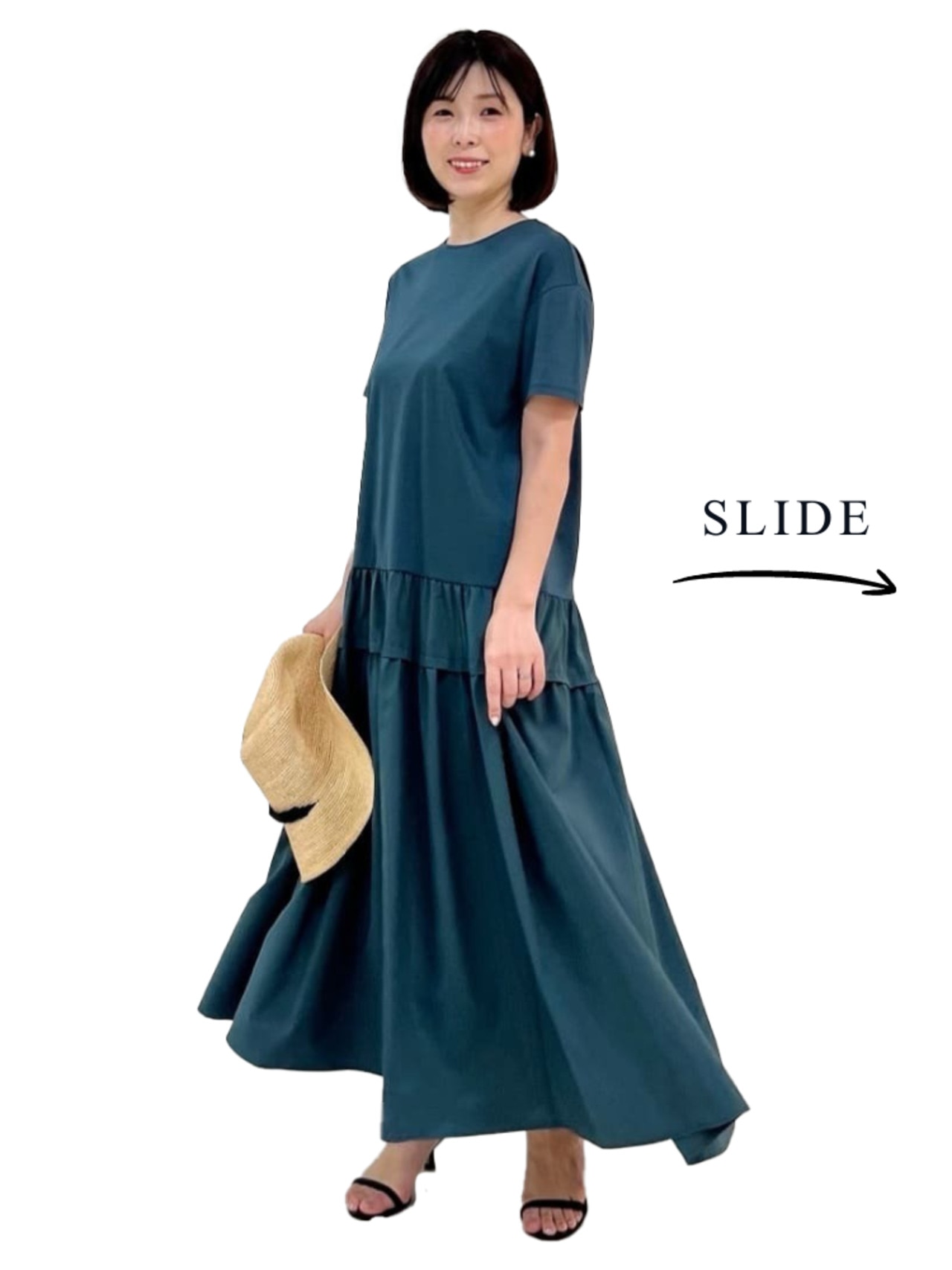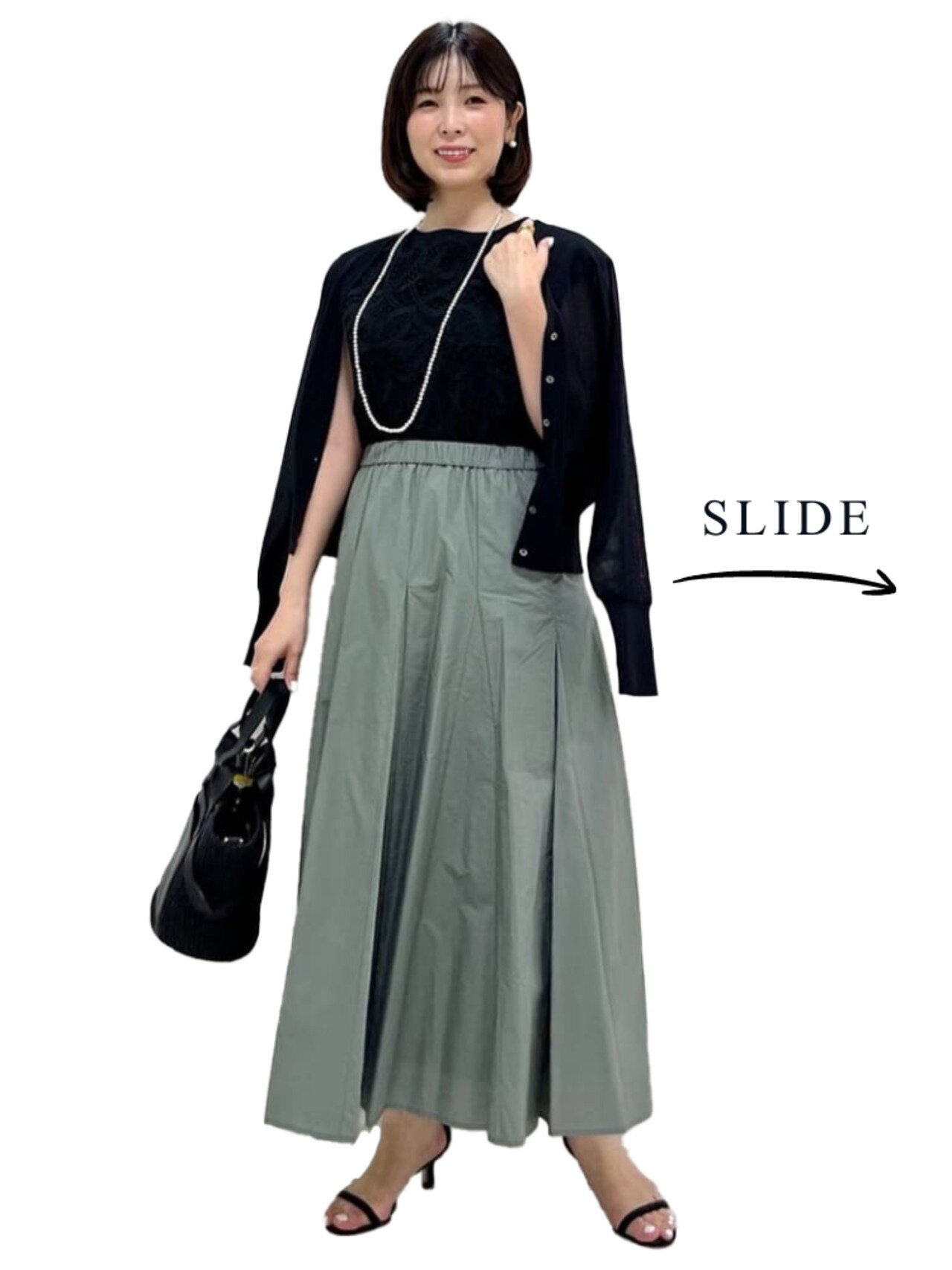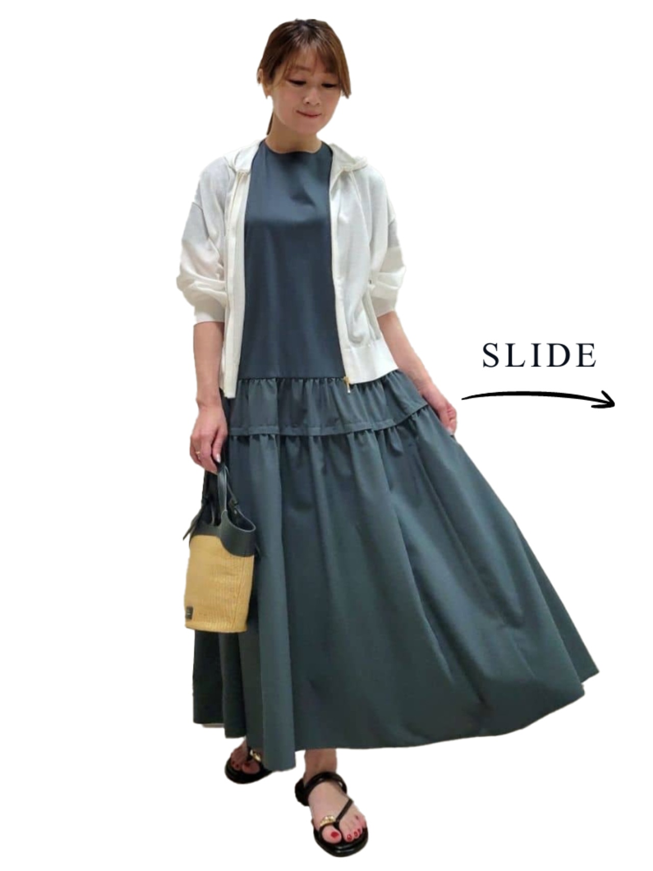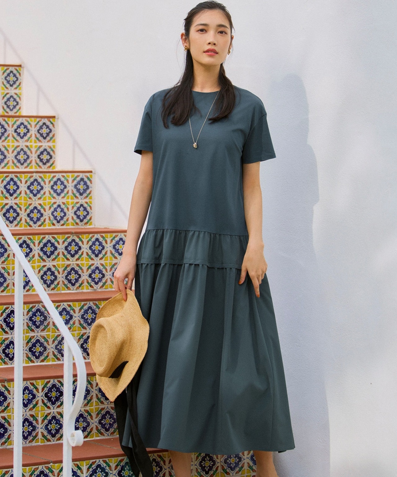 カットソー×タフタの異素材ワンピースは、1枚で “きちんと”も“華やかさ”も両立。ふんわり広がるスカートに、動きに表情をつけてくれるから、シンプルでも手抜き感ゼロ。撥水&汗ジミ防止機能付きで、移動や予定が多い日にもピッタリ。ちゃんと見えて、ちゃんとラク、そんな理想の1着です。