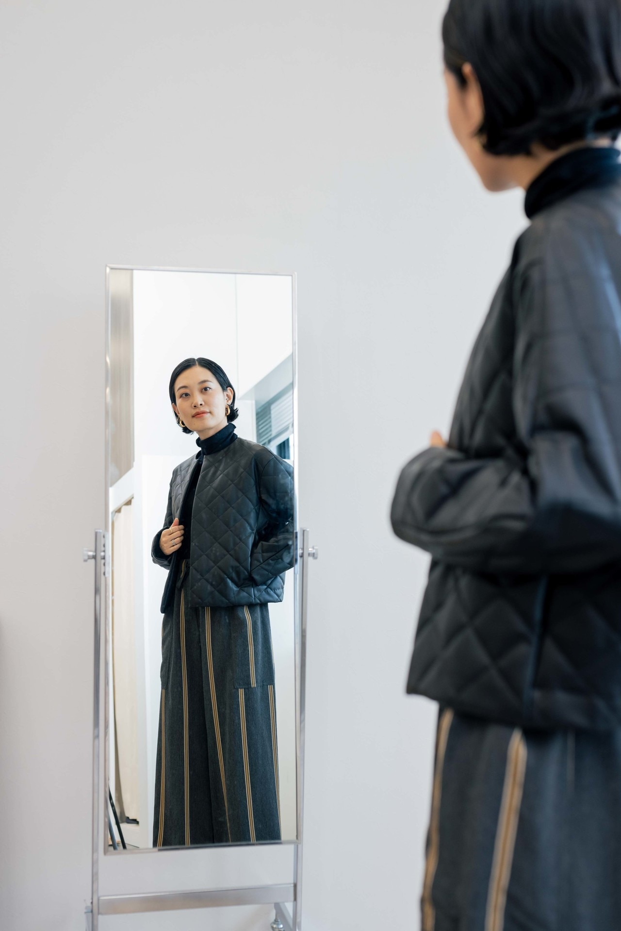 キルティングですがスポーティにならないように丸みのある肩のシルエットとボタンレスのデザインで、エレガントに仕上げたのがこだわりです。リアルレザーのようなしなやかな表情と質感もポイント。さらに、柔らかいタッチにこだわったフェイクレザーに薄手の中綿を挟み込みキルト加工した素材で仕立てました。