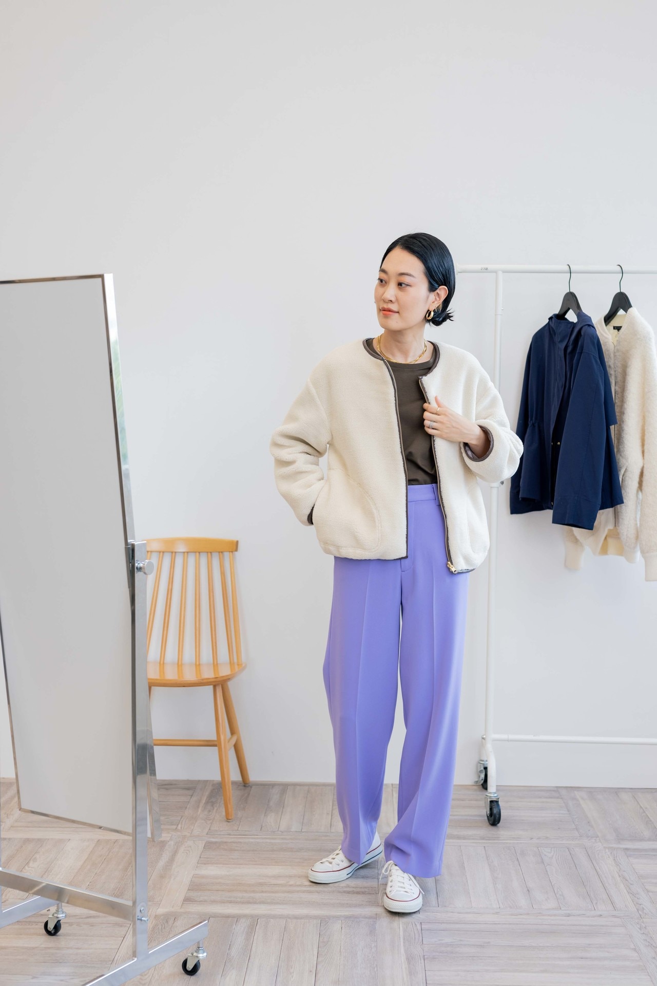 リバーシブル仕様のブルゾンは、コーディネートに合わせて様々な着こなしが出来る優れもの。ボア面はカジュアルになり過ぎないように、毛並みが細かいタイプを使用し、大人カジュアルにぴったりな見え感にこだわりました。無地面は撥水性のあるセミマットなタフタ素材を使用し、すっきりとシンプルに仕上げています。
