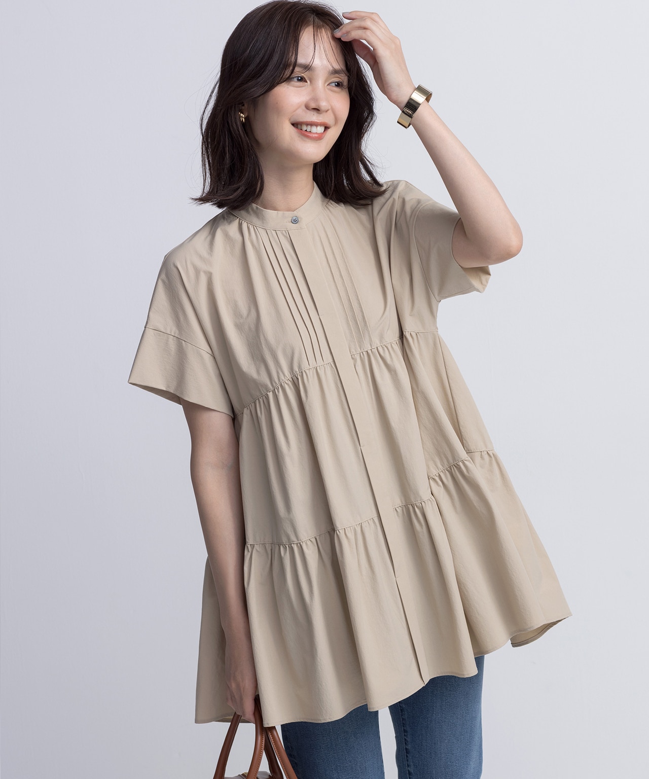 きちんと見えが嬉しいスタンドネックブラウス。ふんわりティアード×長め丈で体型カバーも叶えてくれます。