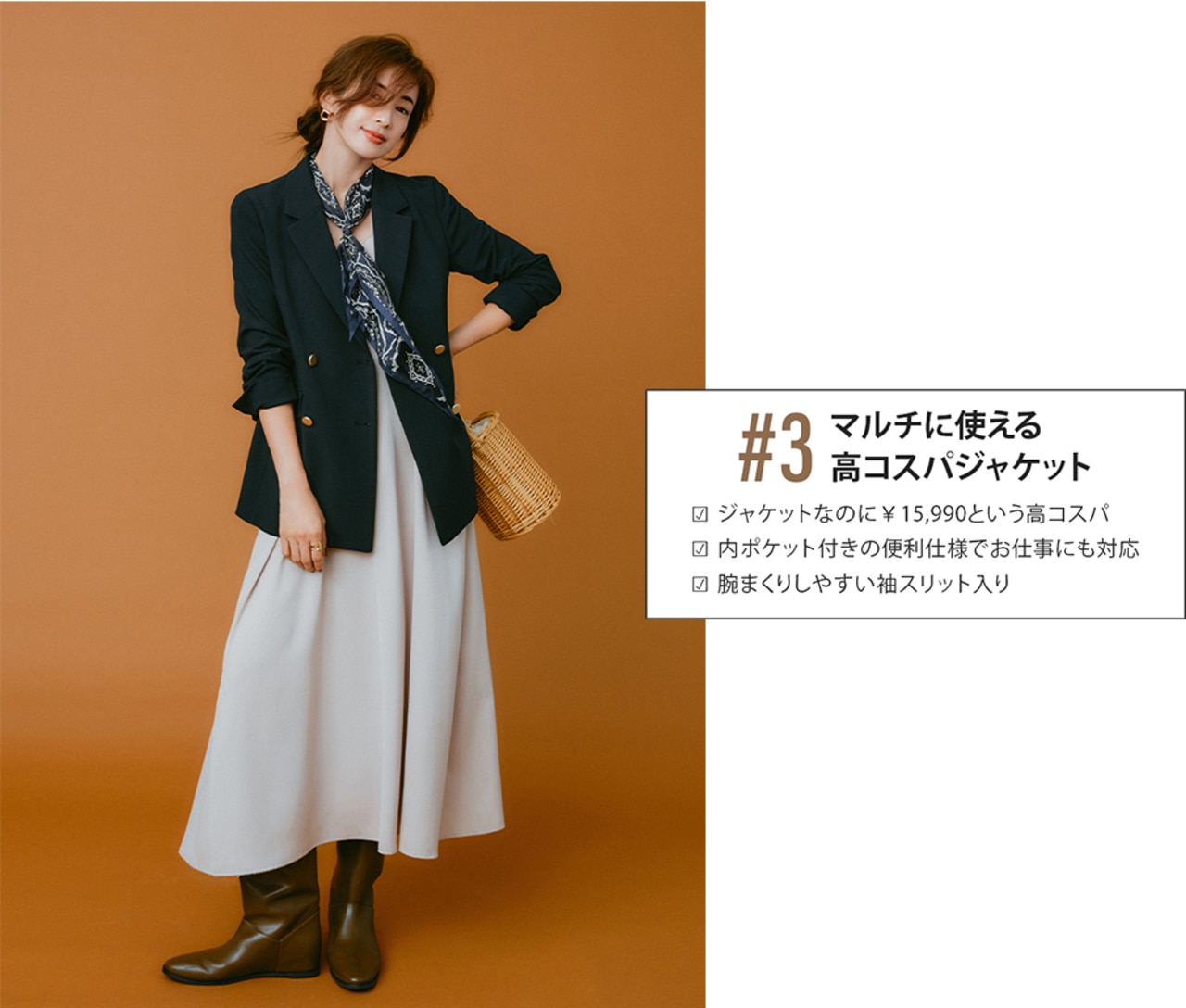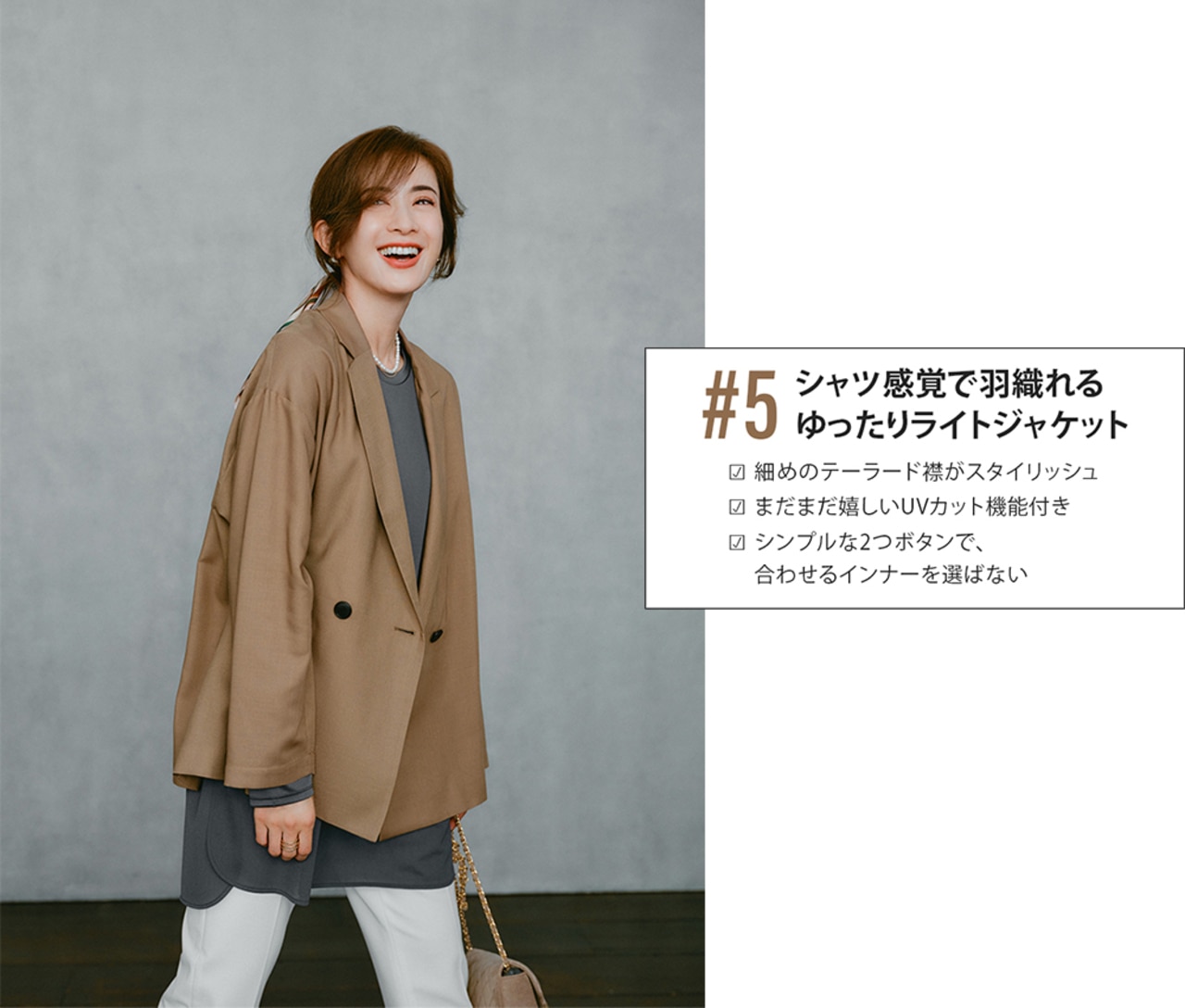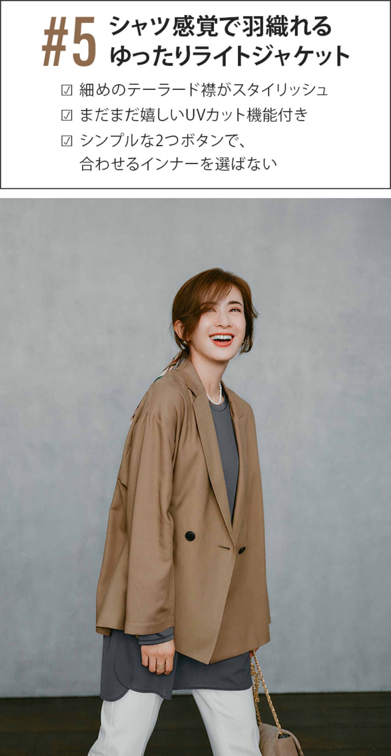 軽い素材感のコーデでも、ジャケットさえあれば秋感が漂う。日中はまだ少し暑いから、肩掛けでもサマになるきちんとシルエットが嬉しい。