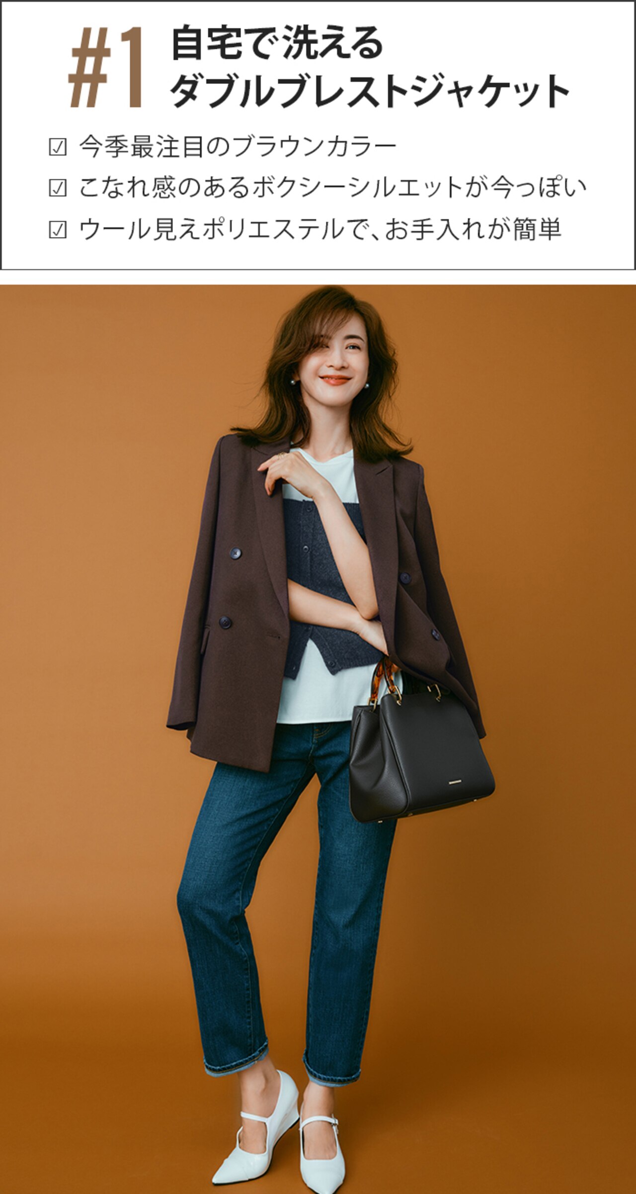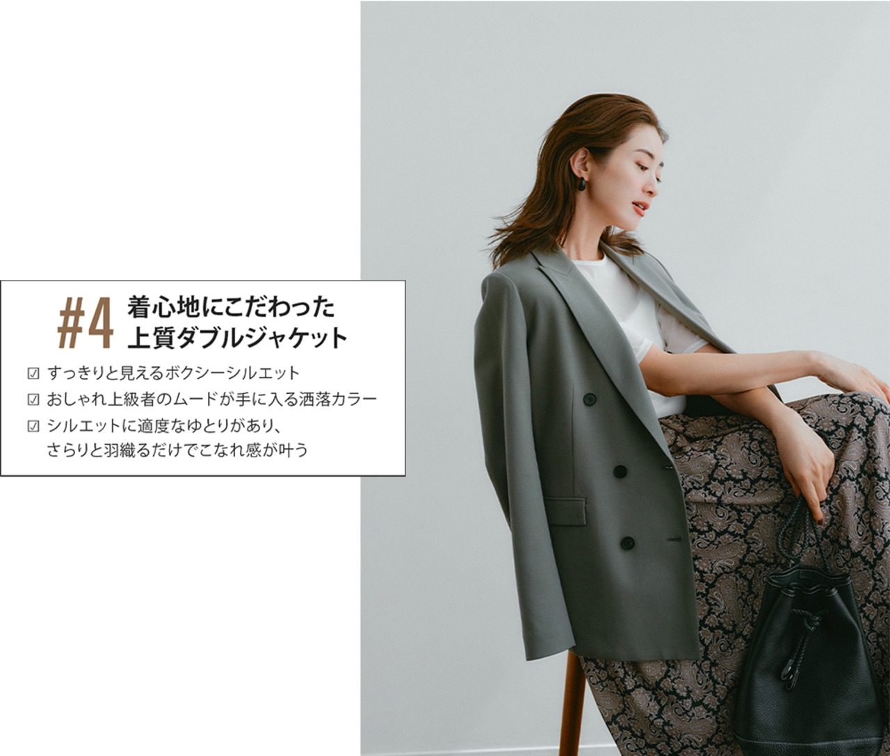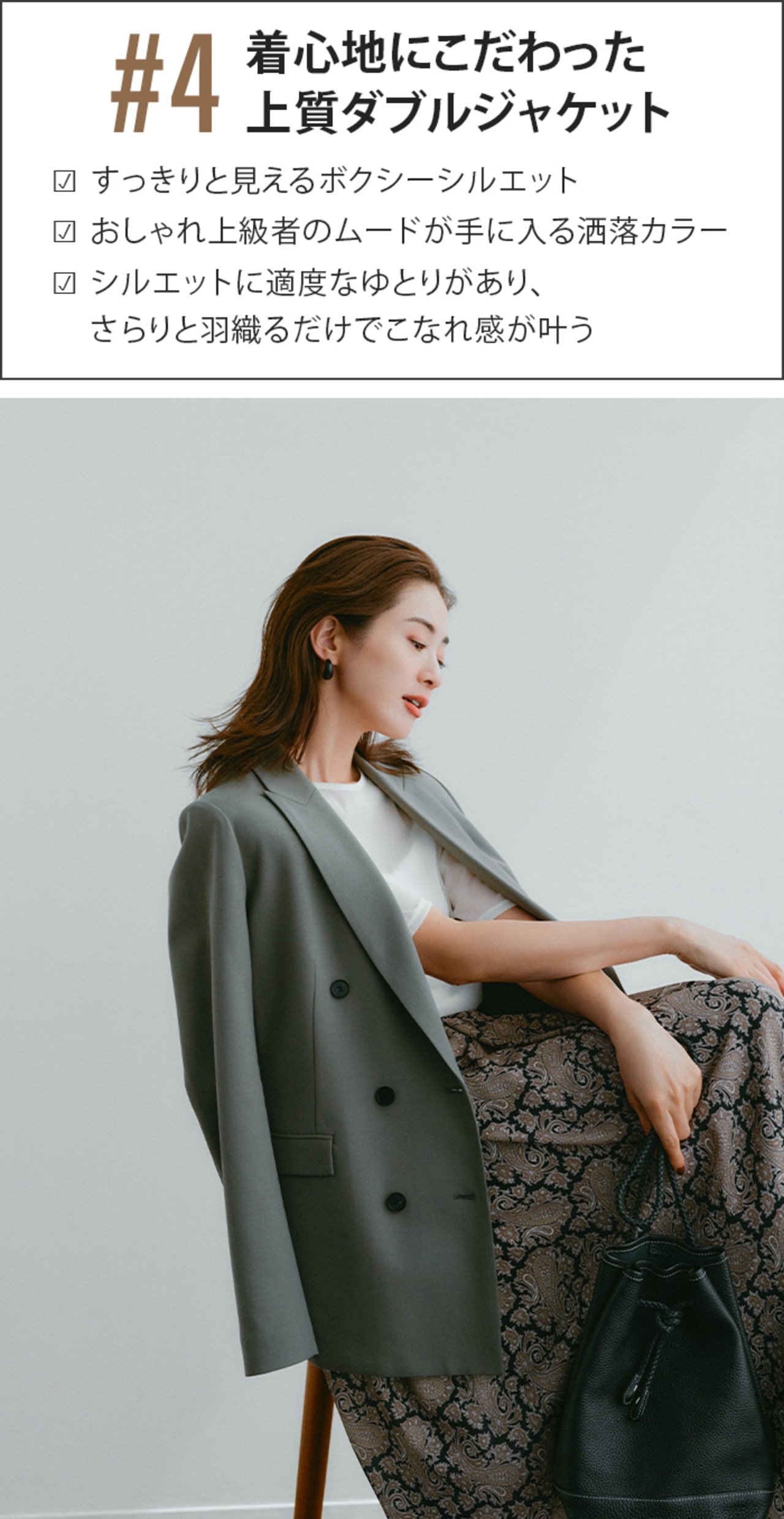 軽い素材感のコーデでも、ジャケットさえあれば秋感が漂う。日中はまだ少し暑いから、肩掛けでもサマになるきちんとシルエットが嬉しい。