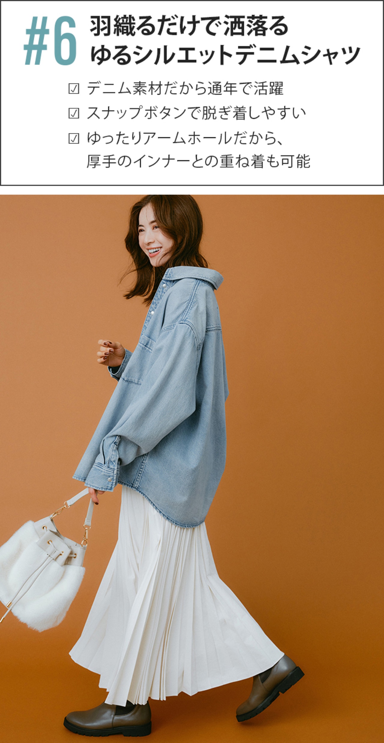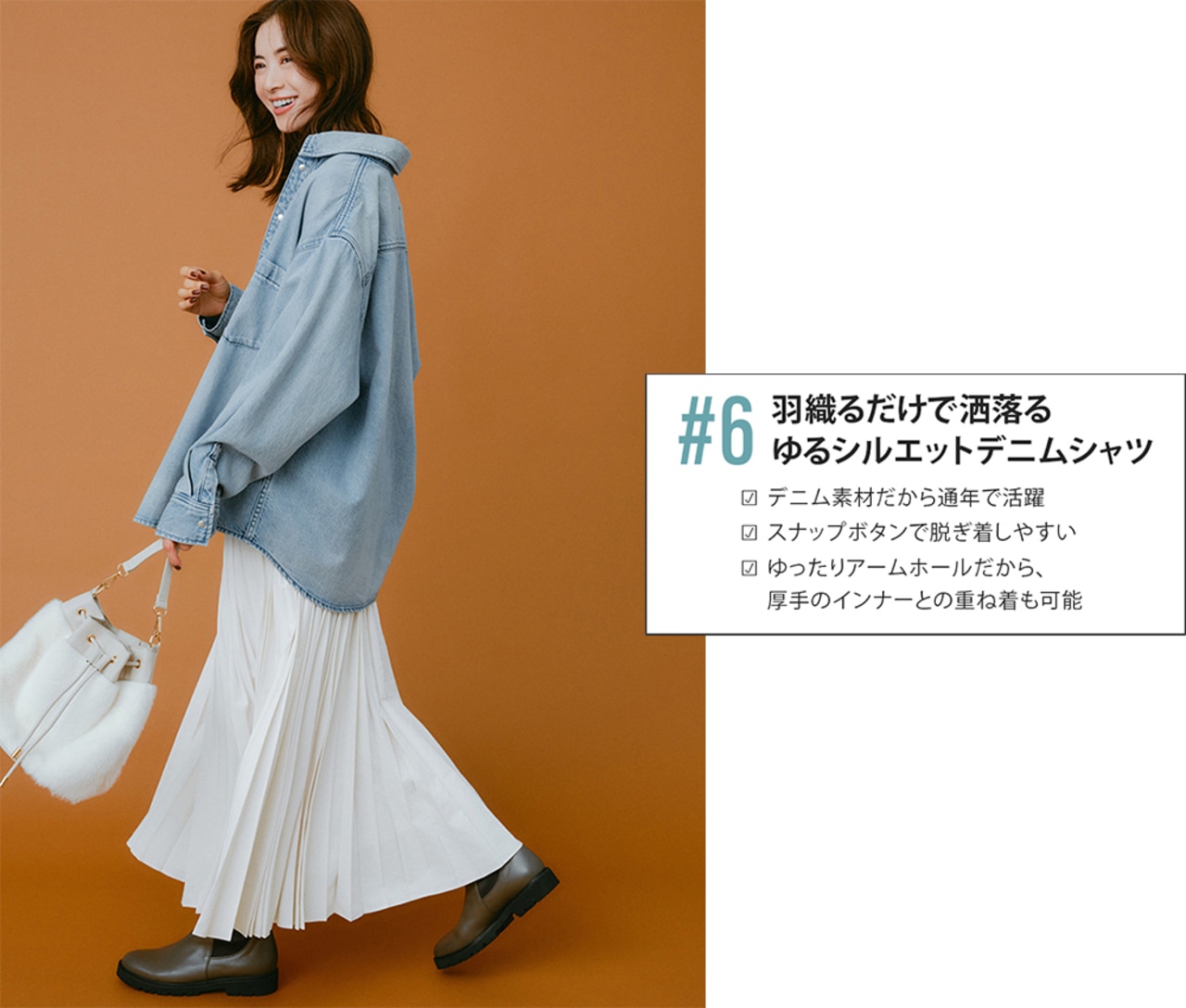ラフなデニムシャツは、プリーツスカートで女っぽさをプラス。通年着られるコーデだけれど、小物使い次第で季節感も取り入れられる。