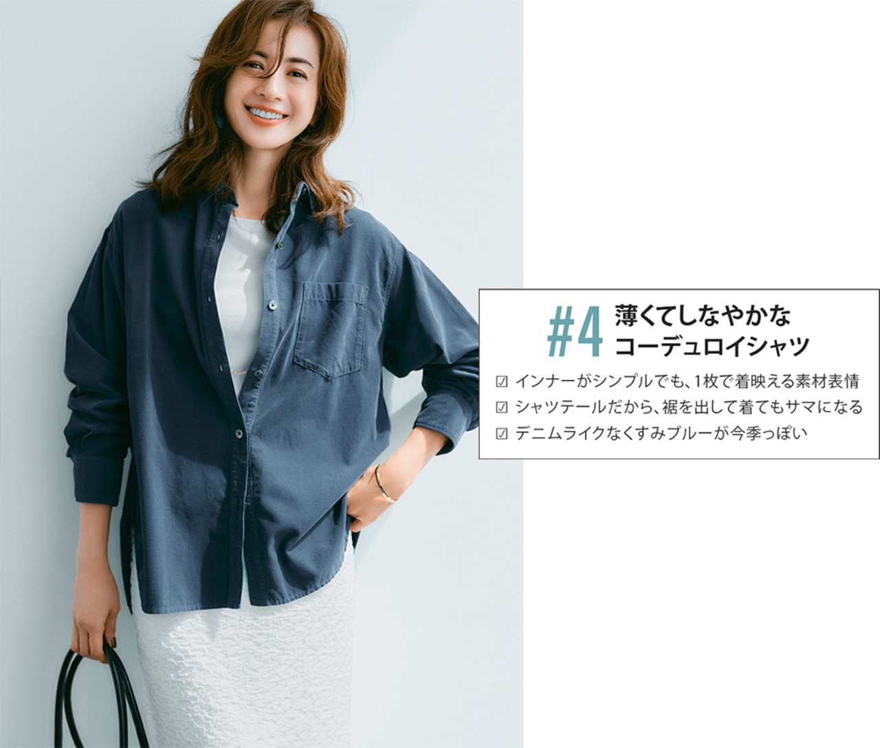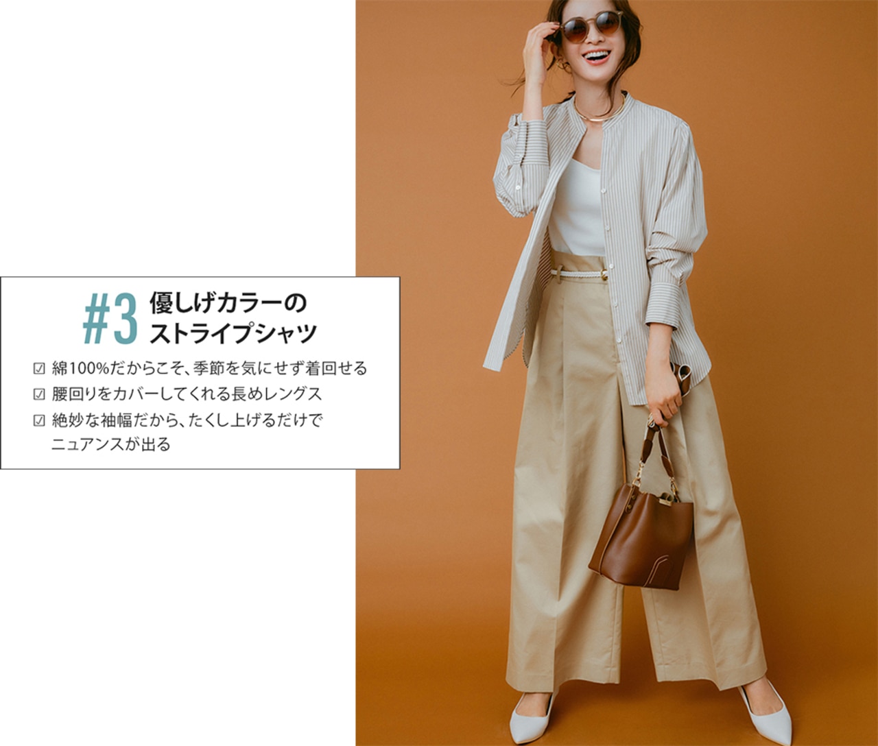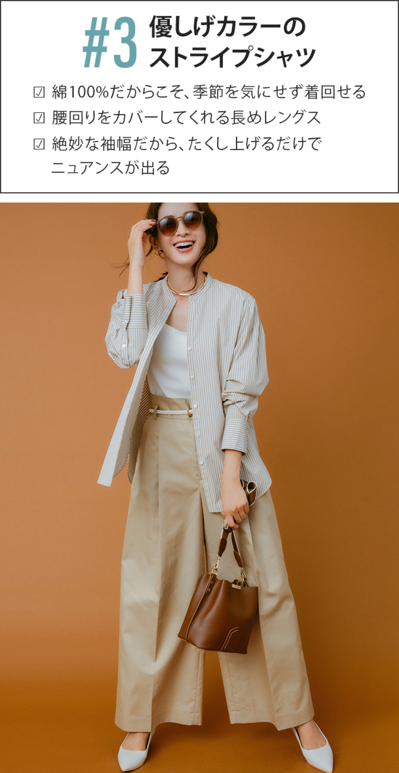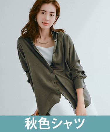 秋色シャツをタンクトップに羽重ねて、さりげなくシーズンムードを演出。羽織りなら気温次第で着方をアレンジ出来るから、気軽に季節感を取り入れやすい。