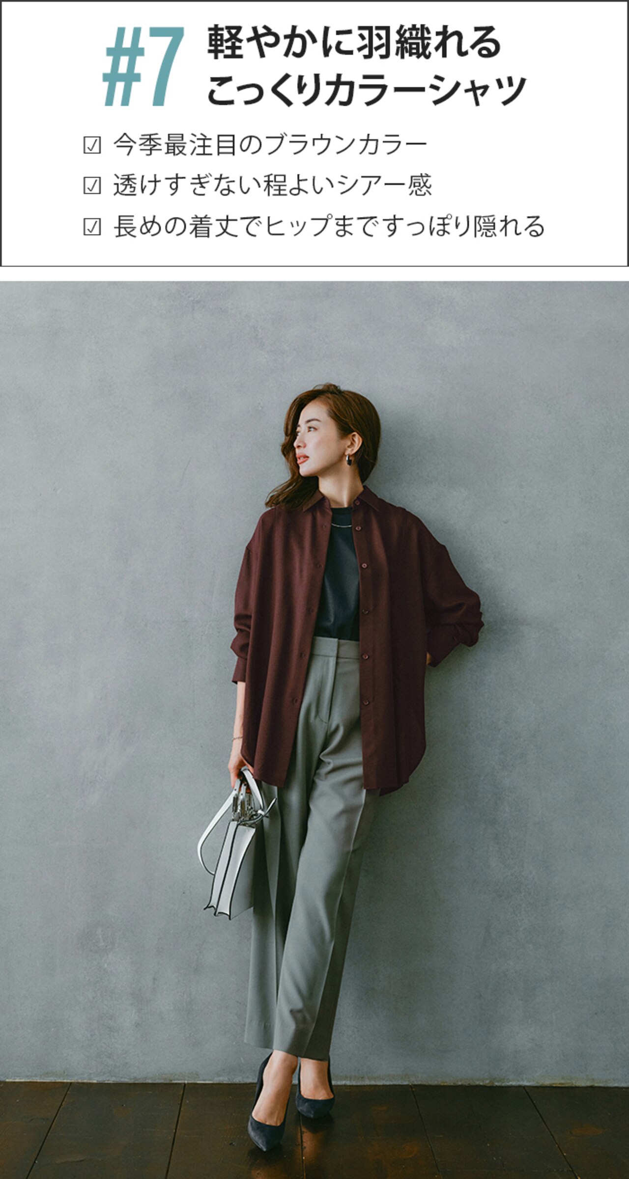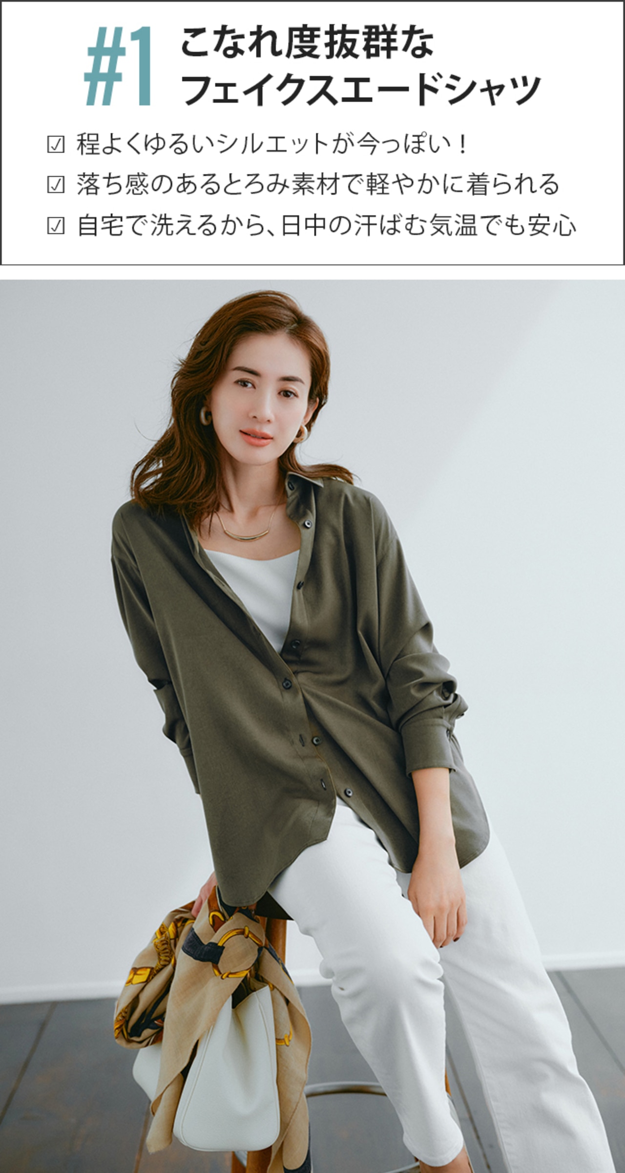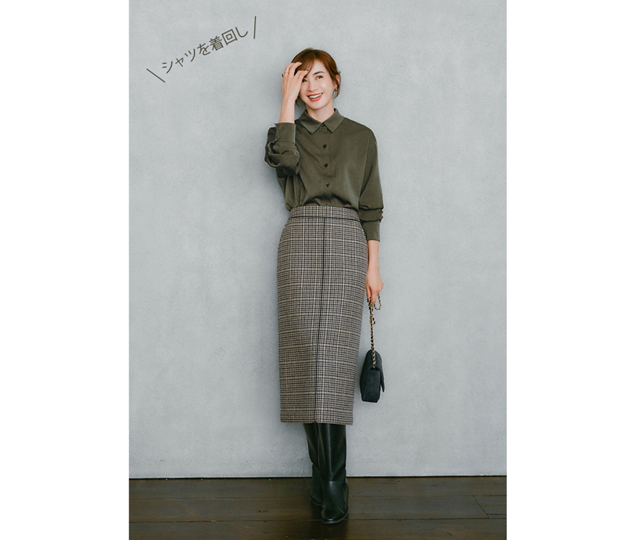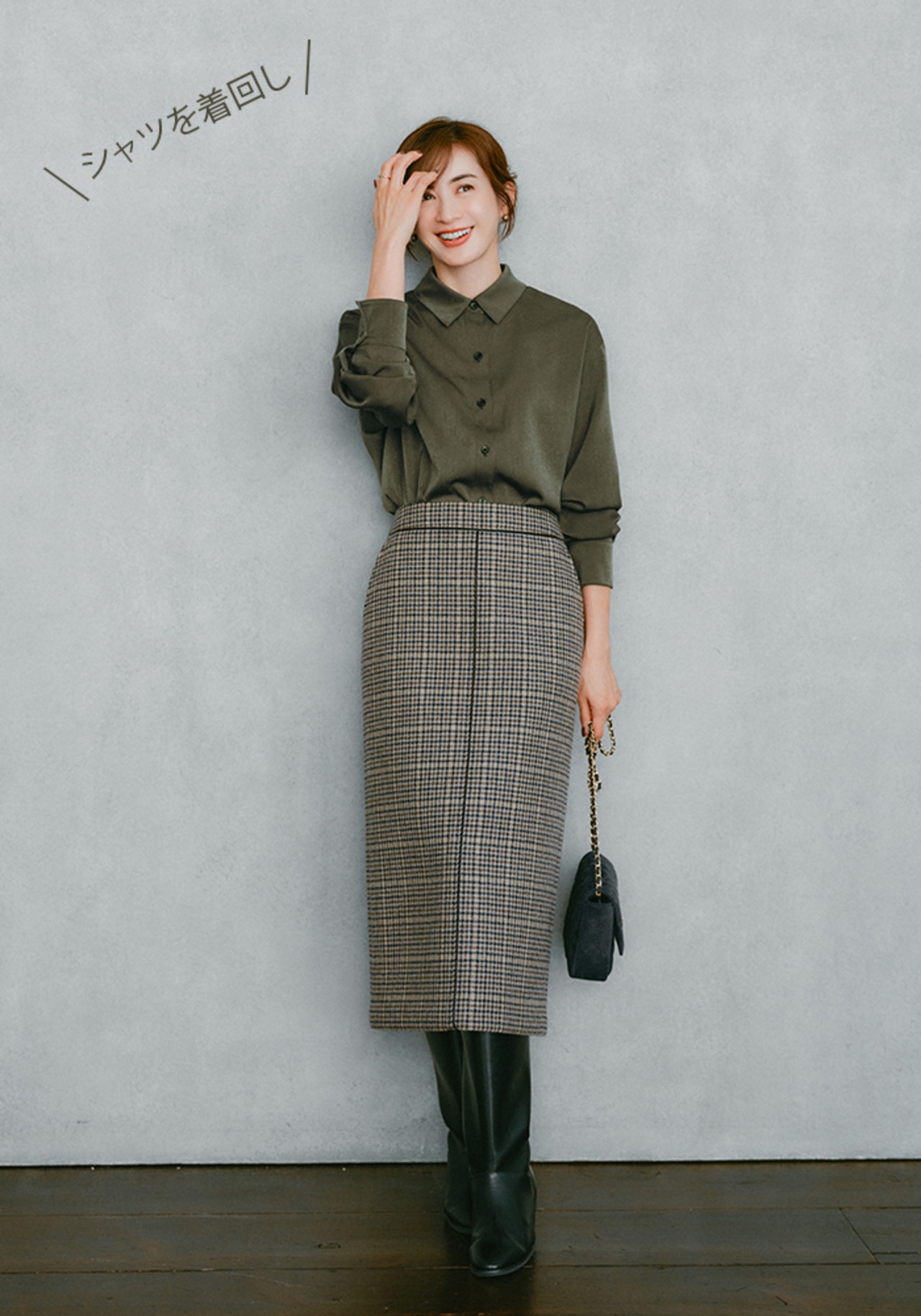 ボタンを留めて1枚で着れば、きちんと感も女っぷりもUP。季節が進んだらさらにアウターを羽織って、冬の間も着回せるのが嬉しい。