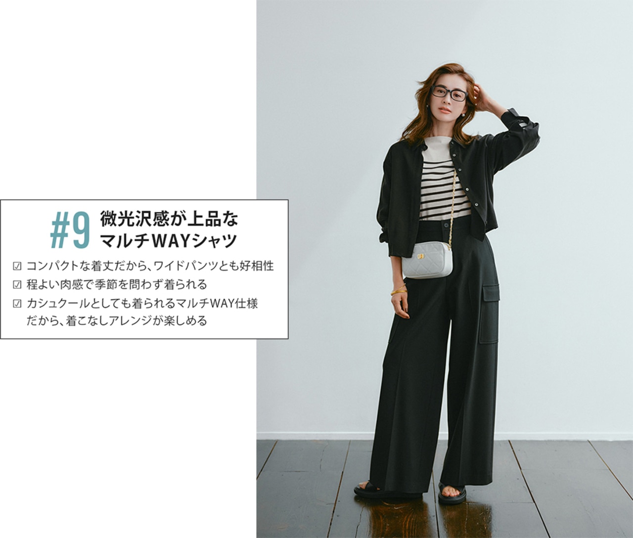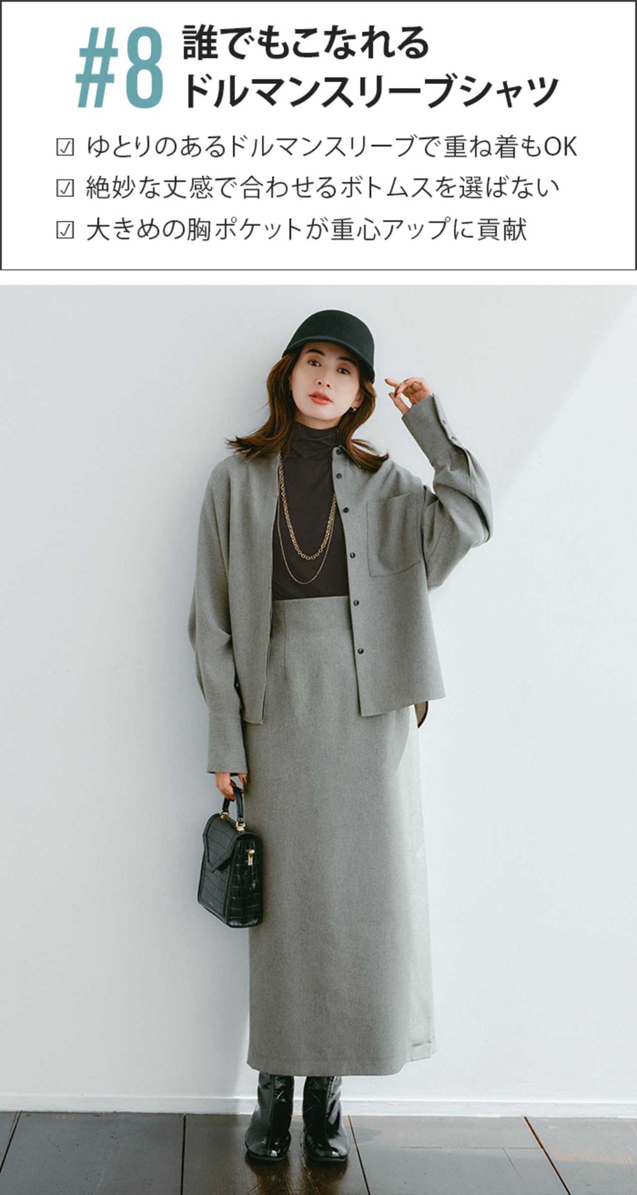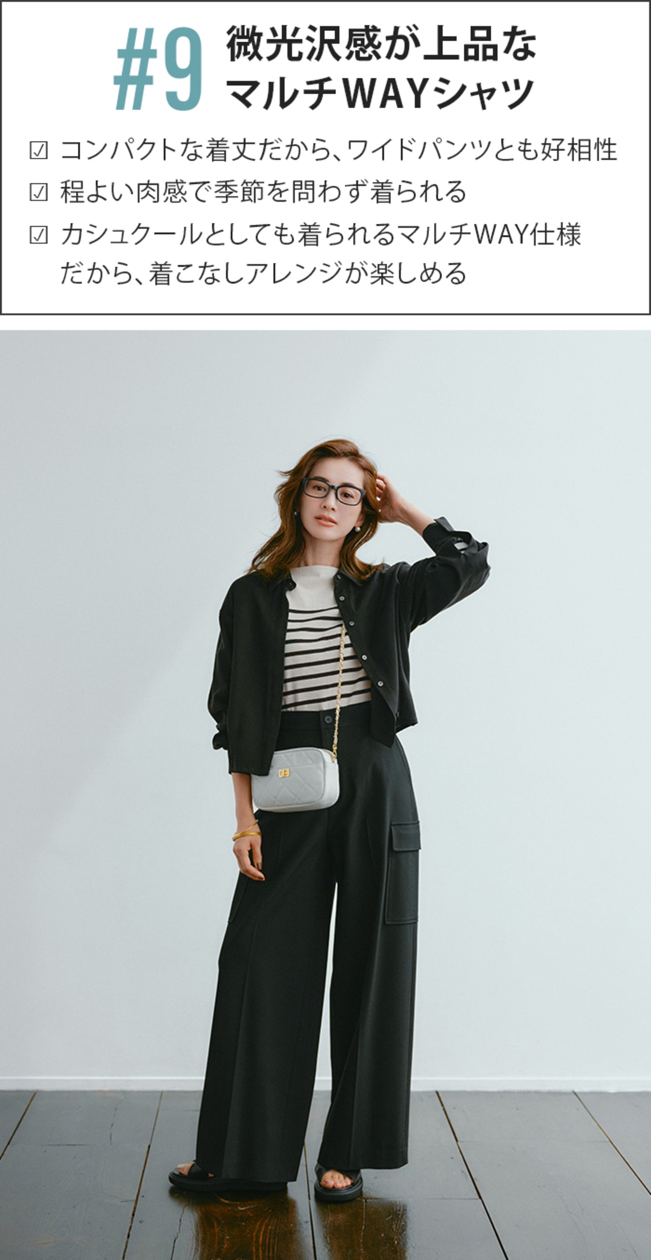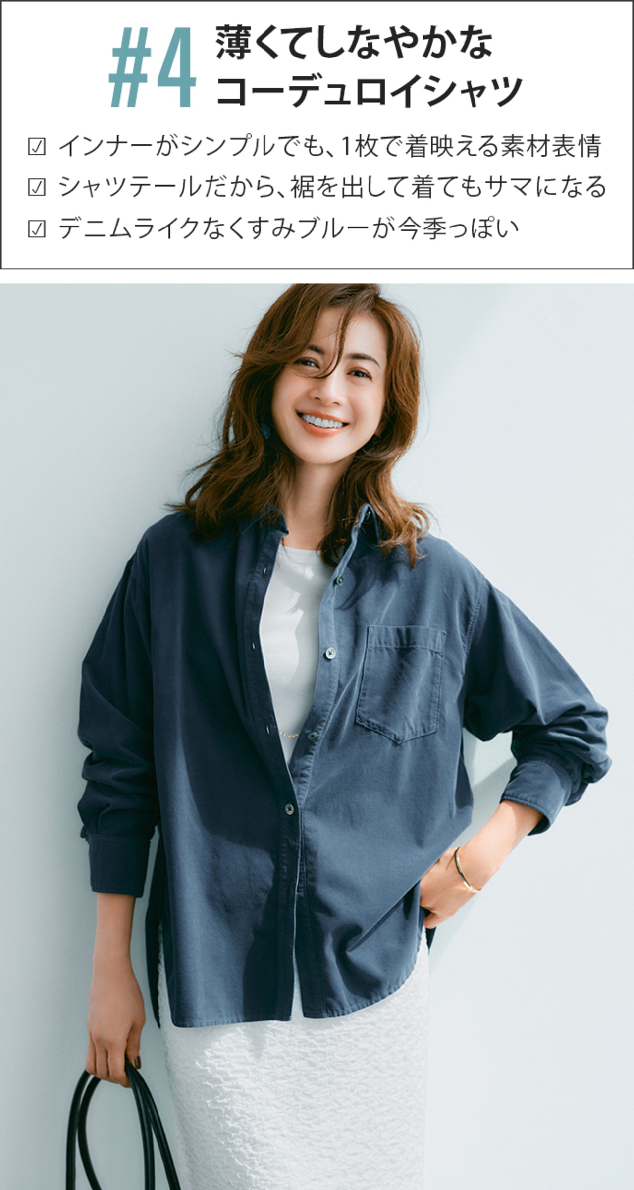 ボタンを留めて1枚で着れば、きちんと感も女っぷりもUP。季節が進んだらさらにアウターを羽織って、冬の間も着回せるのが嬉しい。