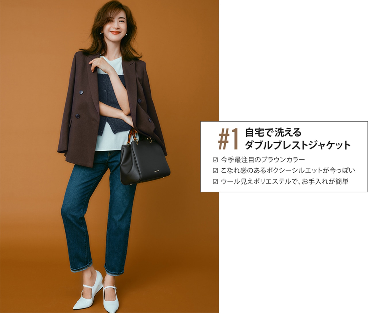 きちんと感のあるダブルブレストを、デニム合わせで休日仕様にチェンジ。インナーにビスチェをレイヤードすれば、ジャケットを脱いでもサマになる最旬コーデが完成。