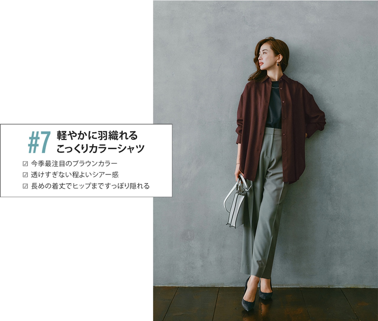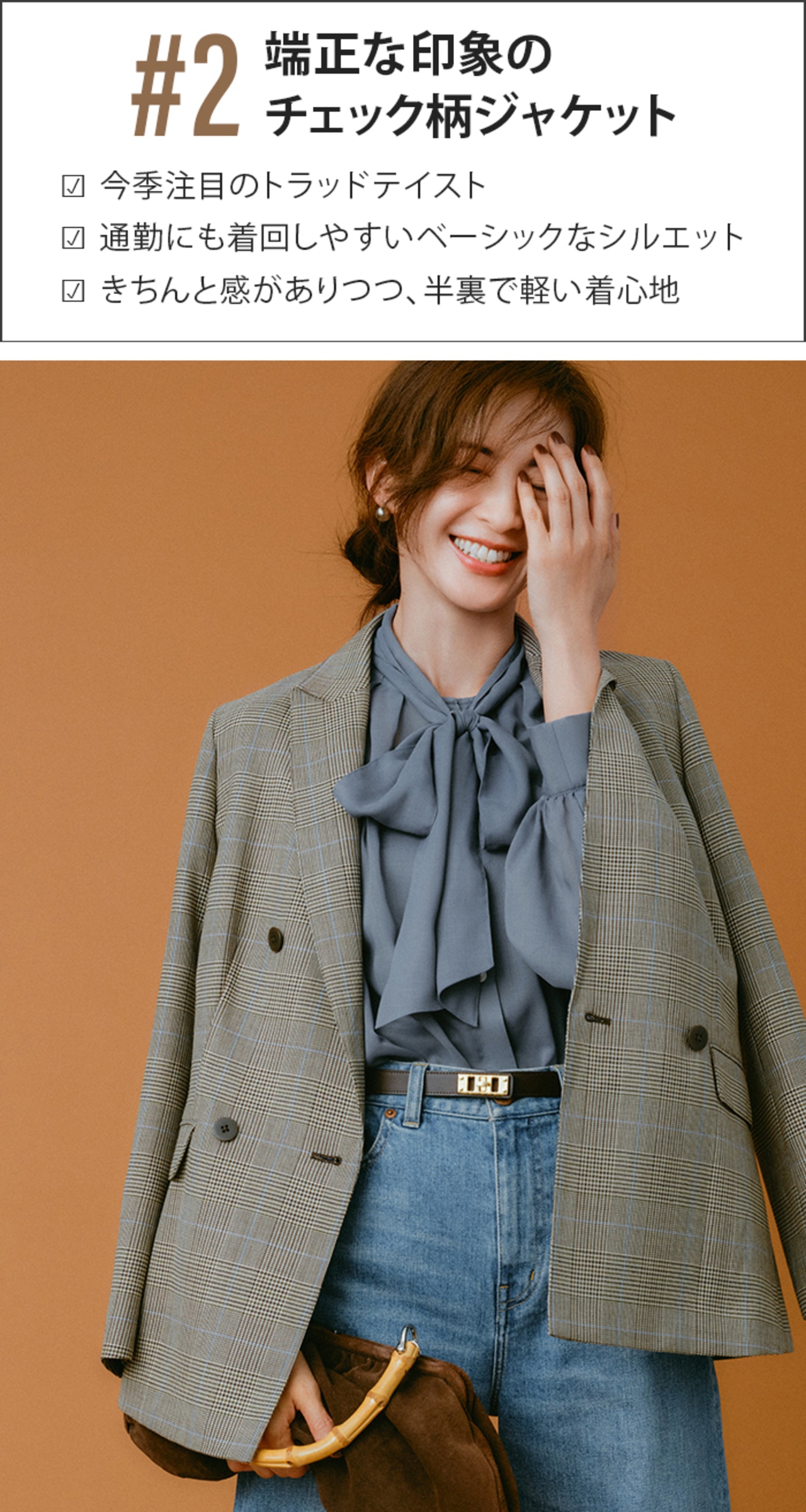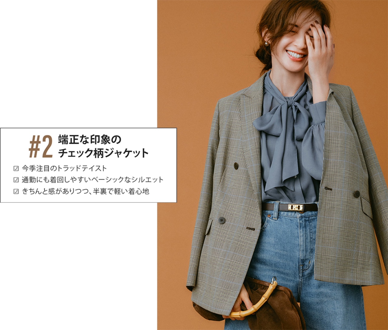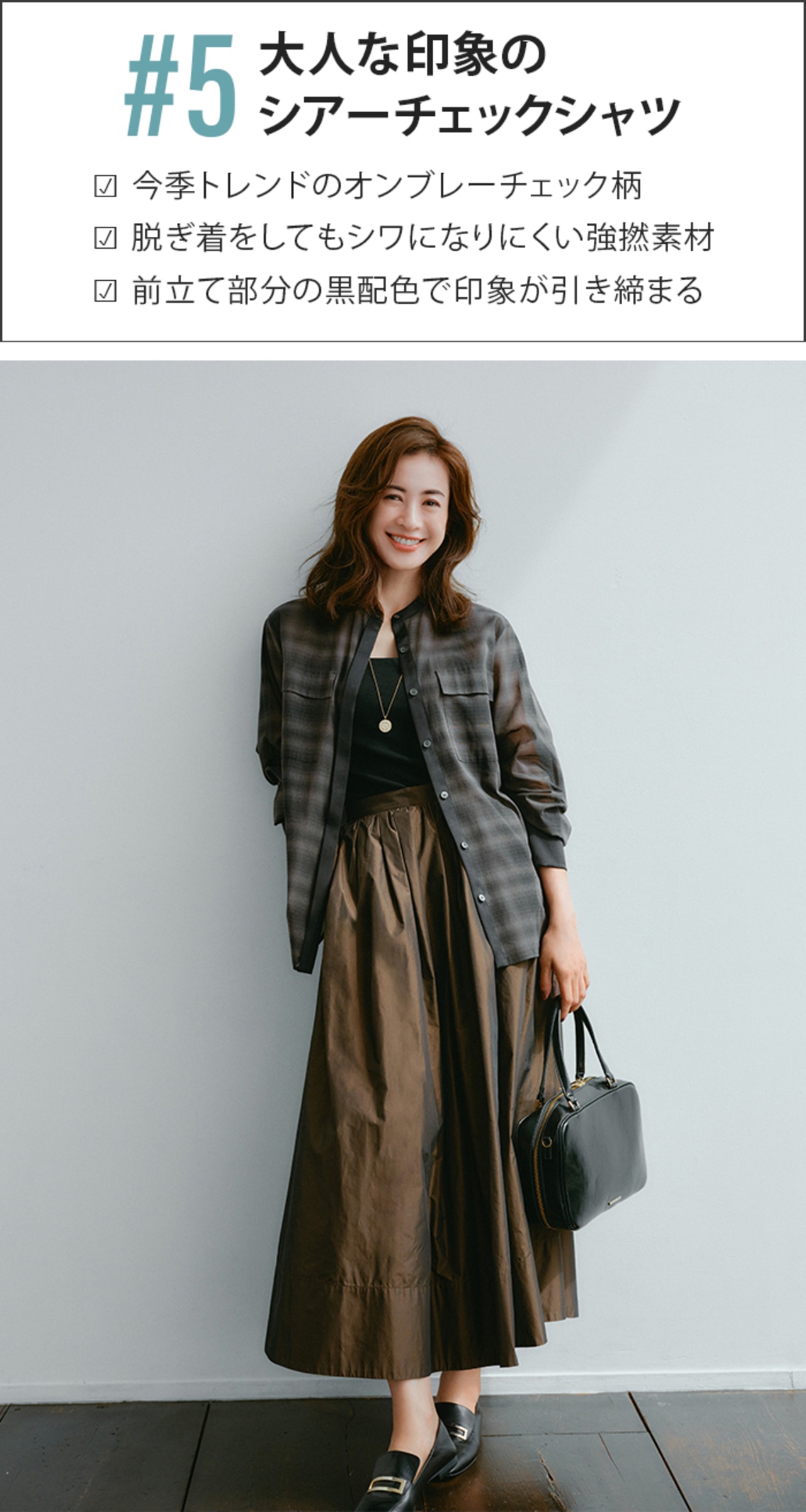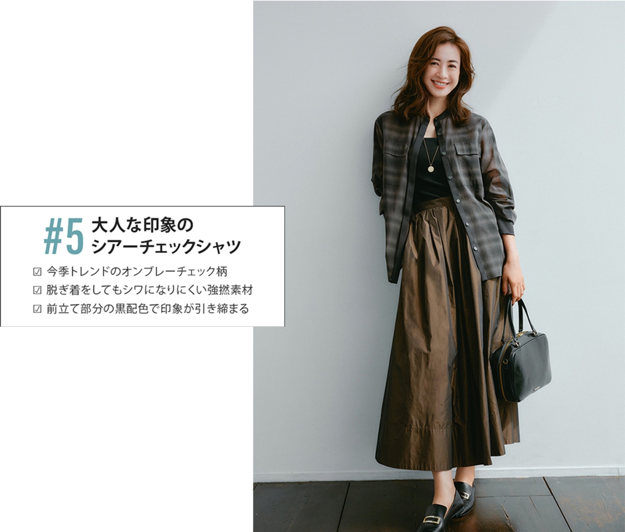 シアーチェック×ブラウンで、トレンドを押さえた最旬スタイルに。素材感のコントラストを効かせることで、コーディネートに奥行きが生まれる。