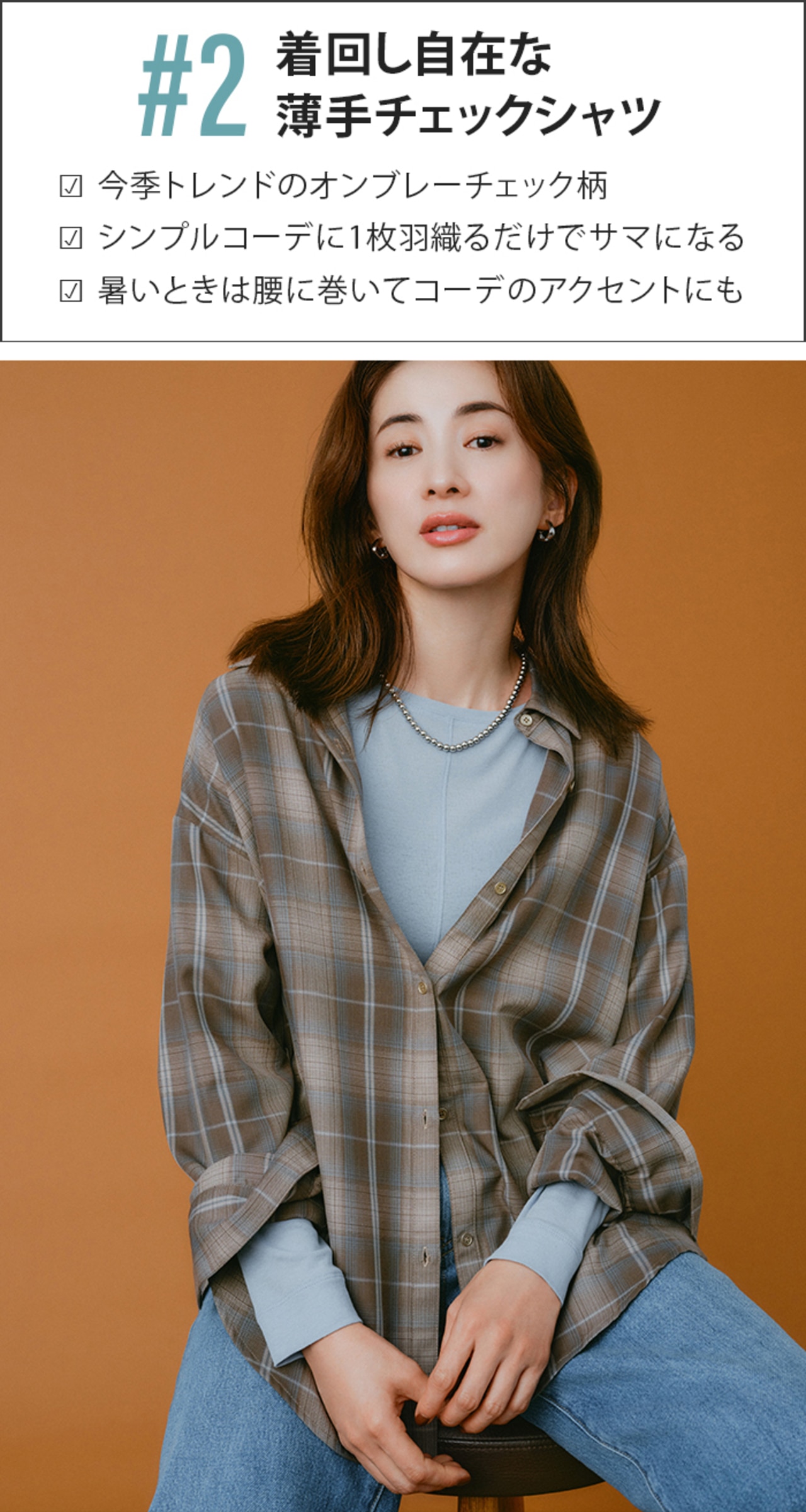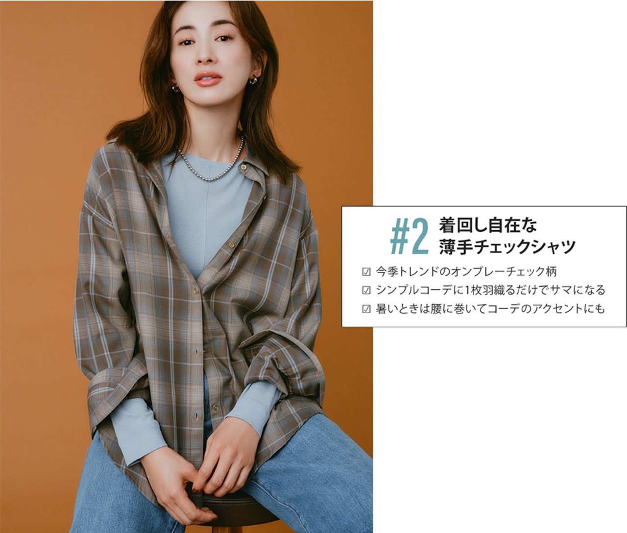 しなやかで肌触りのいい素材だから、素肌に着ても心地良い。レイヤードする時は合わせるアイテムと色をリンクさせるのが、チェック柄をオシャレに着こなすコツ。