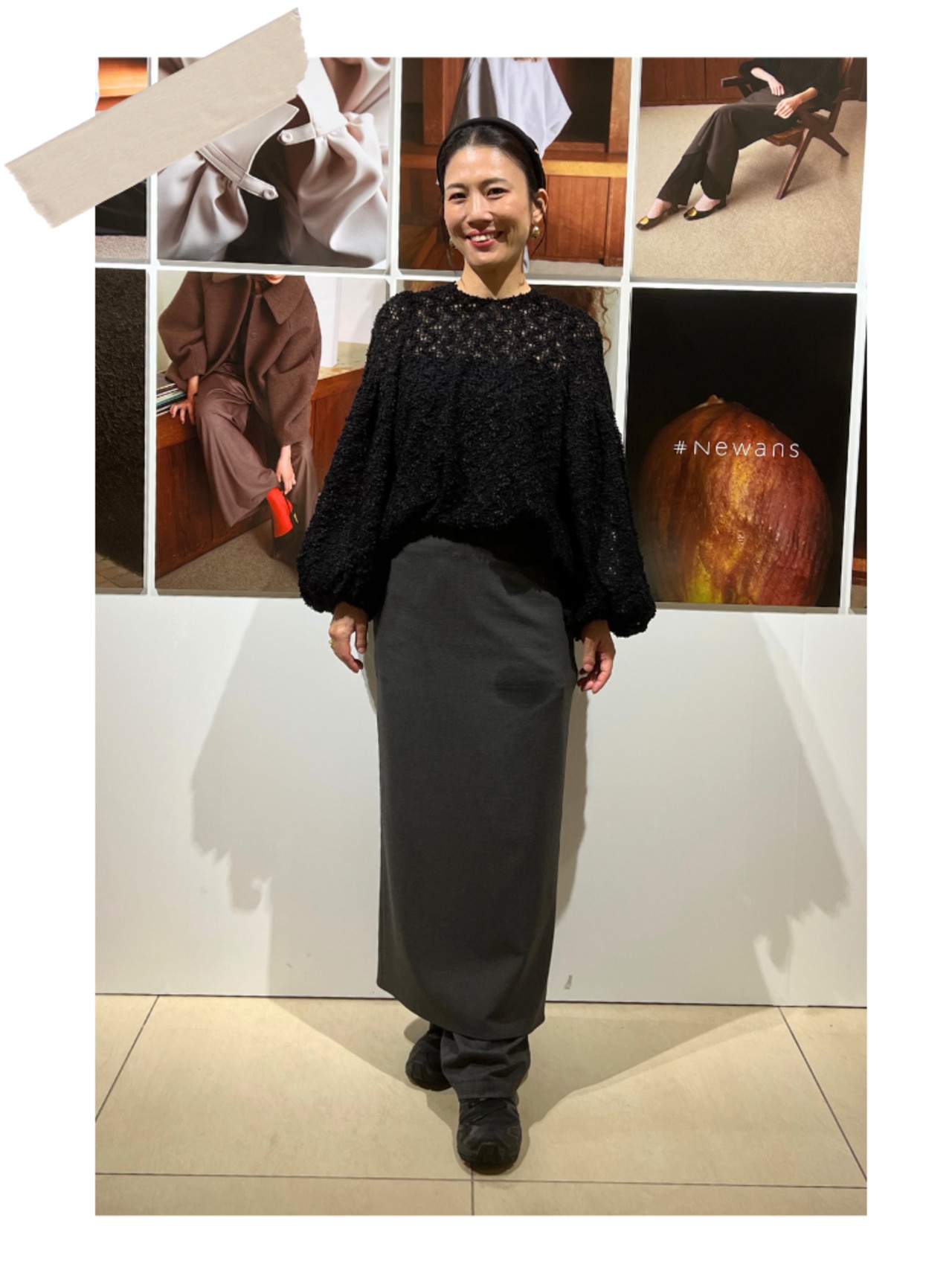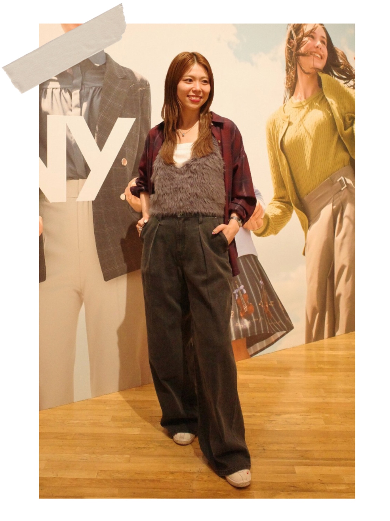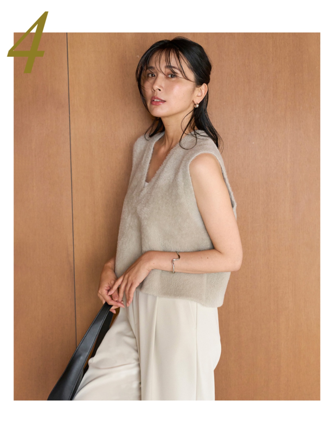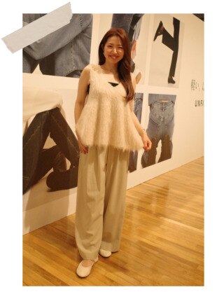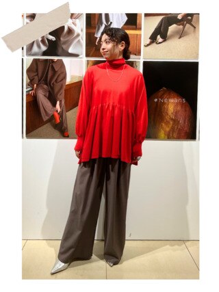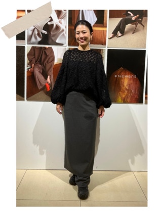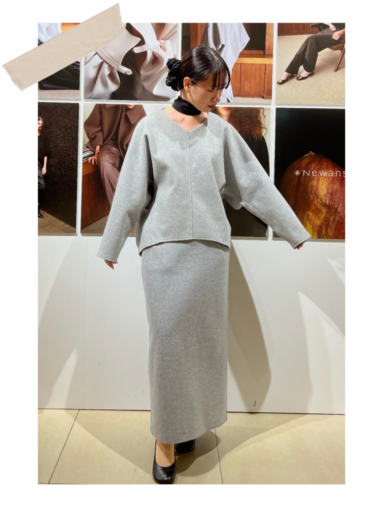 大好きなワントーンコーデに、ふわふわのシャギートップスを合わせて表情をプラス。裾のフレアと深めのVネックが程よく身体のラインをカバーしながらキレイにも見せてくれるのがポイントです。(販促担当・161cm)