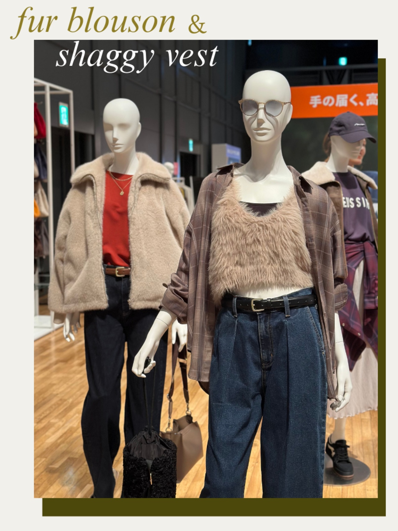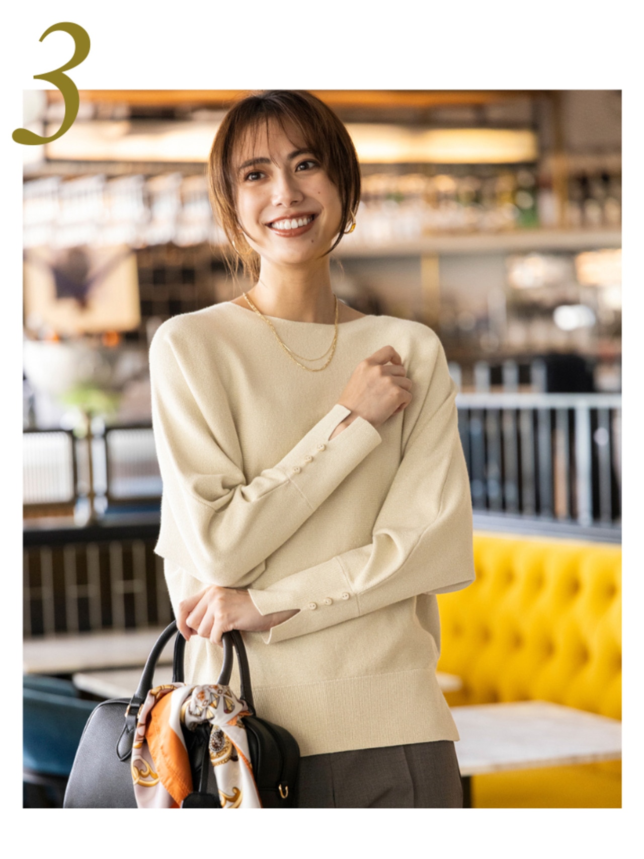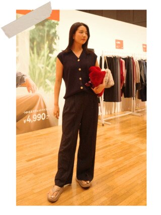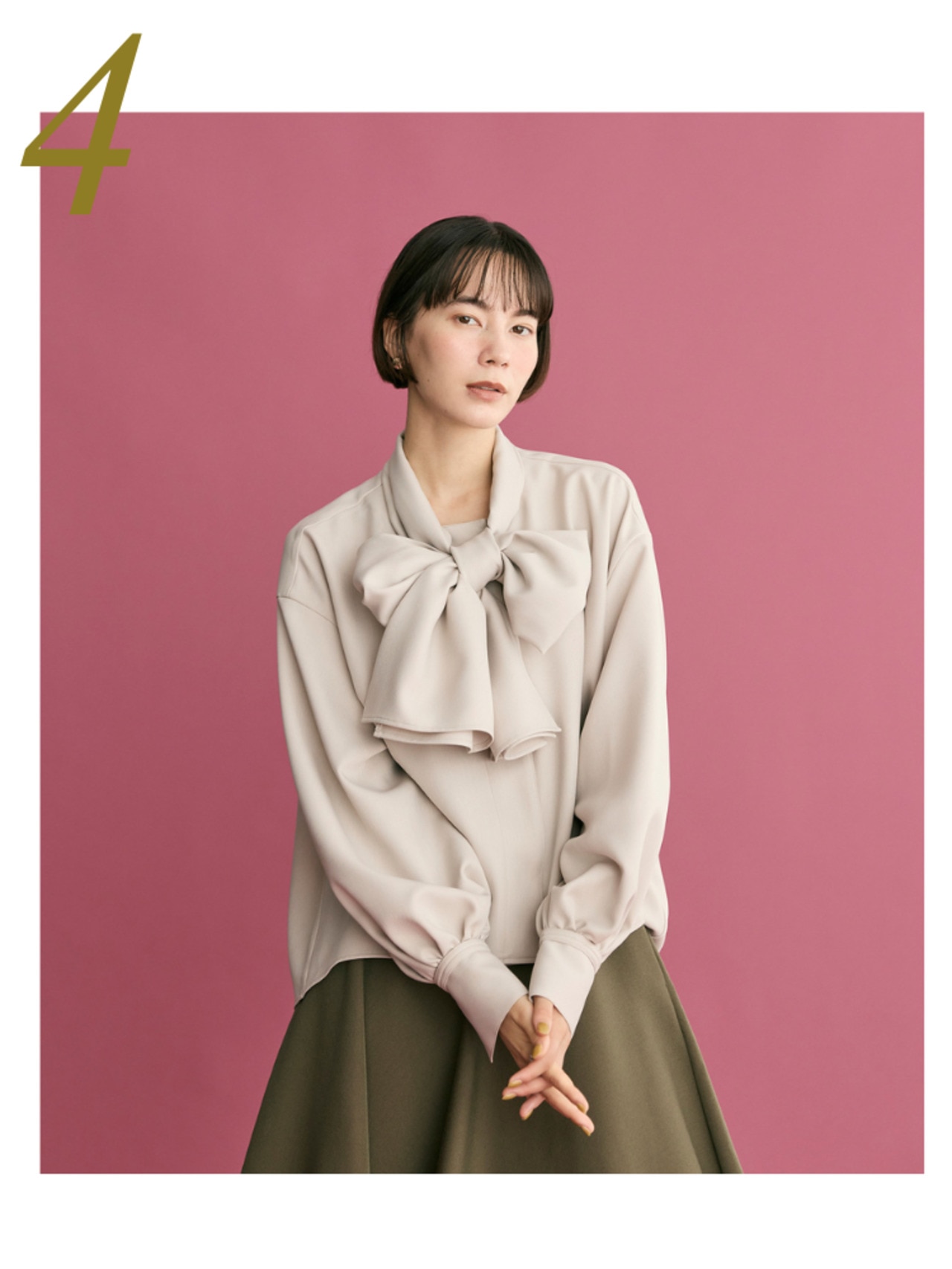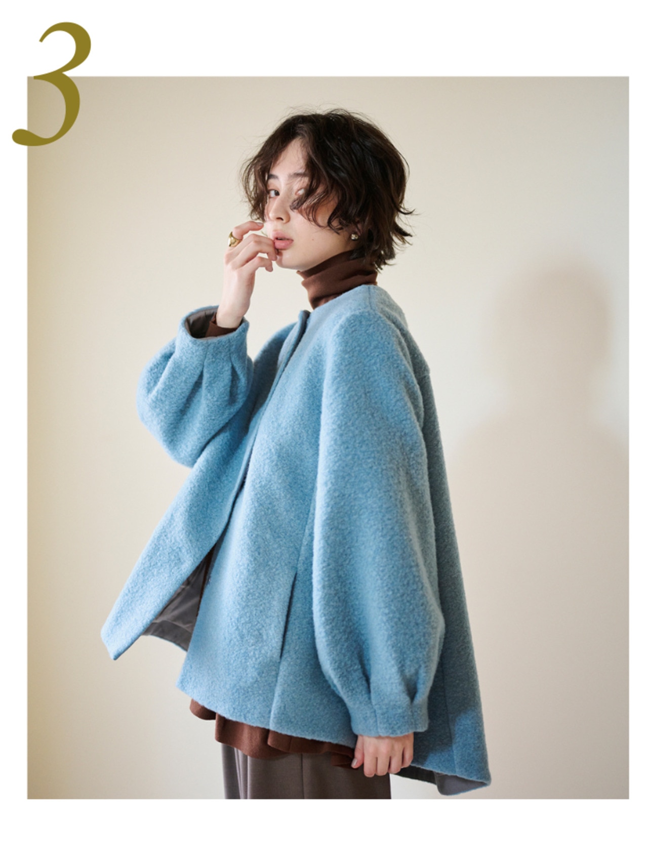 大好きなワントーンコーデに、ふわふわのシャギートップスを合わせて表情をプラス。裾のフレアと深めのVネックが程よく身体のラインをカバーしながらキレイにも見せてくれるのがポイントです。(販促担当・161cm)