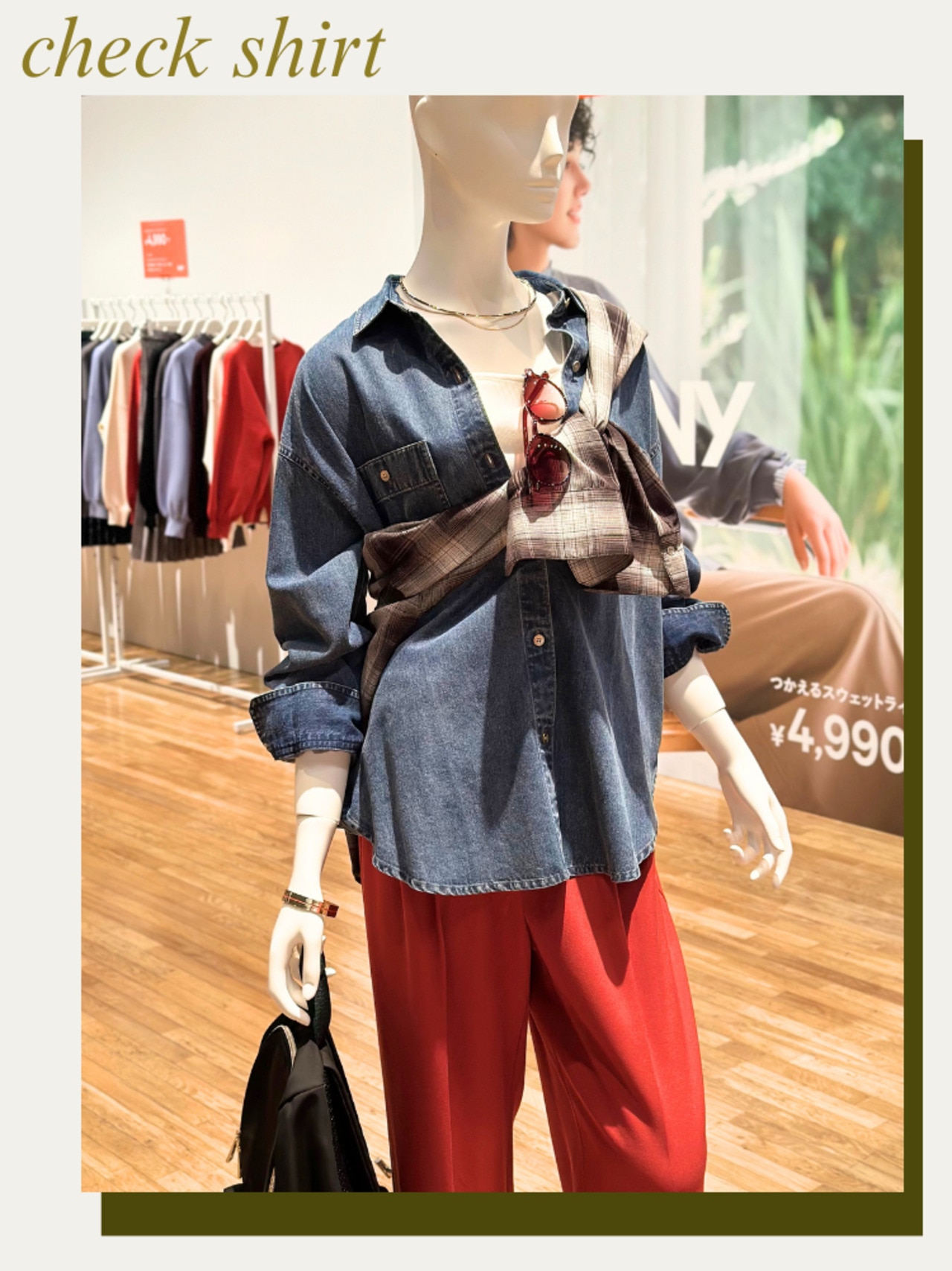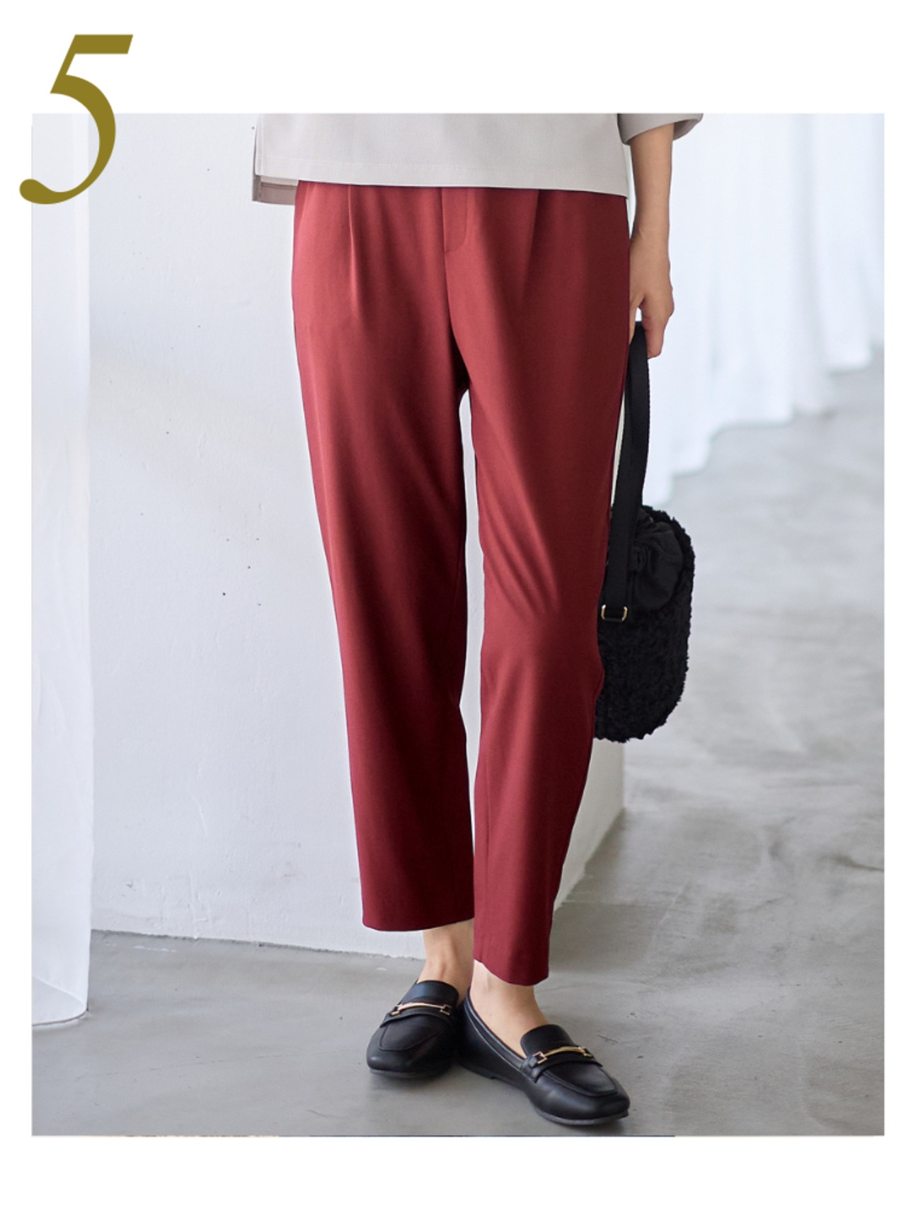 まだ暑いけど秋っぽさを取り入れたい方におすすめの、ワントーンコーデ。赤のファーバッグが、コーデのアクセントと秋らしさを添えてくれます。(販促担当・160cm)