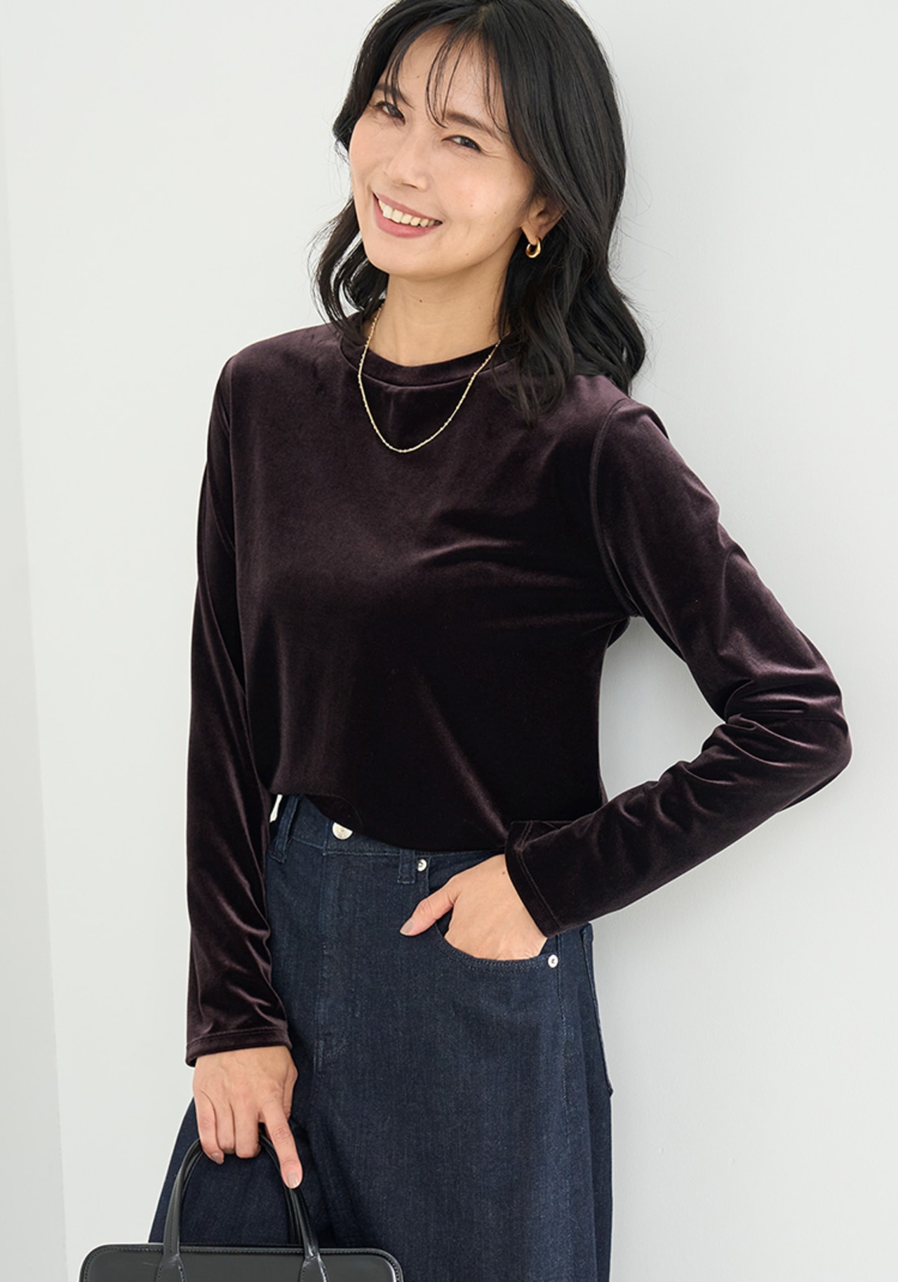 高級感のあるベロア生地と、カジュアルなロンTデザインのミスマッチがこなれ感の秘訣。洒落見えが難しいワンツーコーデも、ベロアTなら簡単に最旬スタイルに。