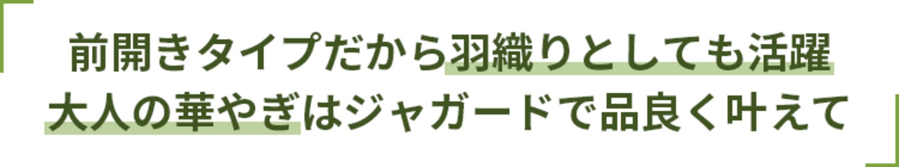 華やかでシーズンレスに使えるジャガード素材。襟と前立て部分は無地で切り替えられているから、すっきりと洗練された印象に仕上げてくれる。