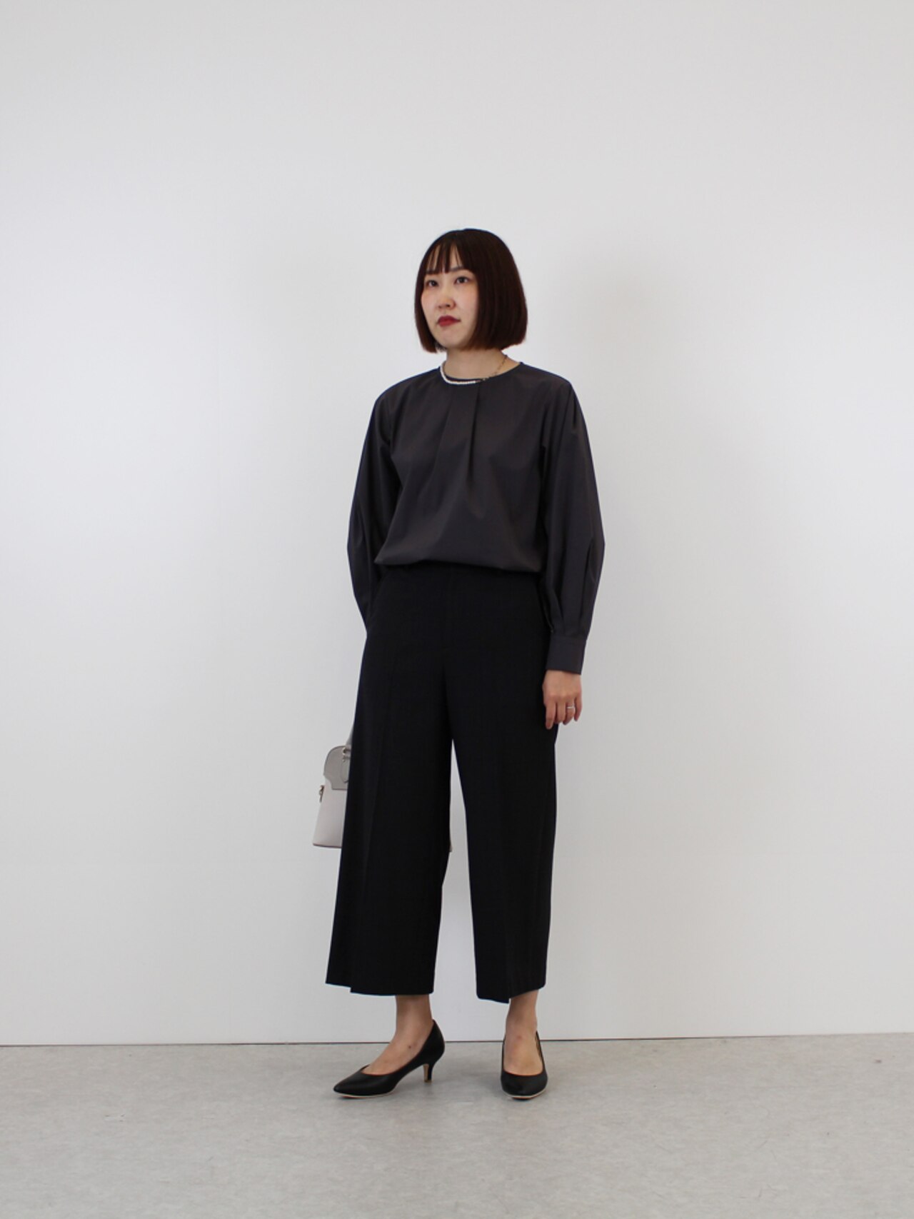 保護者会をイメージ。ワントーンにヒールを合わせてグッとキレイめに。