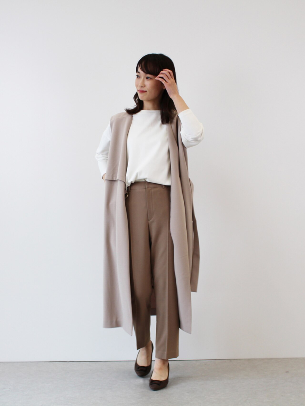 リラックス感のあるジレを合わせても常にキレイめをキープできる。