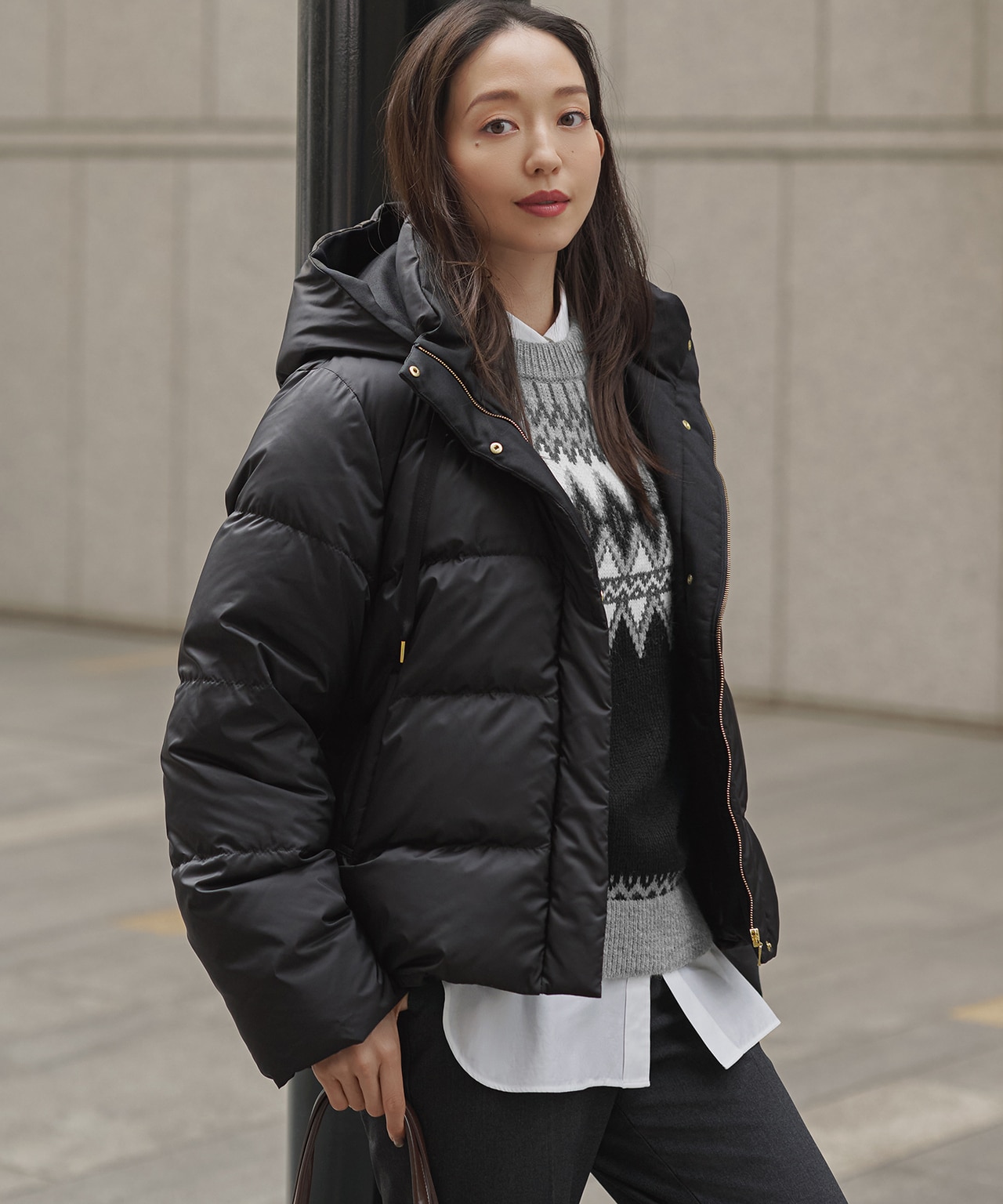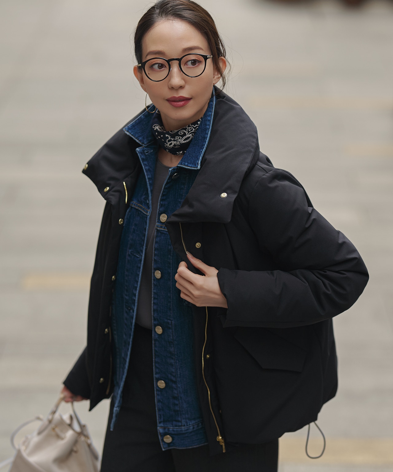 ボリューム襟が可愛いショート丈ダウン。前を開けても閉めても決まりの良い技ありデザインと、他にはない洗練シルエットが人気の秘密。