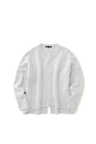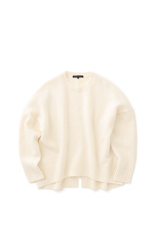 「ニットは秋冬を代表するアイテムですが、ニット特有のチクチクがとても苦手。だから肌触りはニット選びで1番大事にするポイントなんです。このニットの糸は、選び抜かれた「19.5マイクロン」という細い原毛を使用していて、さらにカシミヤも5%入っているから肌に触れてもチクチクしにくく、ストレス無く着られます。カジュアルもキレイめにも、そしてシーンを選ばず着て頂くために、ざっくり感を出しすぎず編目を細かく詰めて滑らかな表面感に仕上げてもらいました。だからこそ、キチンと感も出せるニットになっています。」