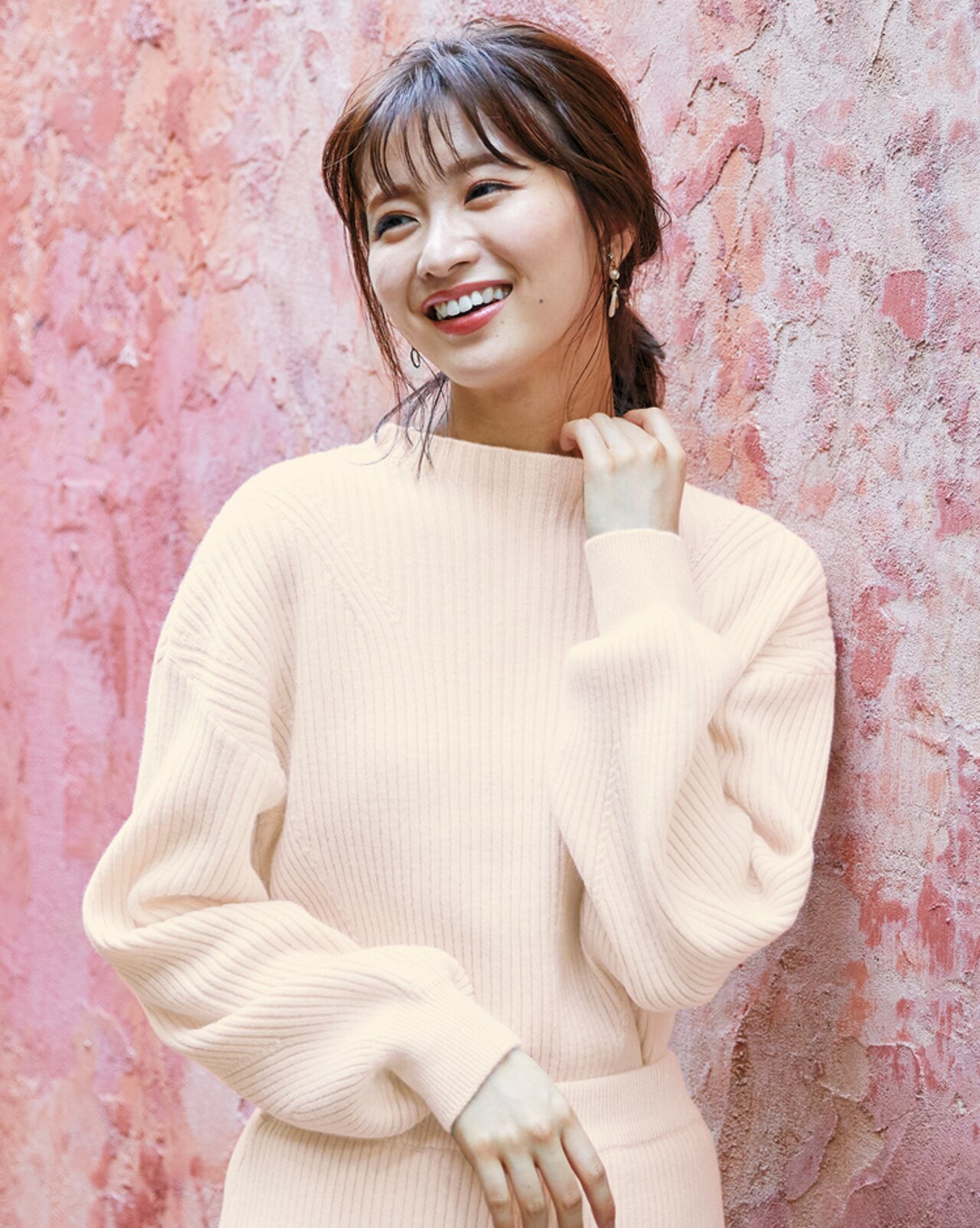 ・ハイネックとニュアンスカラーがシルエットを中和し、甘くなりすぎず上品な雰囲気に。