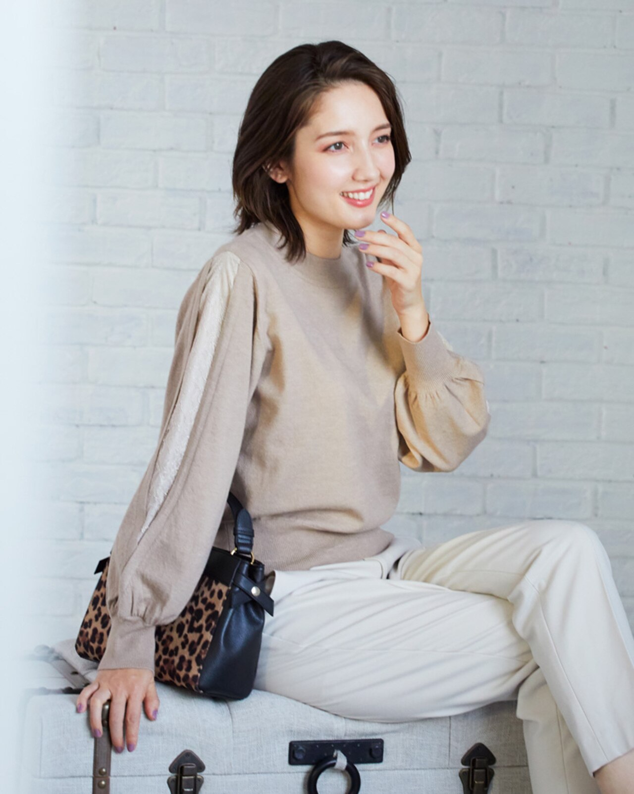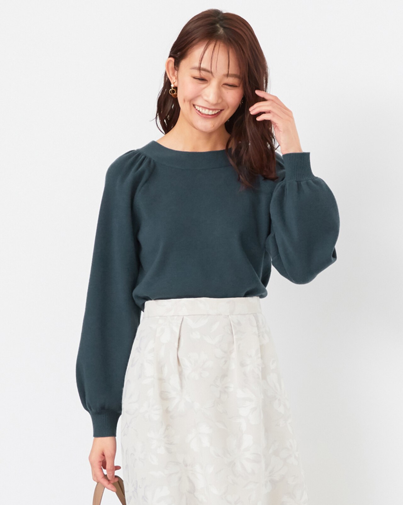 ・ボリューム袖なのにスッキリして見えるのは、肘下から手首までの長めのリブが、袖先に重たい印象を与えないから。