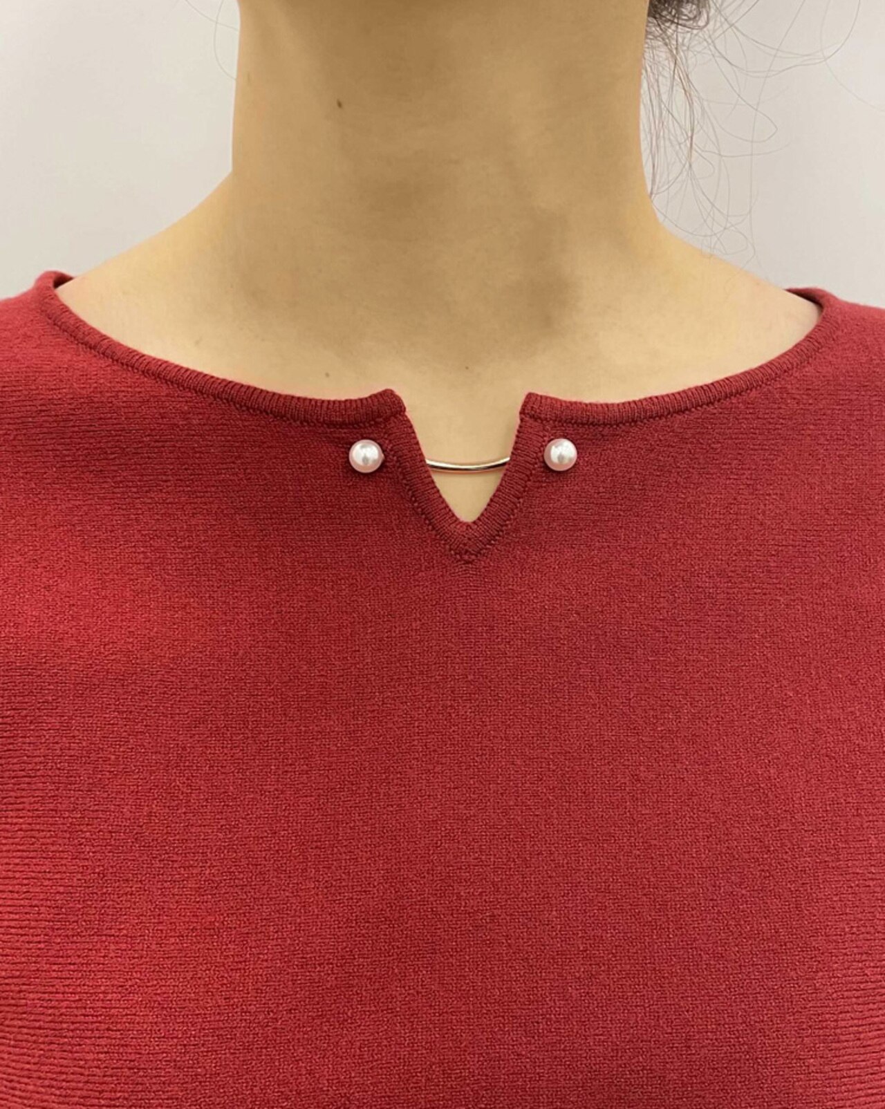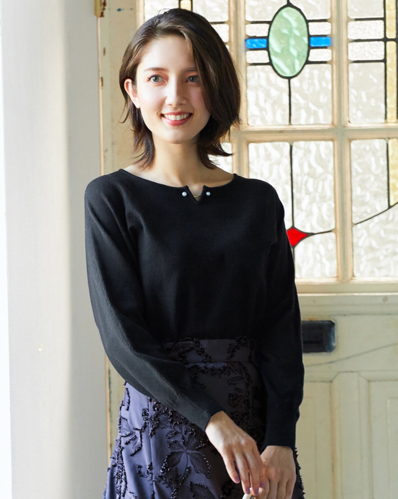 ・胸元に付いたパールと、冬らしいシックな色味のニットが掛け合わさり、リッチな雰囲気に。
