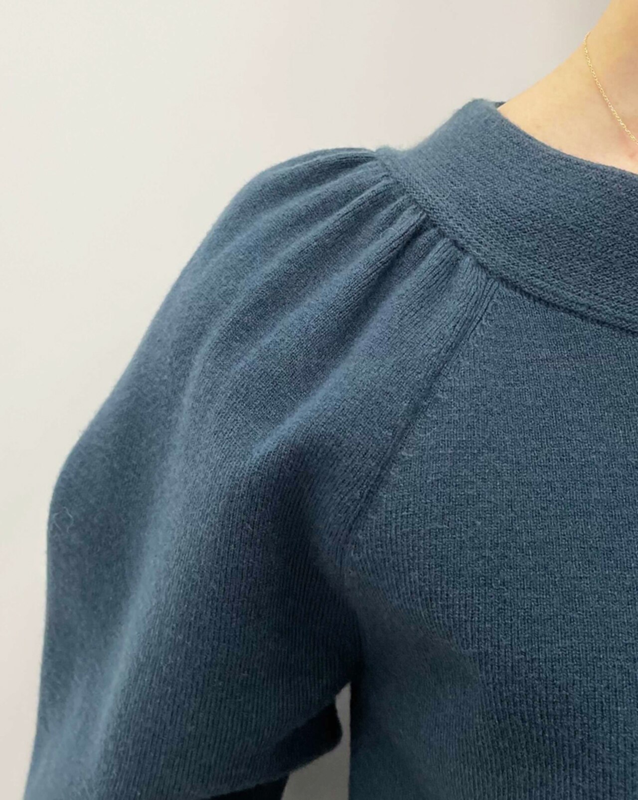・肩に入ったギャザーが効いて、自然な膨らみの袖に。一見シンプルなニットながらも、フェミニンな印象を与えてくれる。