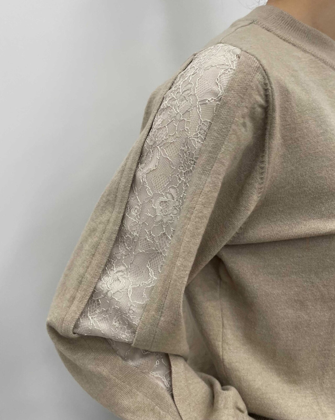 ・袖に入ったシアーなレースデザインは、1枚で着映えする主役級ニット。ニット素材だからこそ出来た、カジュアルとエレガントのMIXアイテム。