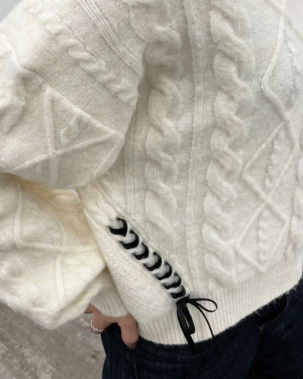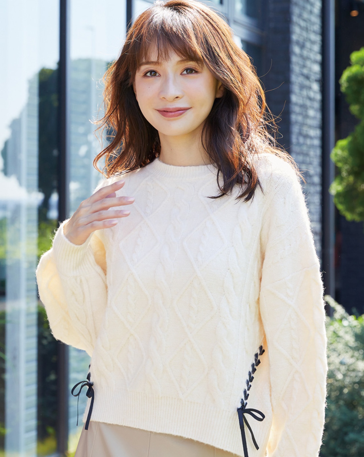 ・トレンドの甘カジュアルニット。ウエスト周りに入った編み込みリボンがポイントになって大人フェミニンな印象に。