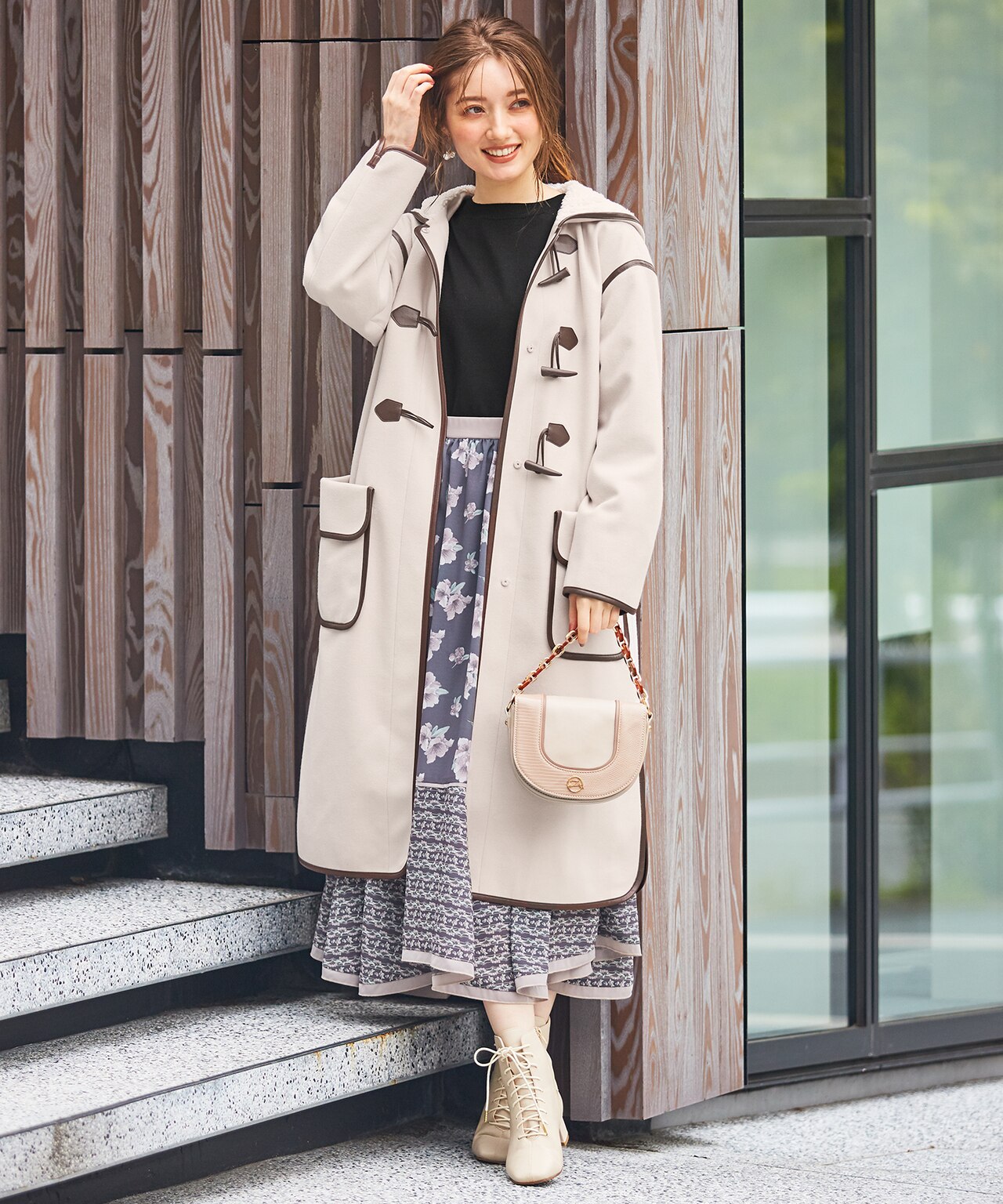 ・ トレンドの合皮トリミングを施したレディな印象のダッフルコート