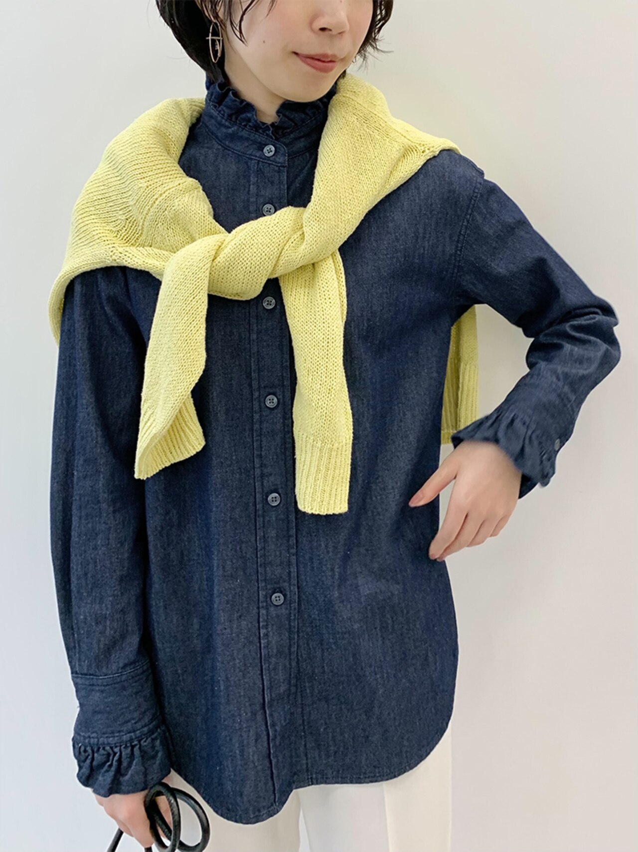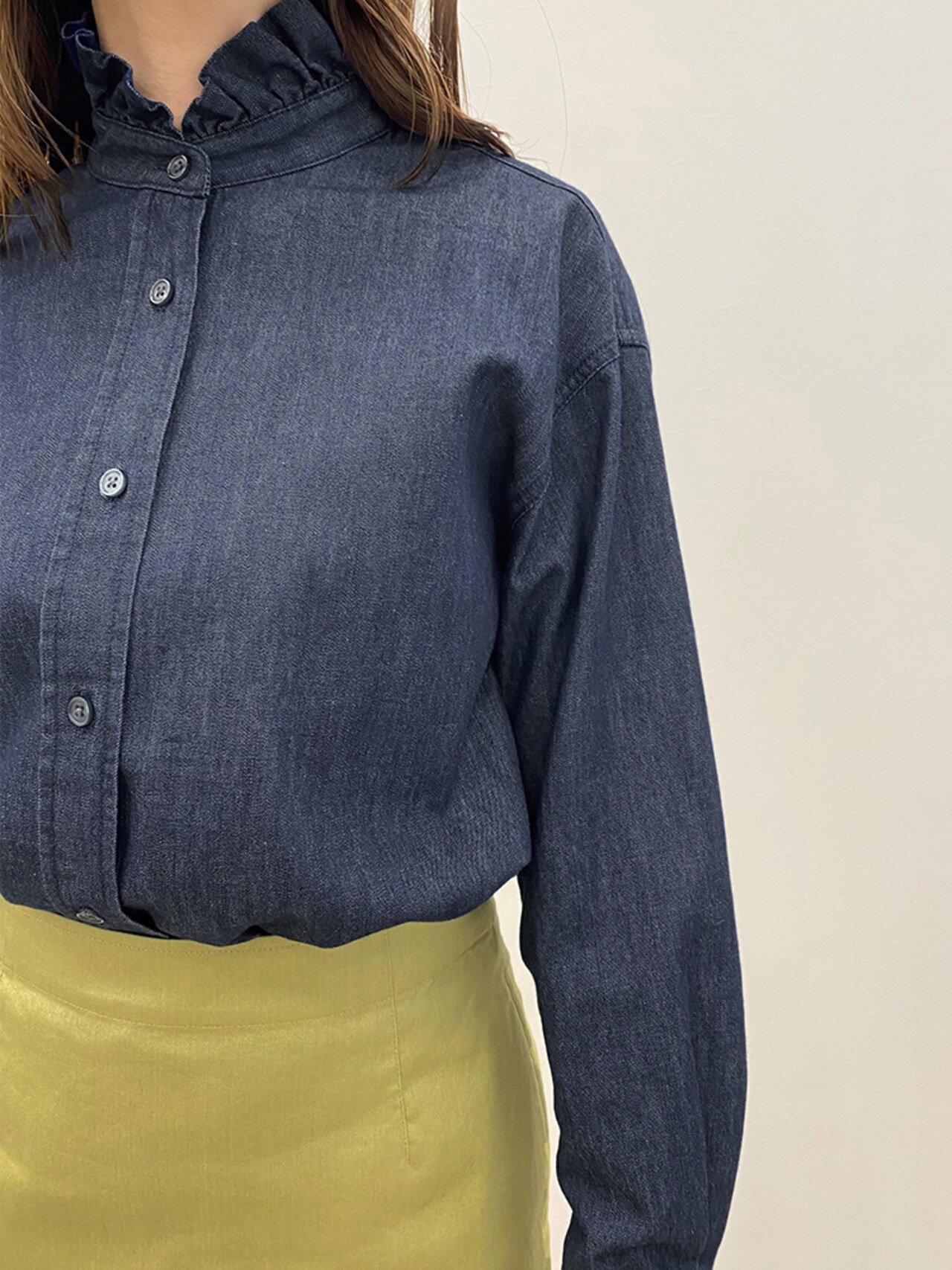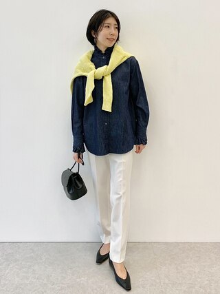 袖口と襟ぐりにフリルをあしらったフェミニンブラウスも、ダンガリーならドレッシーすぎない印象に。今年らしさを個性的に表現できる主役級ブラウス。
