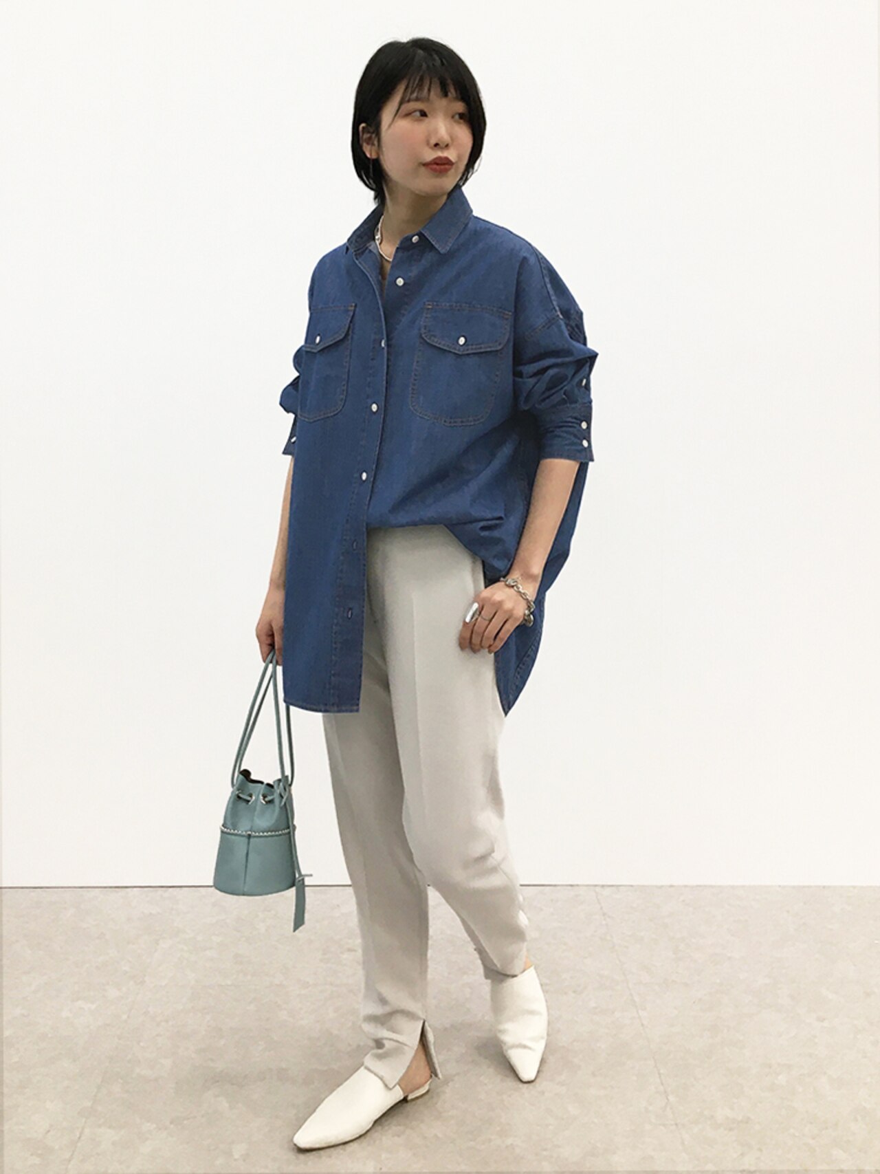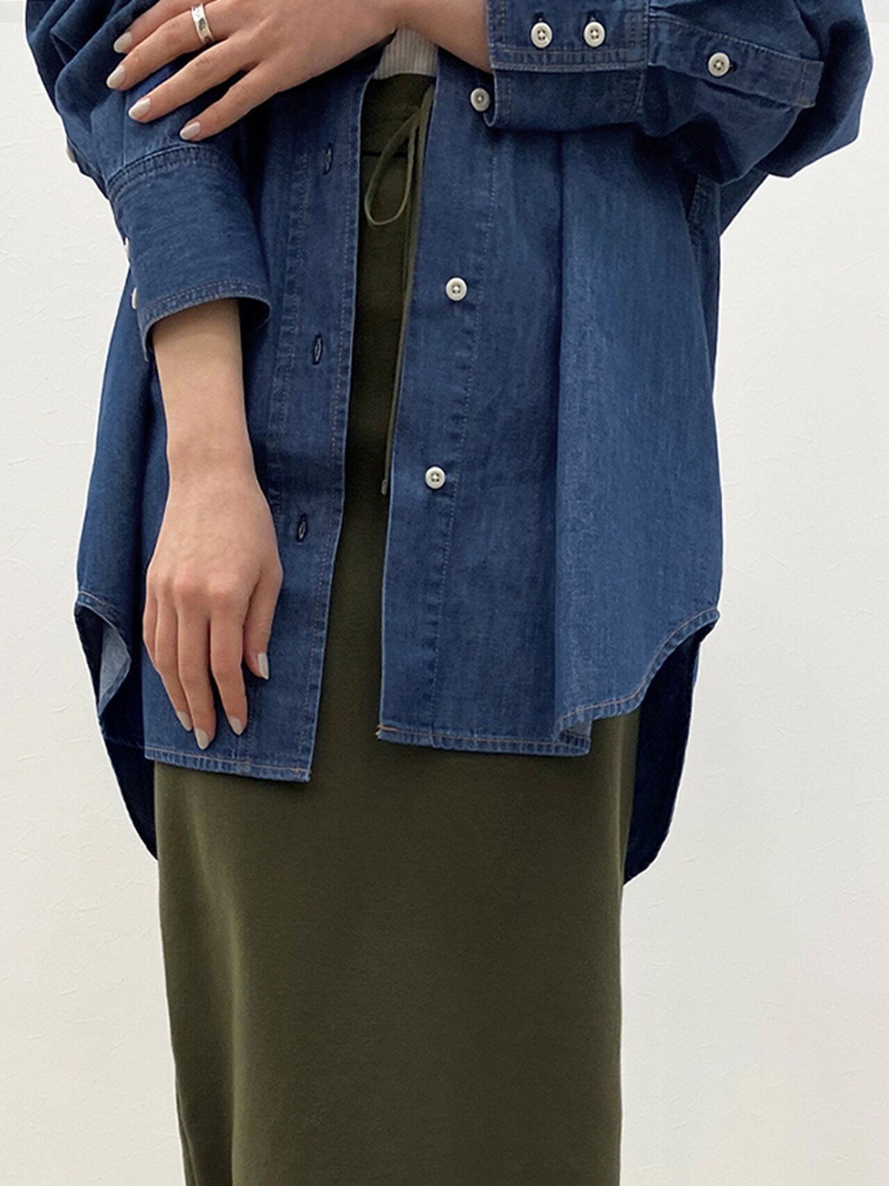 ポケットや太めの前立てでフロントにポイントをつけて、「間延びしないオーバーサイズ」を狙った一枚。柔らかなダンガリーの軽い着心地は、羽織りとしても◎。