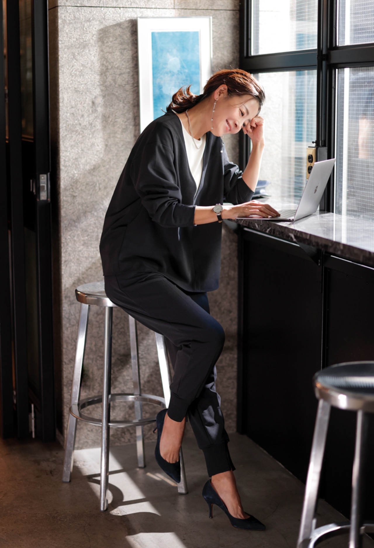 シワになりにくい素材だから、長時間座るオフィスシーンでも大活躍。