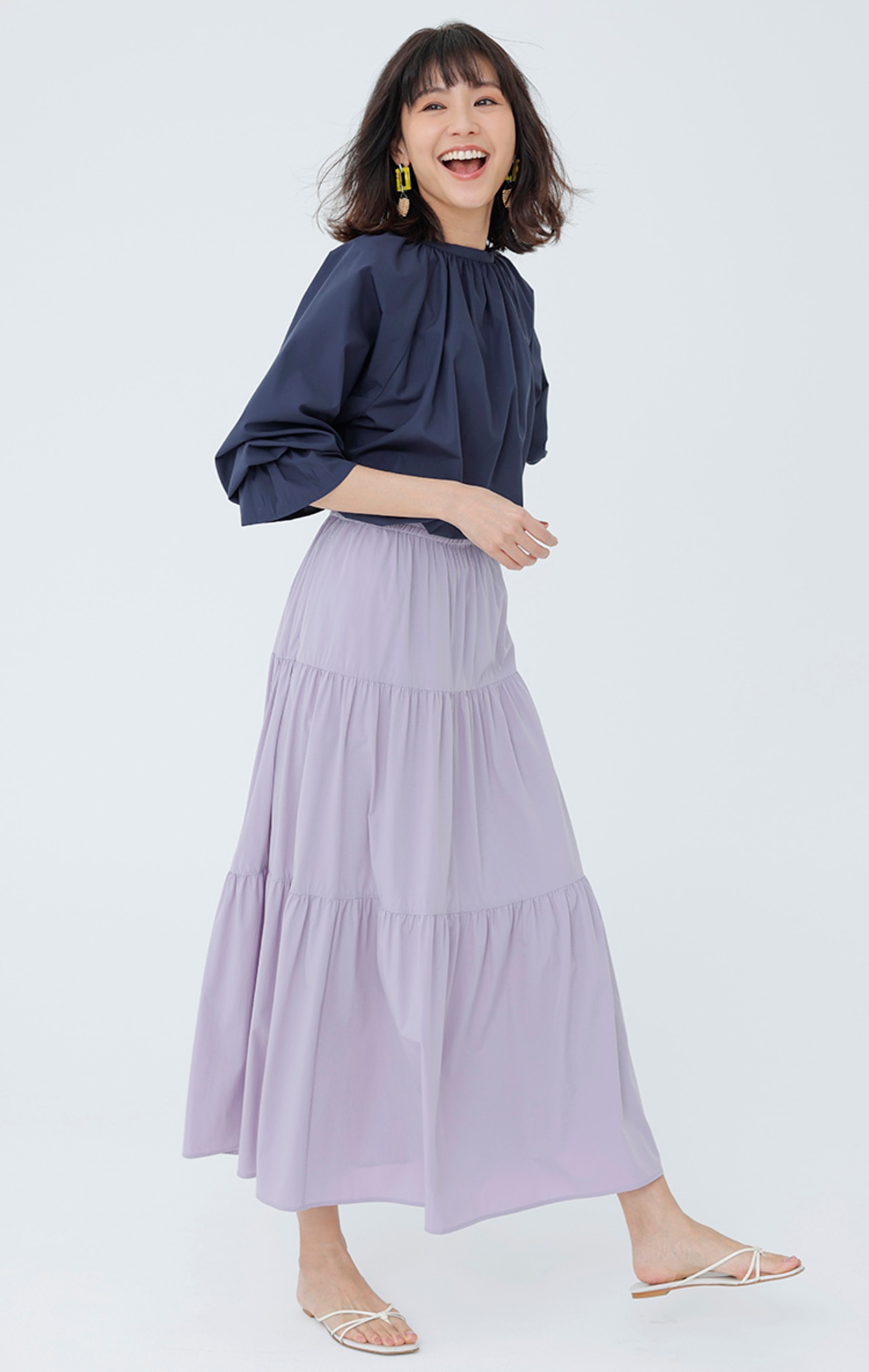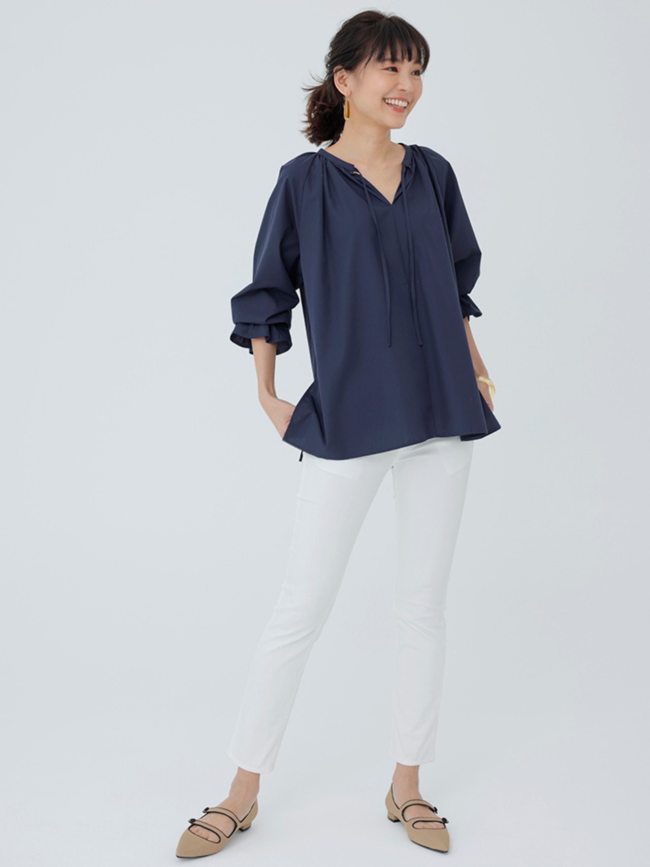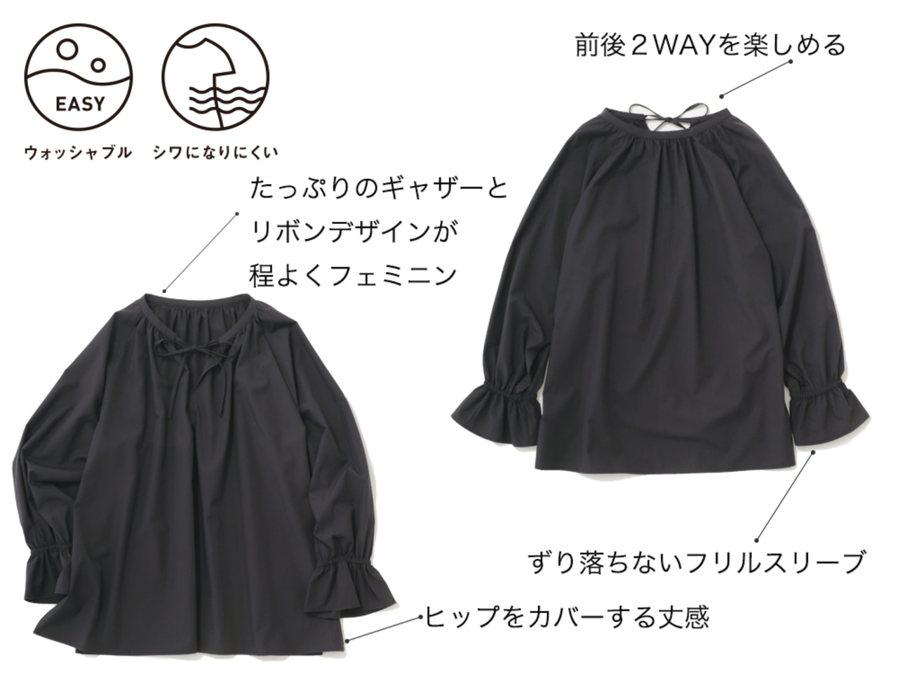 フリルスリーブを取り入れた着映えが叶うブラウスは前後で着られる2 WAY。